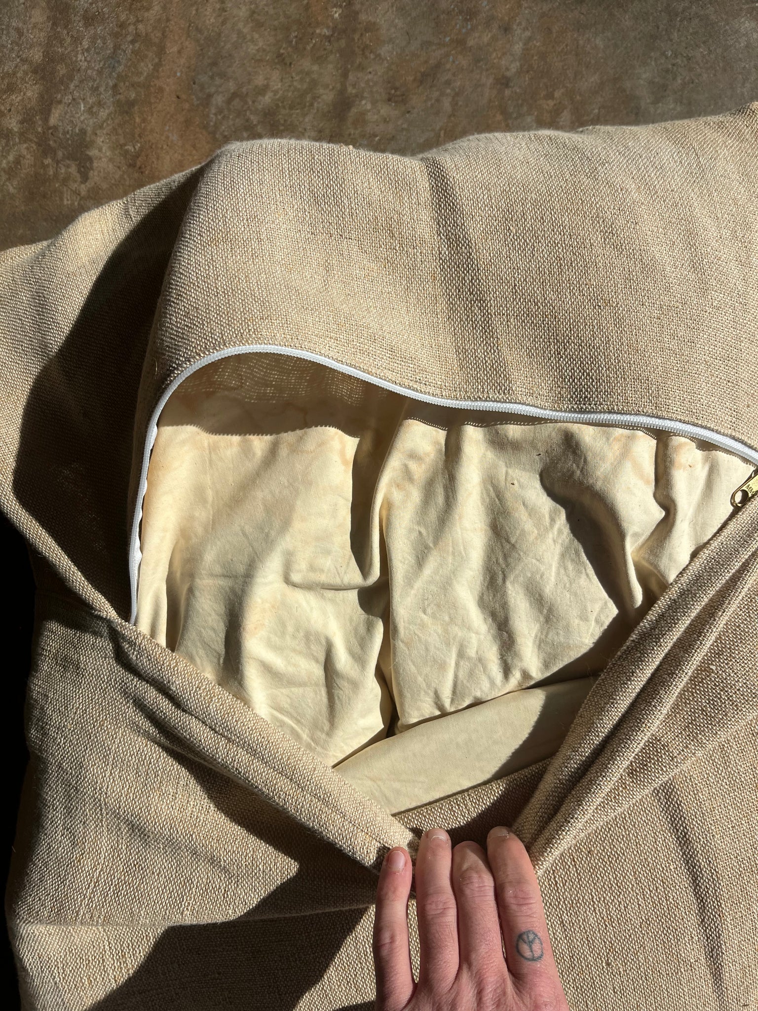 Condition: Very Good Usable condition, no holes or stains, the zipper works great, it comes with a heavy feather insert hence the pricier shipping because it is large and heavy :)