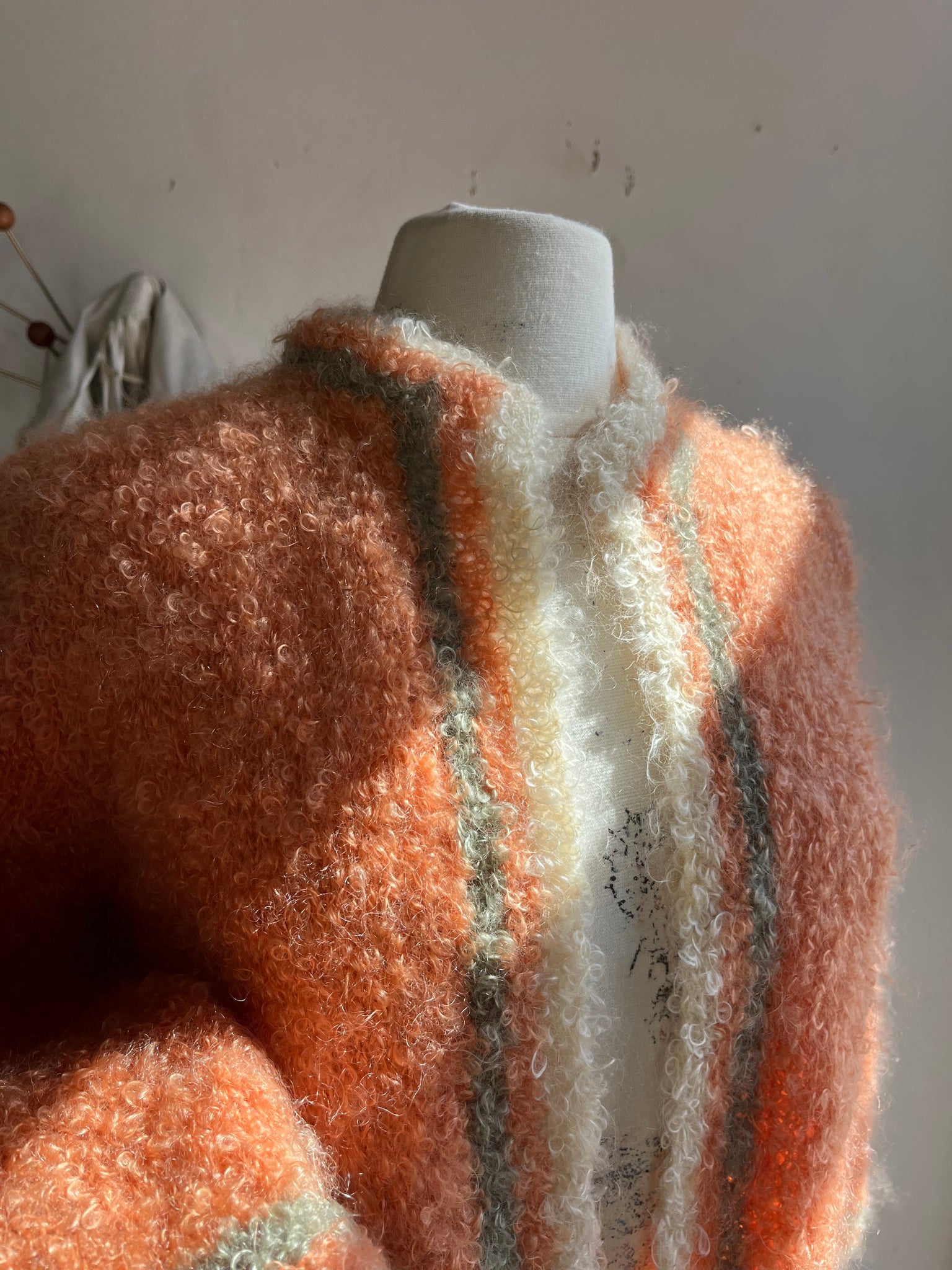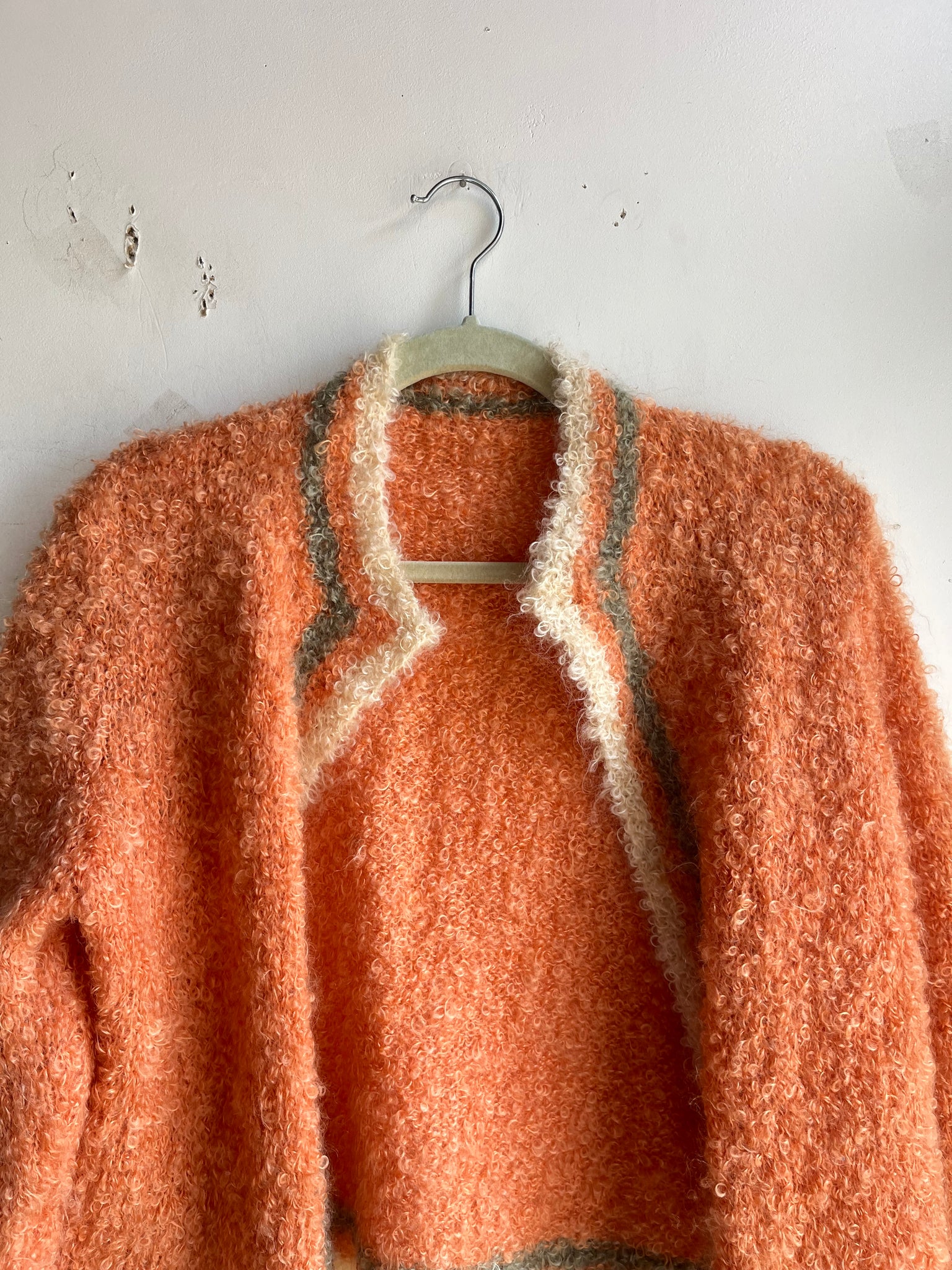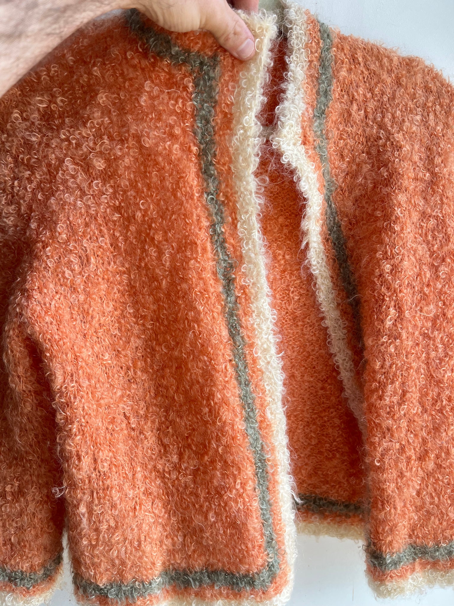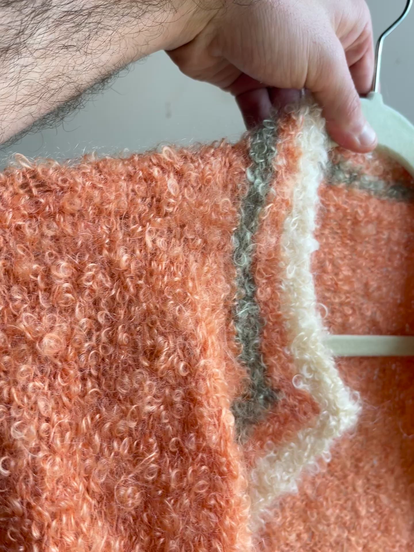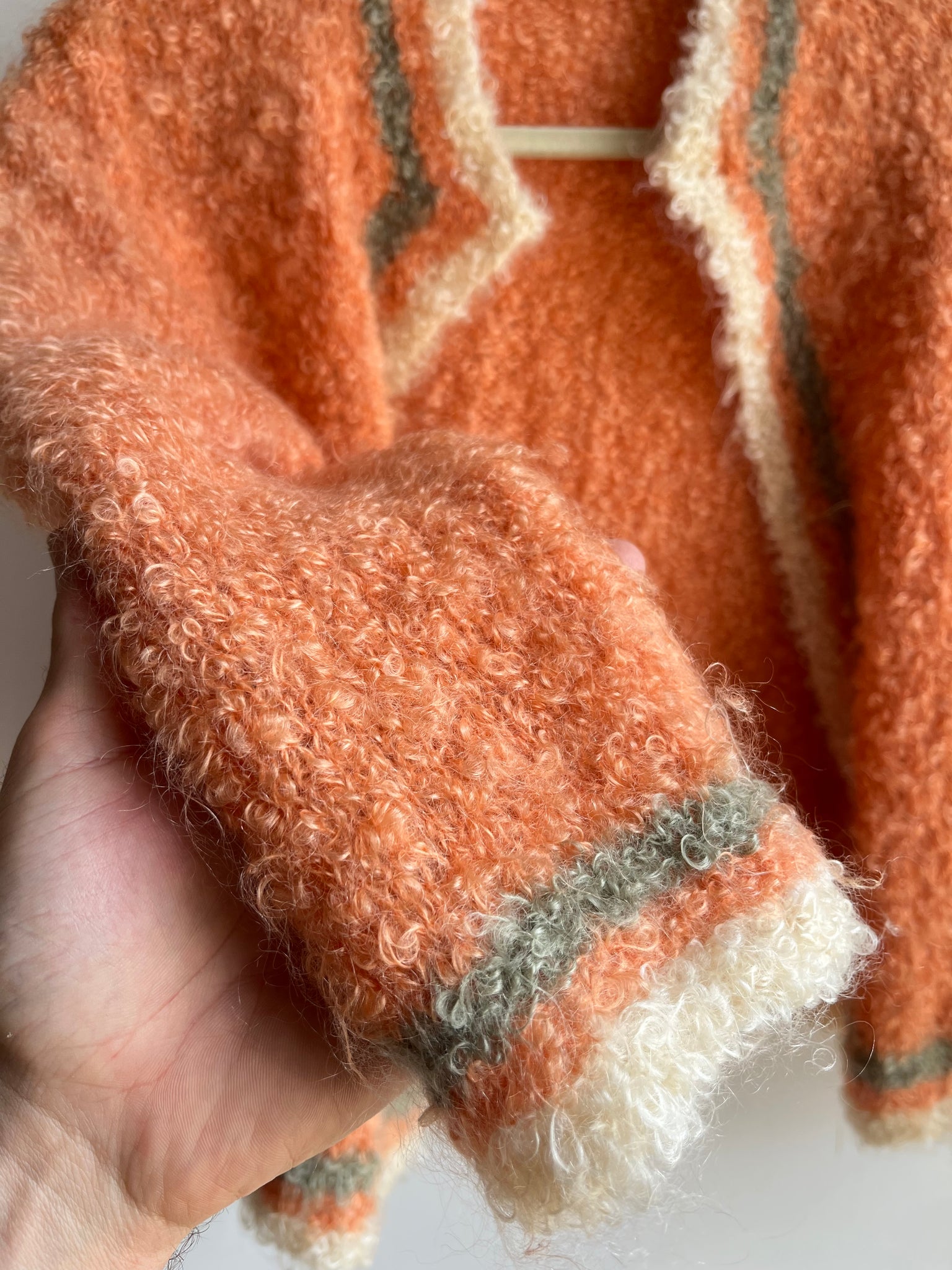 Fabric: no tags, but its a curly knit wool and its very fuzzy, I would say its a wool/mohair blend