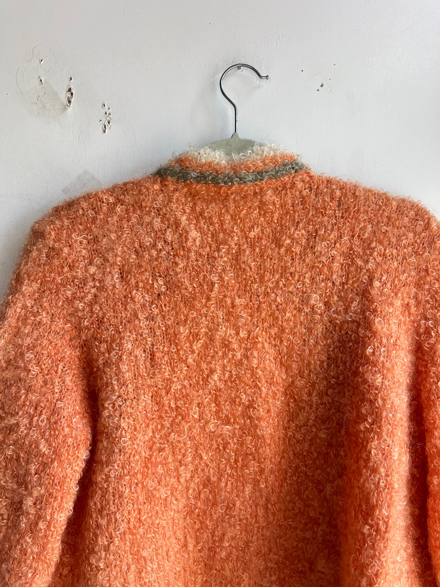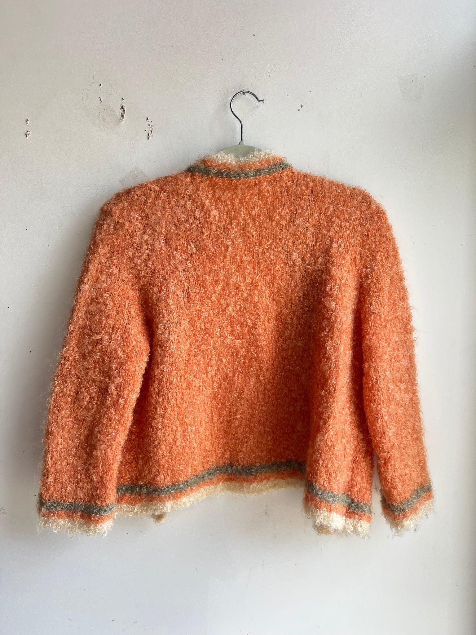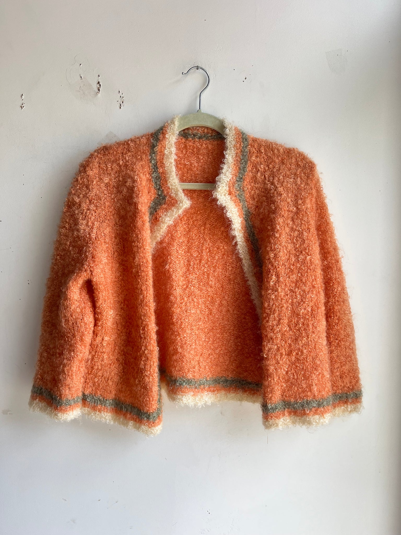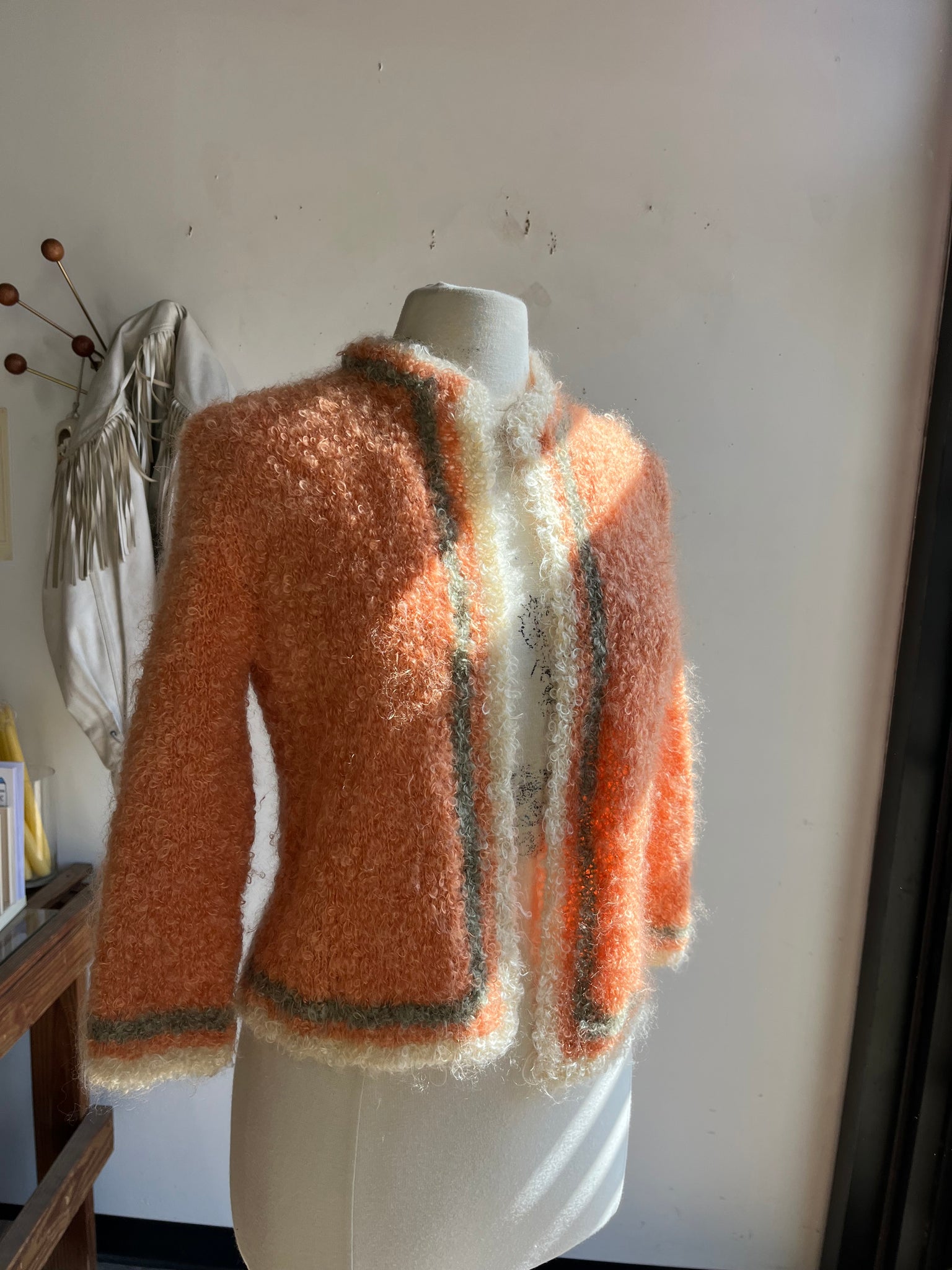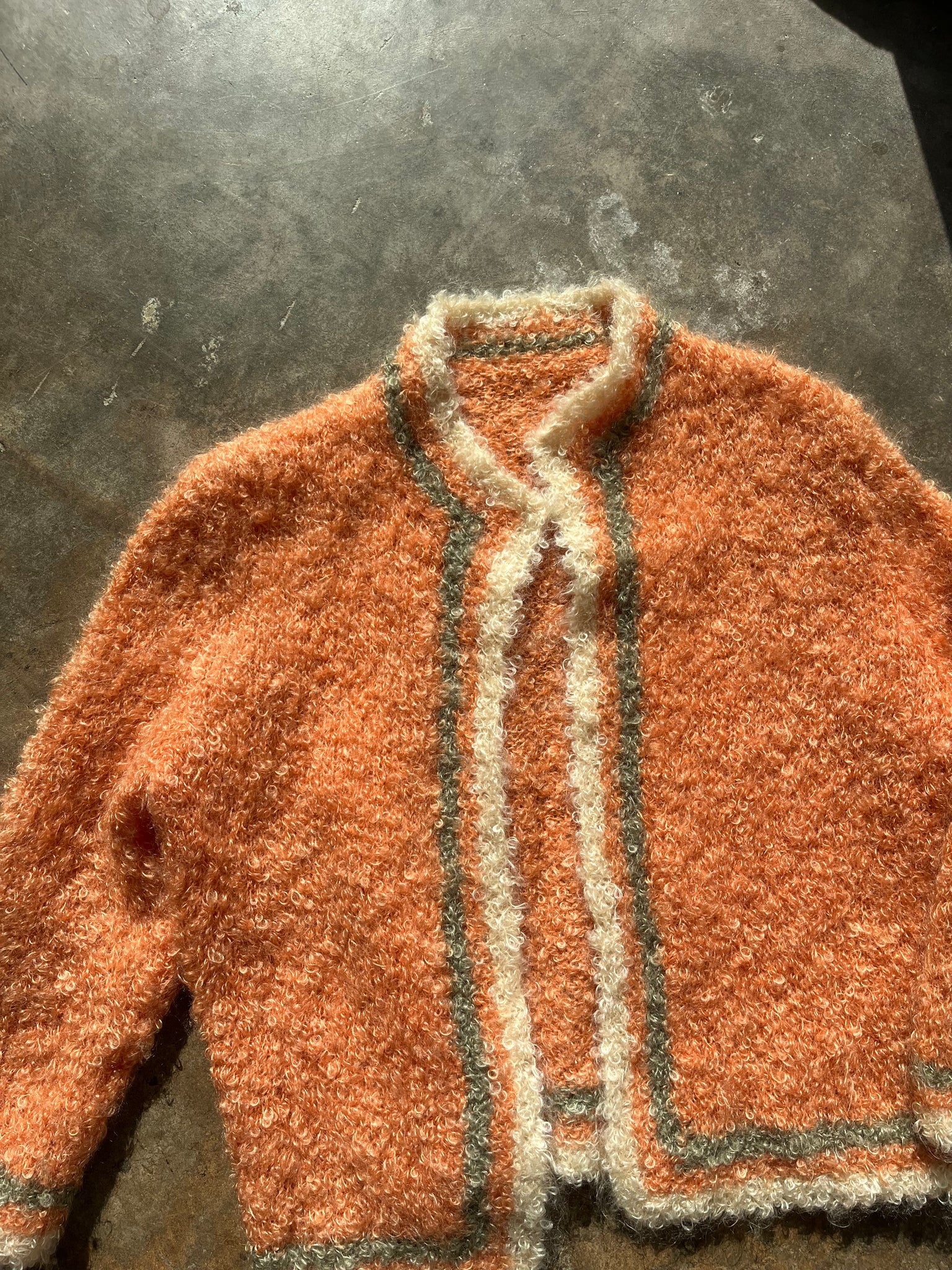Fabric: no tags, but its a curly knit wool and its very fuzzy, I would say its a wool/mohair blend