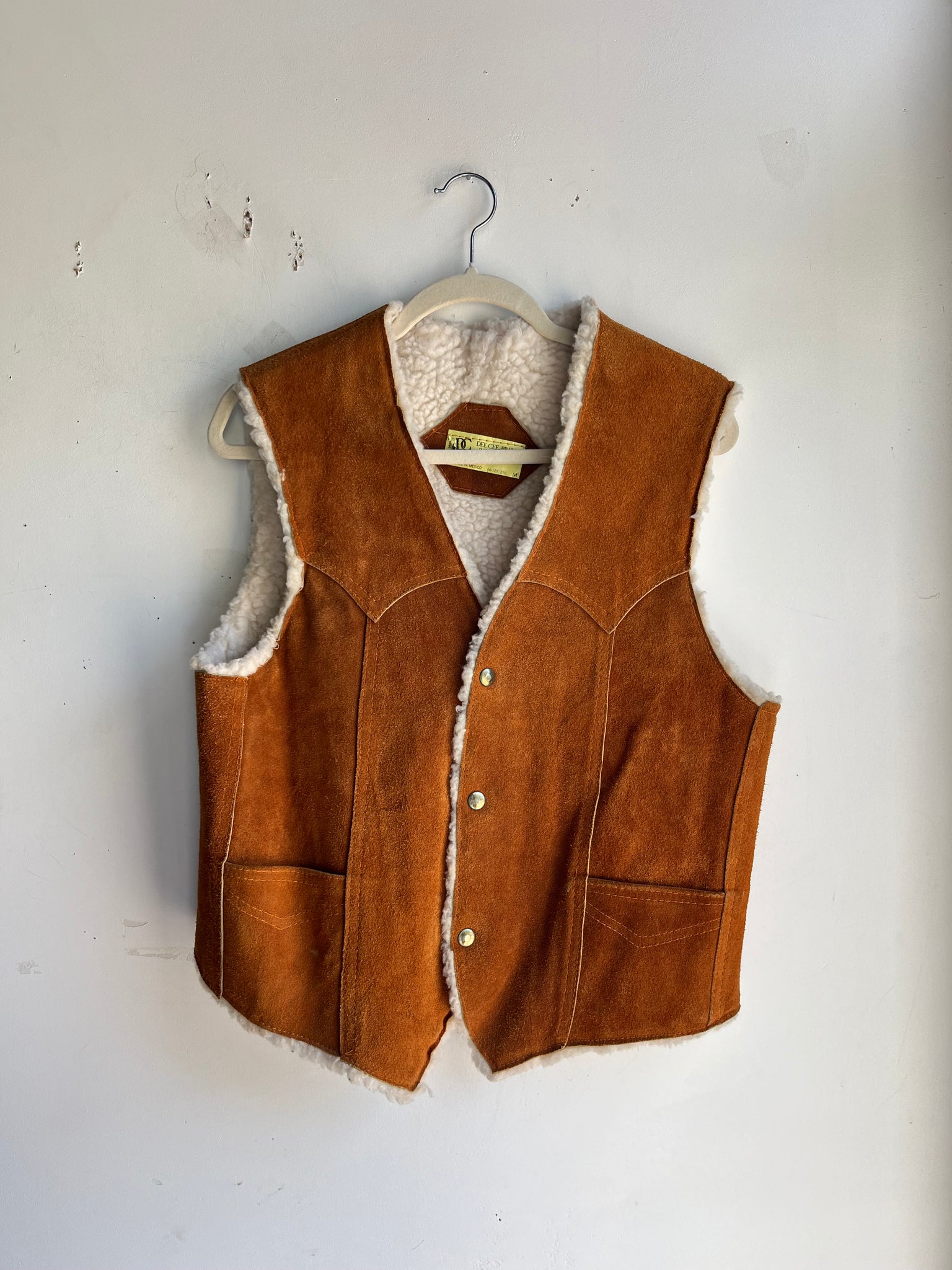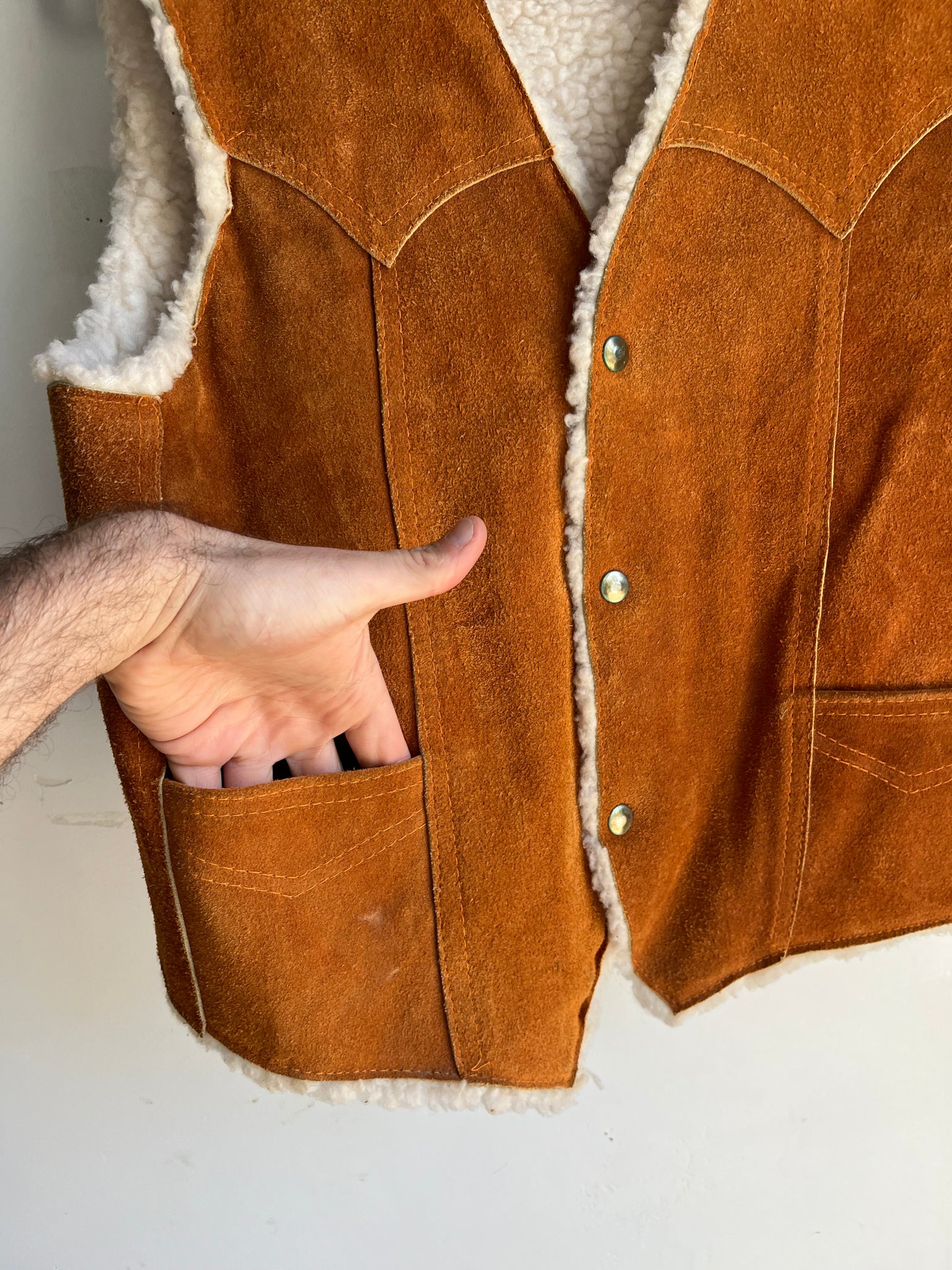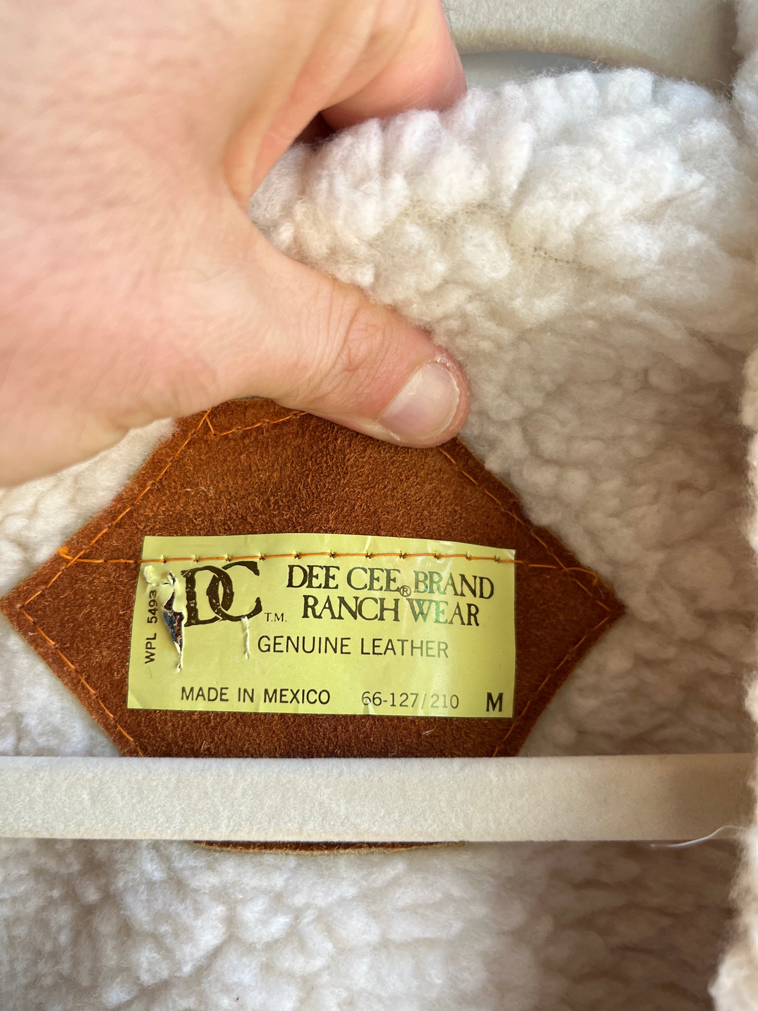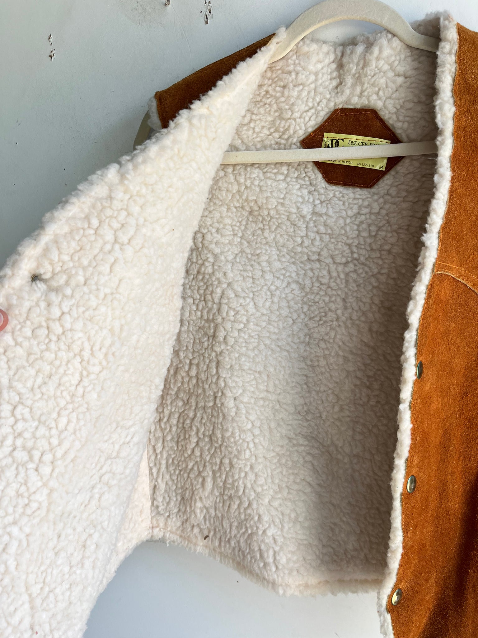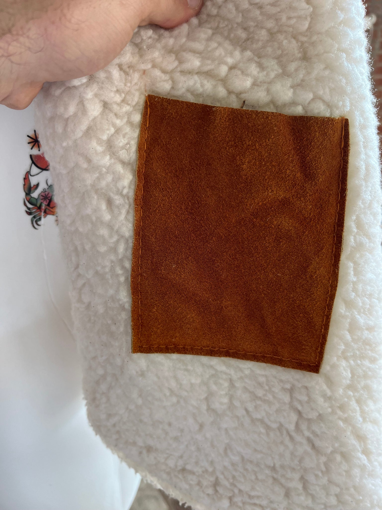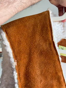 Fabric: marked Genuine Leather outer, the sherpa lining isn't marked, but I would say its a faux sherpa