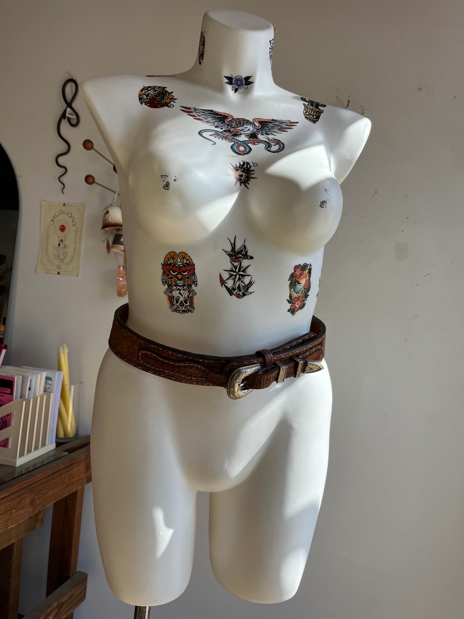 Fabric: The Belt isn't marked, but its definitely leather with metal accents