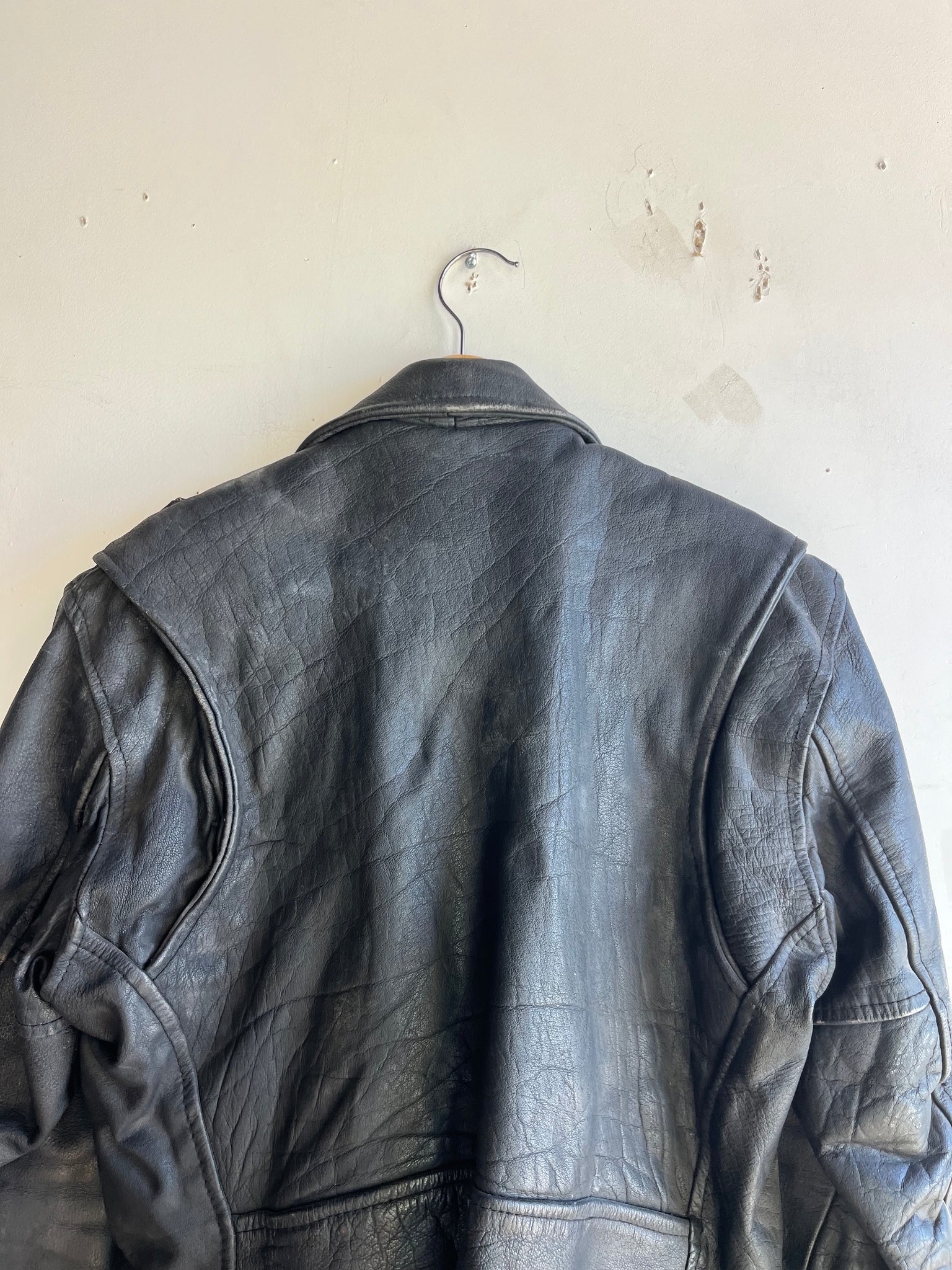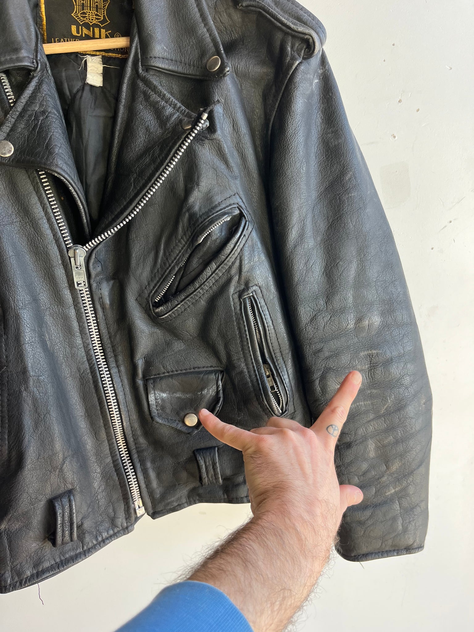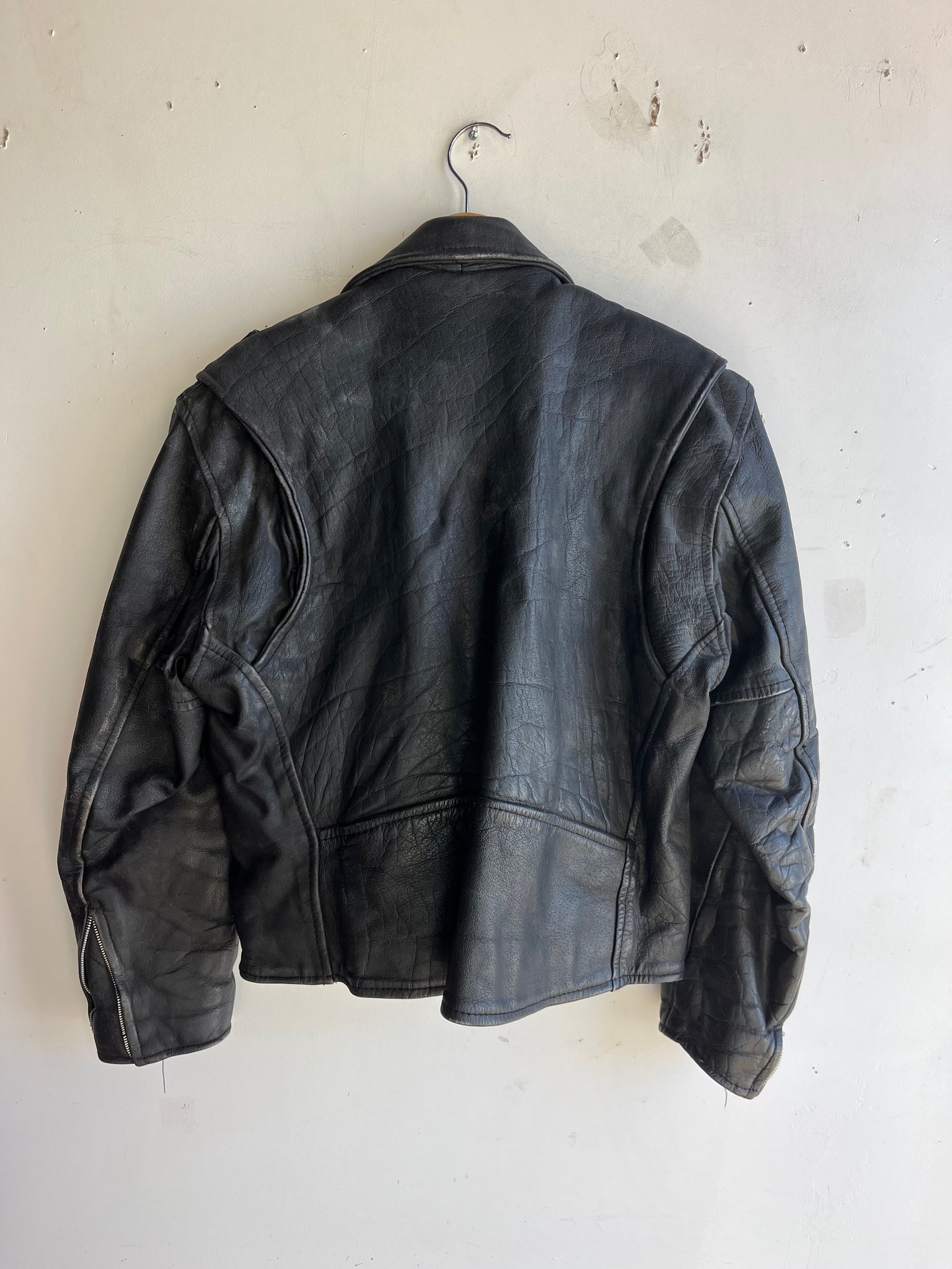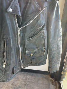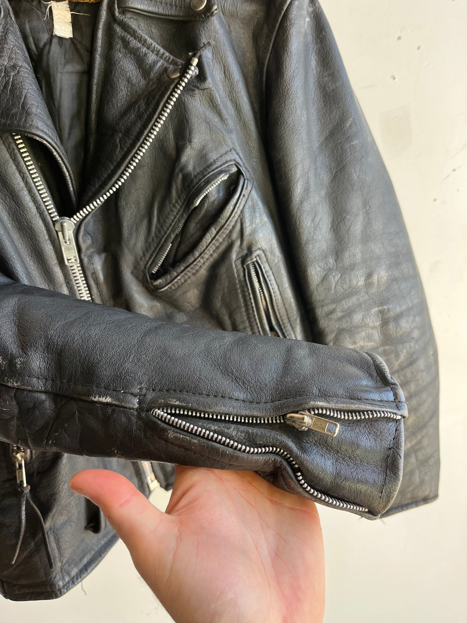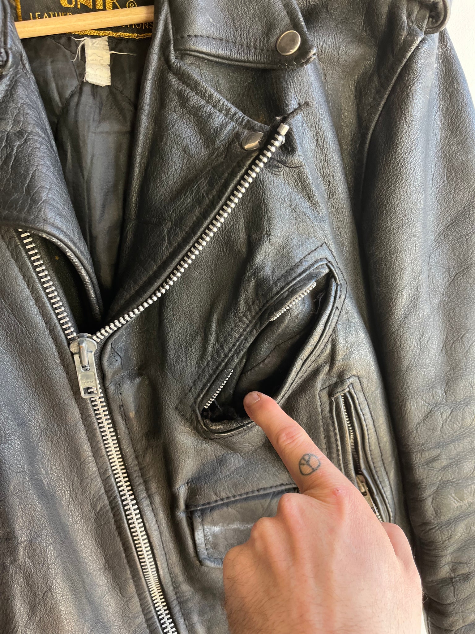 Condition: Thrashed wearable condition, no holes on the leather, but please note the only zipper that works is the front and right side pocket, the leather is a bit stiff and it has marks and such from decades of ridin'