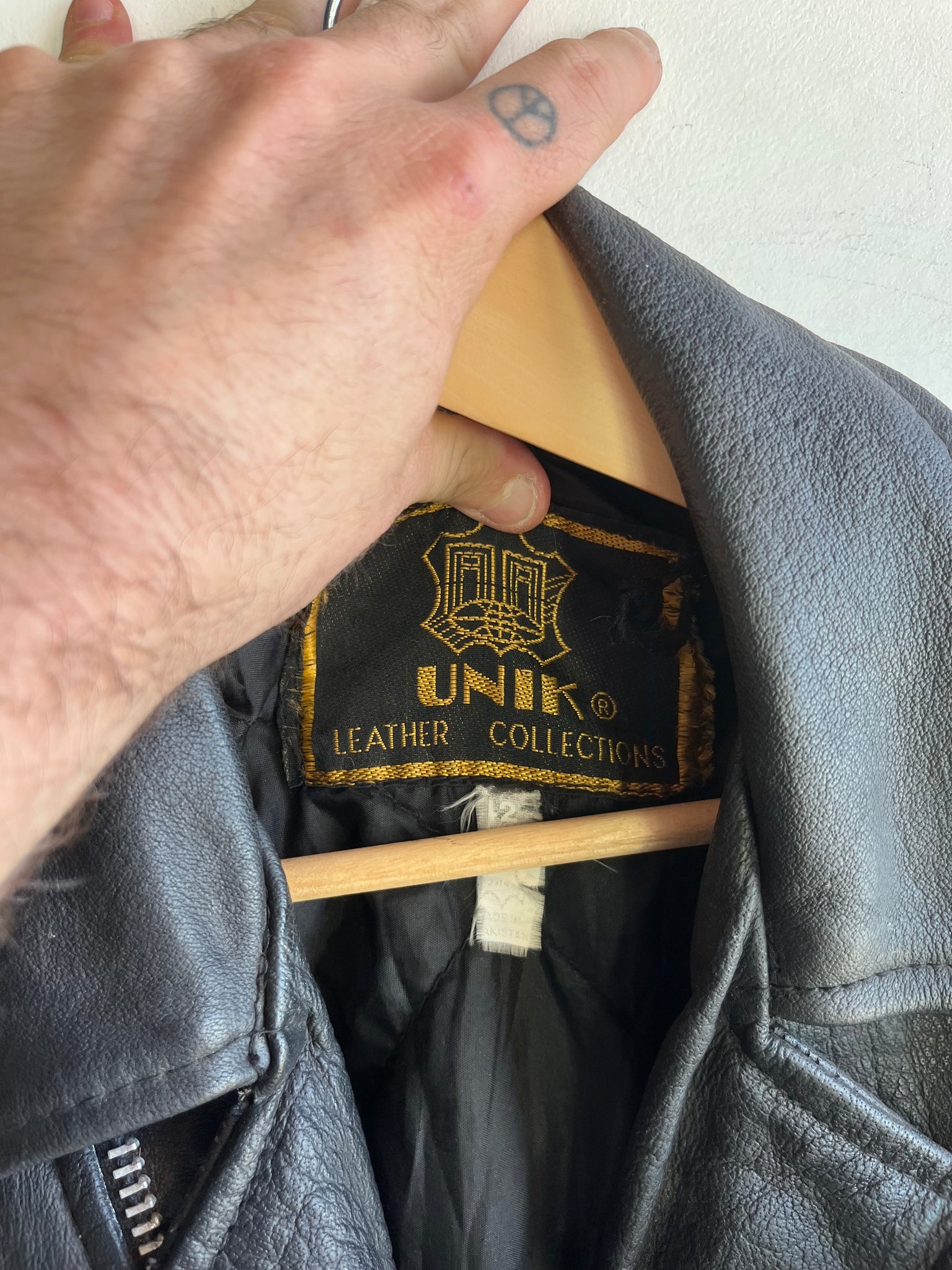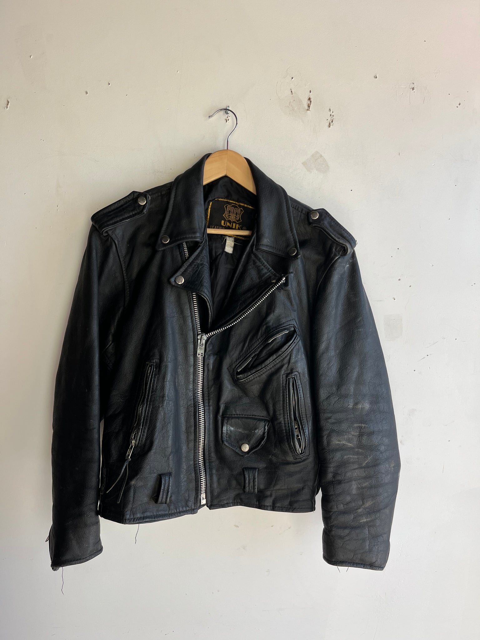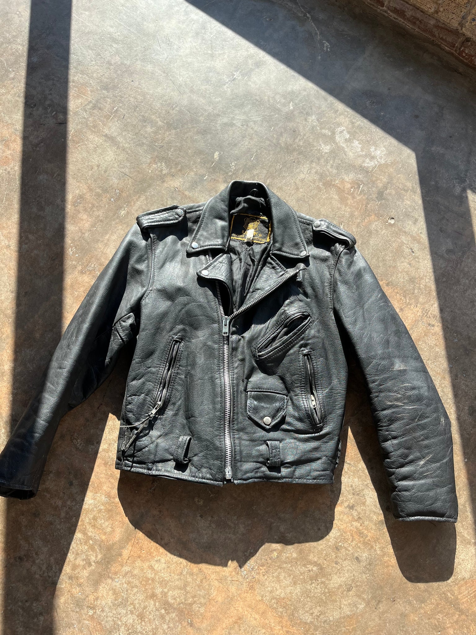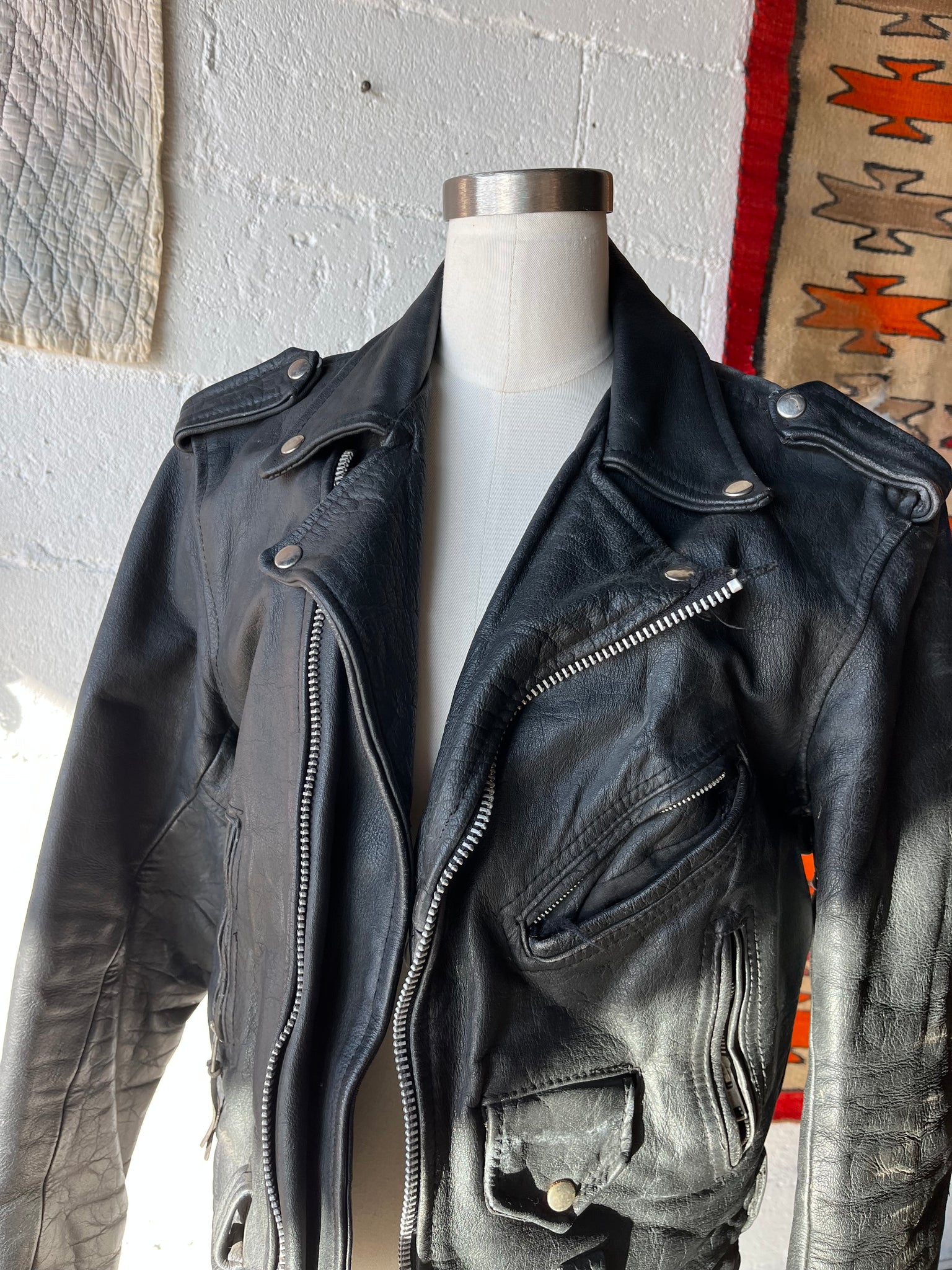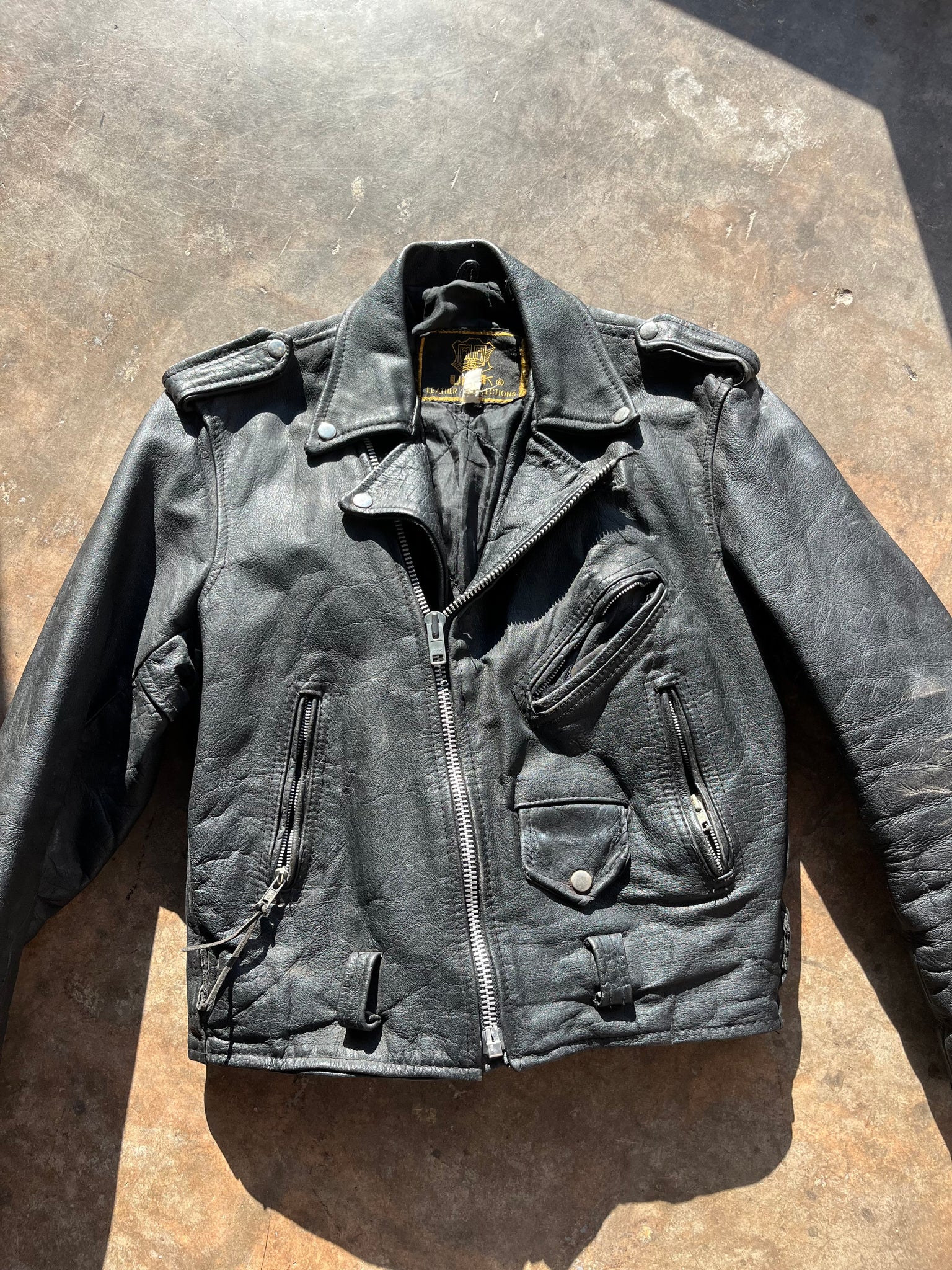 Condition: Thrashed wearable condition, no holes on the leather, but please note the only zipper that works is the front and right side pocket, the leather is a bit stiff and it has marks and such from decades of ridin'