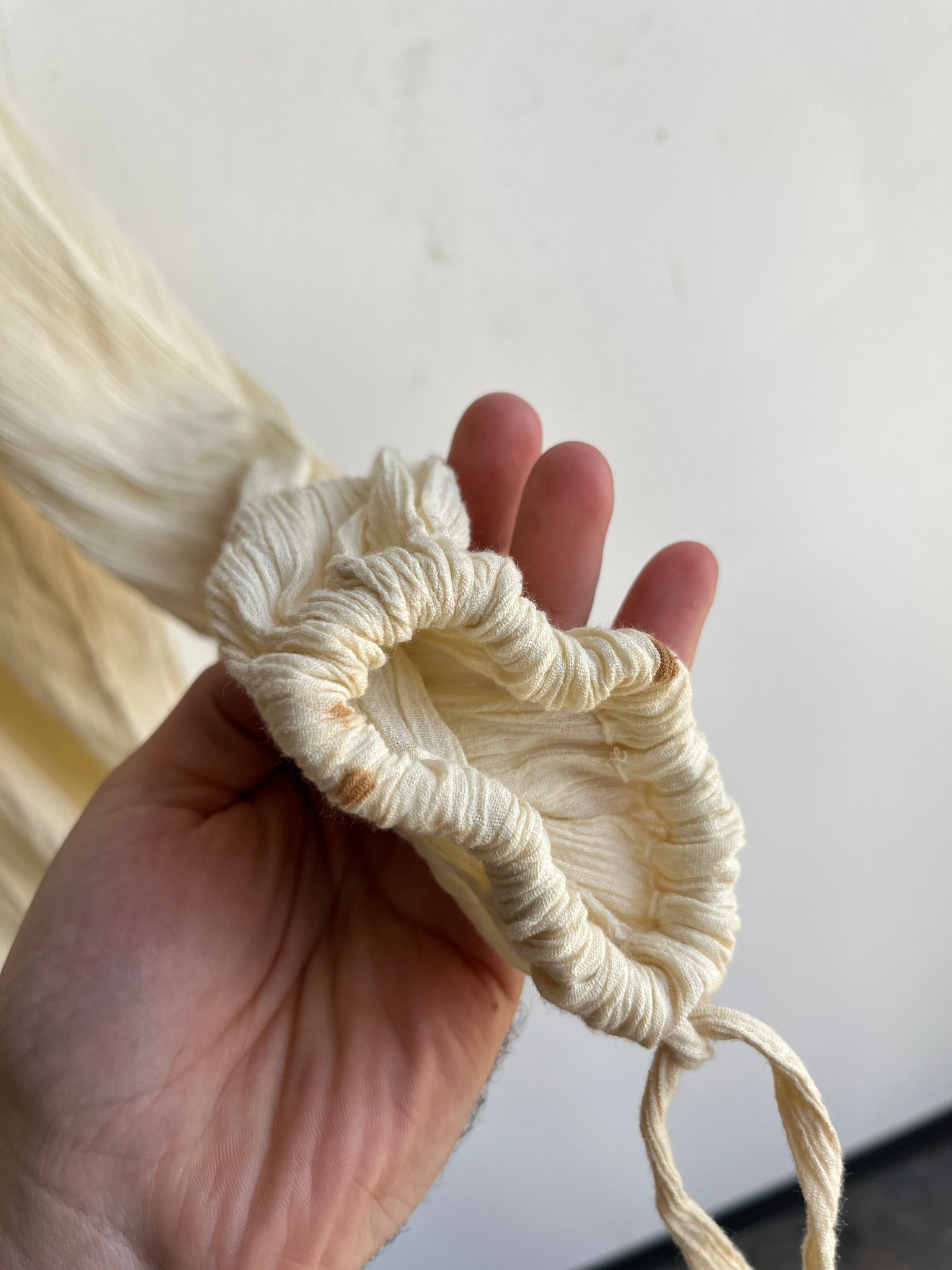 Condition: Very Good wearable condition, no holes noted, it has the original tag and neck and cuff ties, please note there are a couple of very light spots on the sleeves
