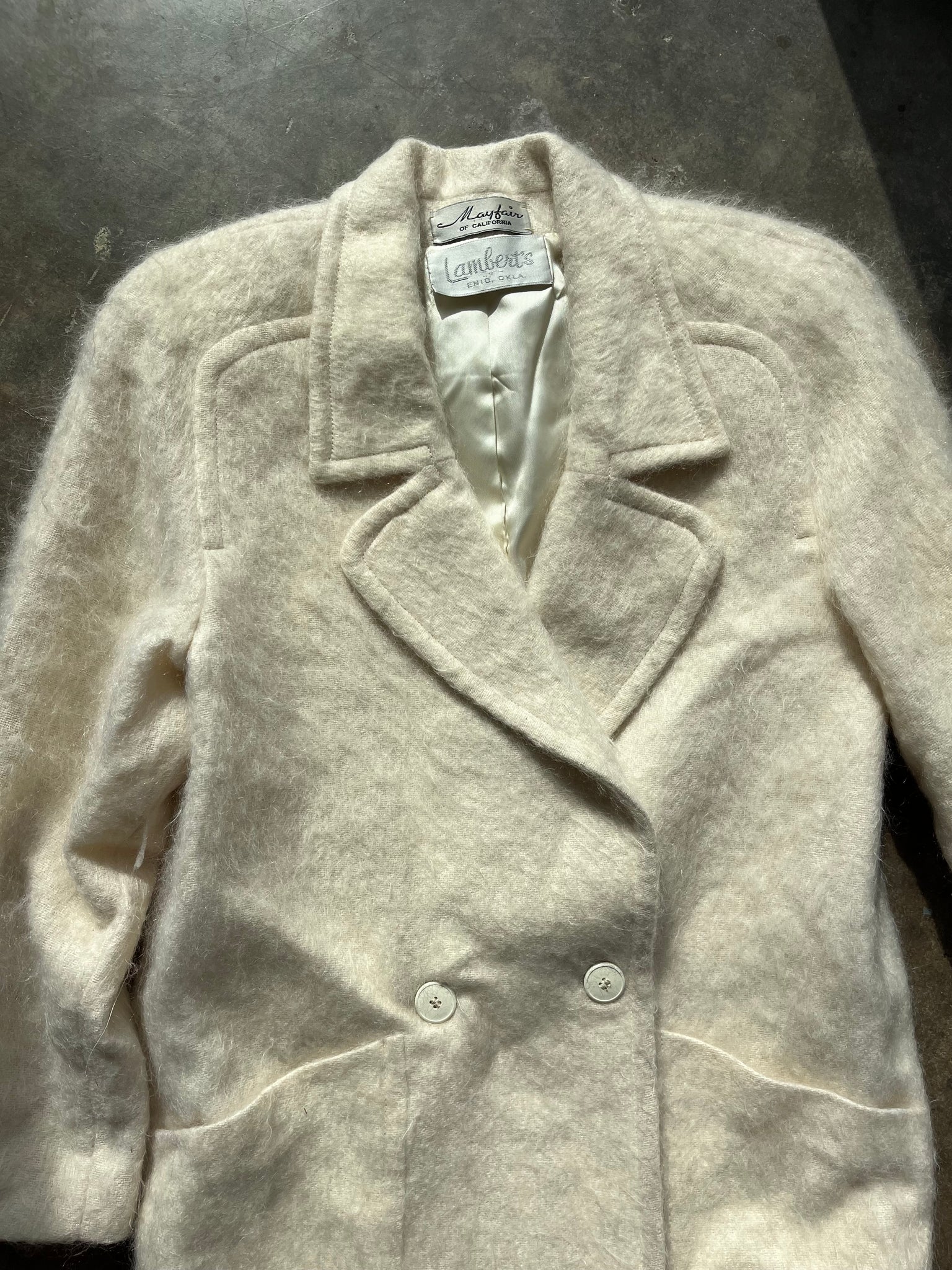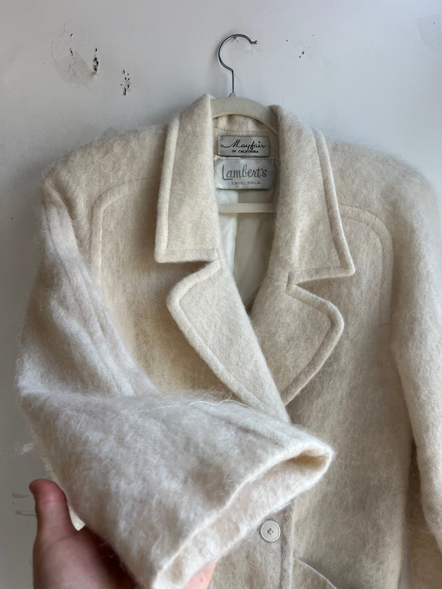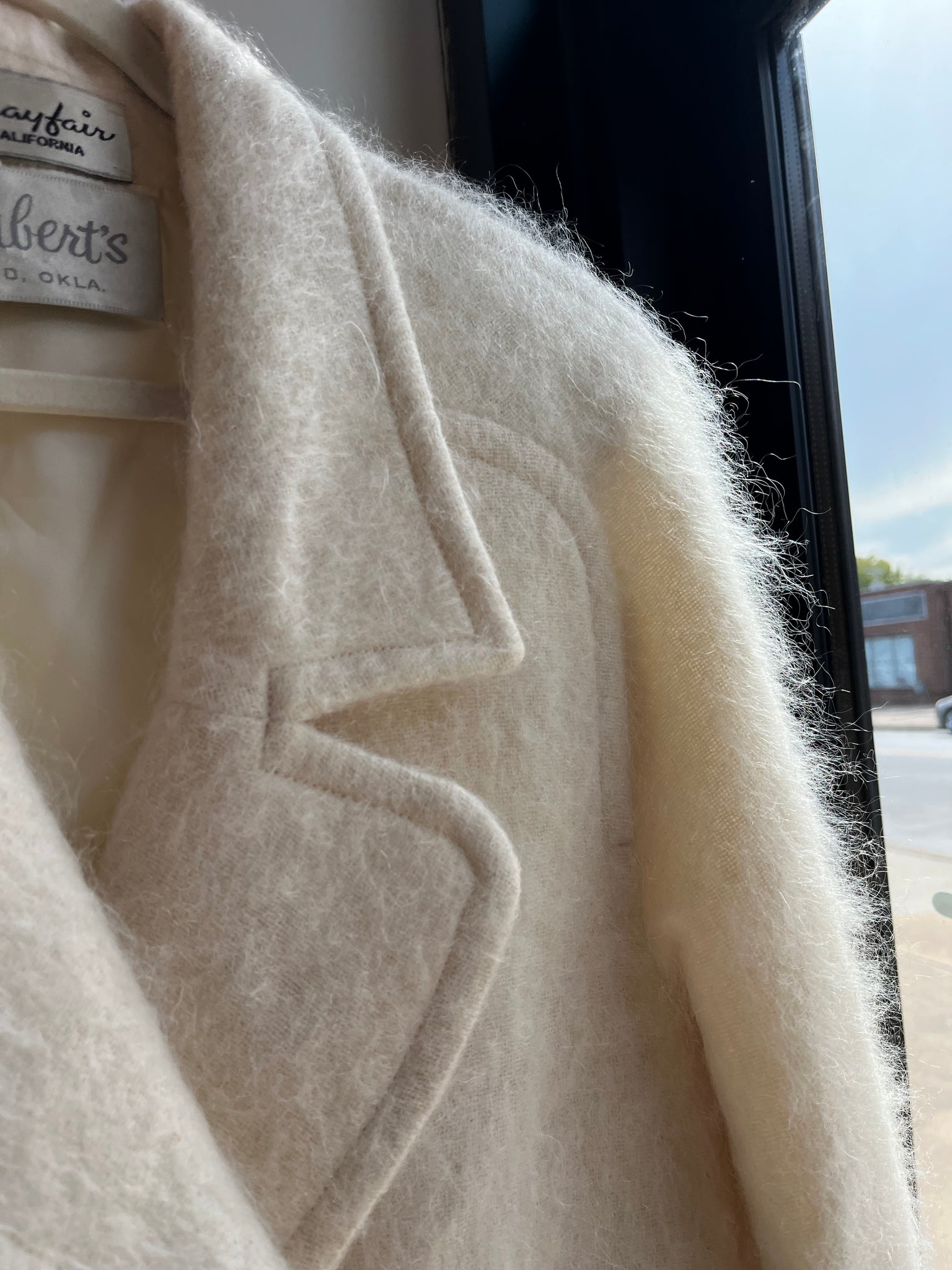 Fabric: no tags, but the outer is very fuzzy, but not a texture of angora, so I would say this is mohair or a mohair and wool blend, possibly acetate lining