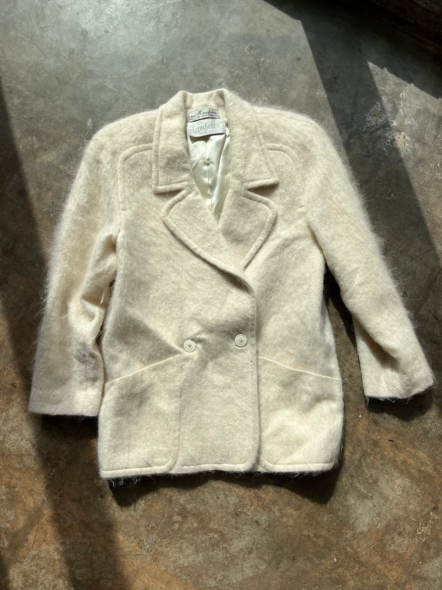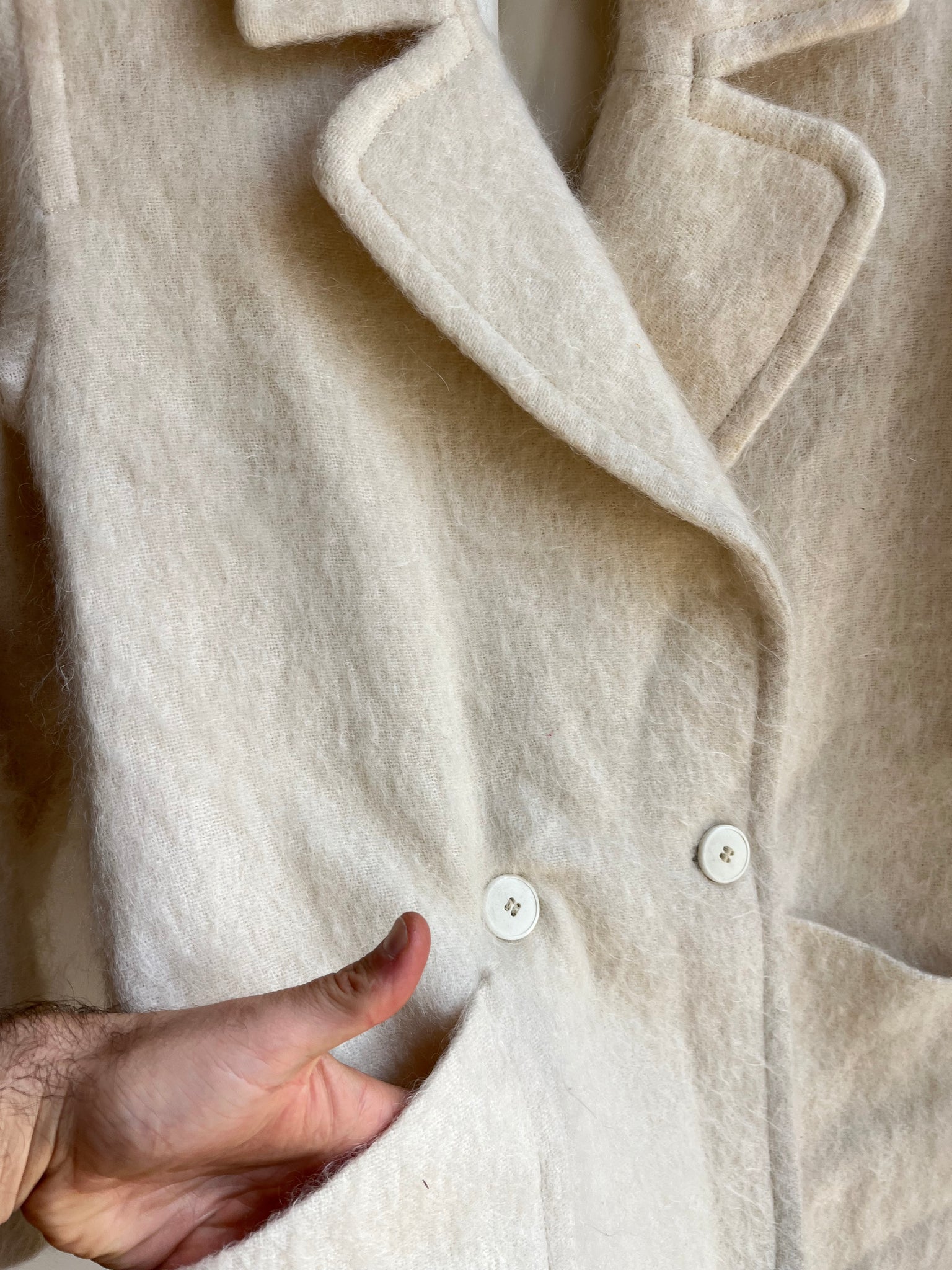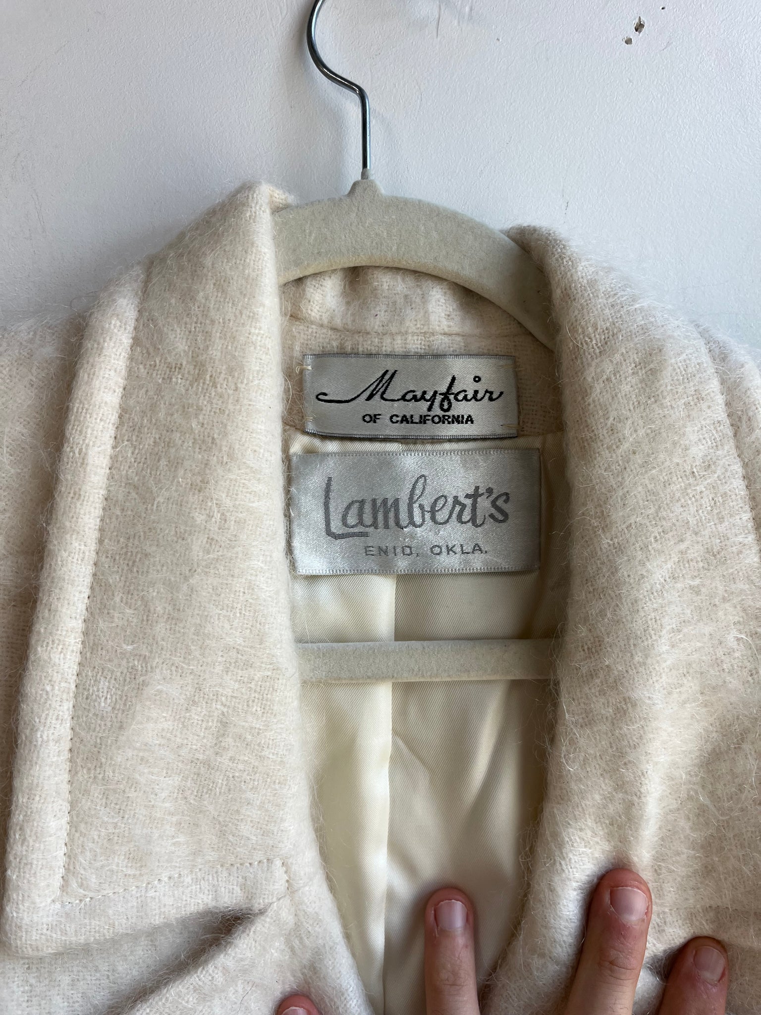 Fabric: no tags, but the outer is very fuzzy, but not a texture of angora, so I would say this is mohair or a mohair and wool blend, possibly acetate lining