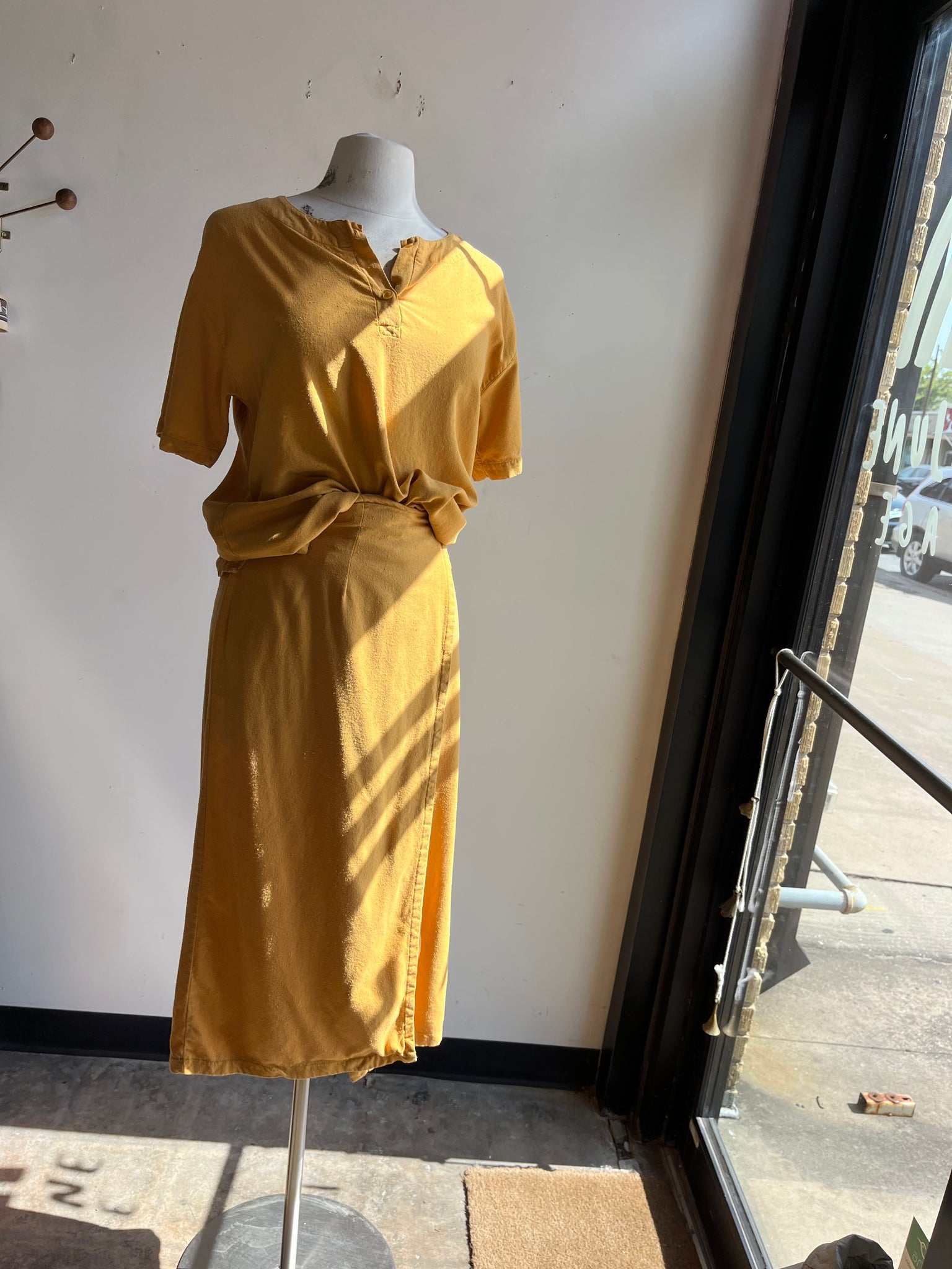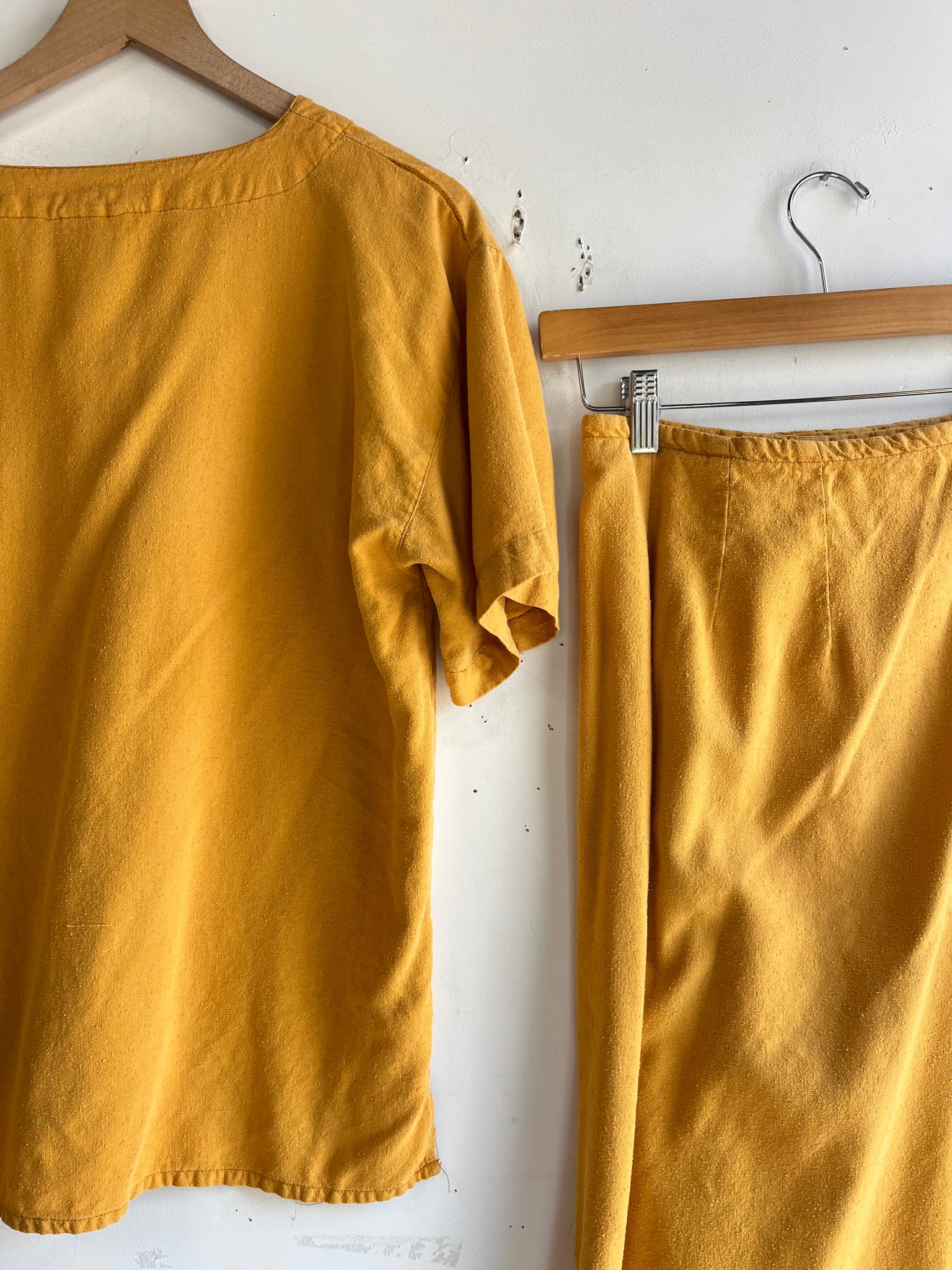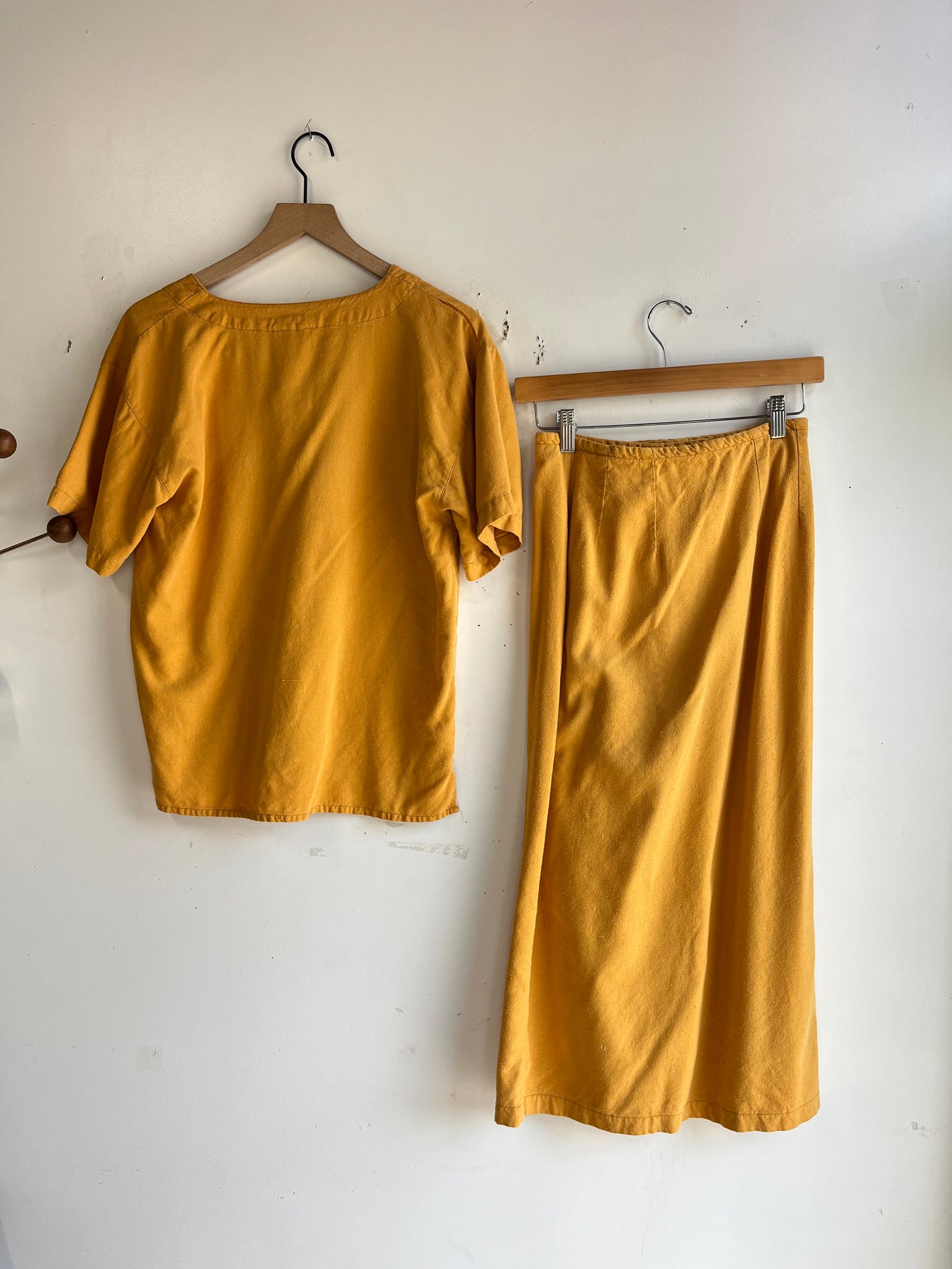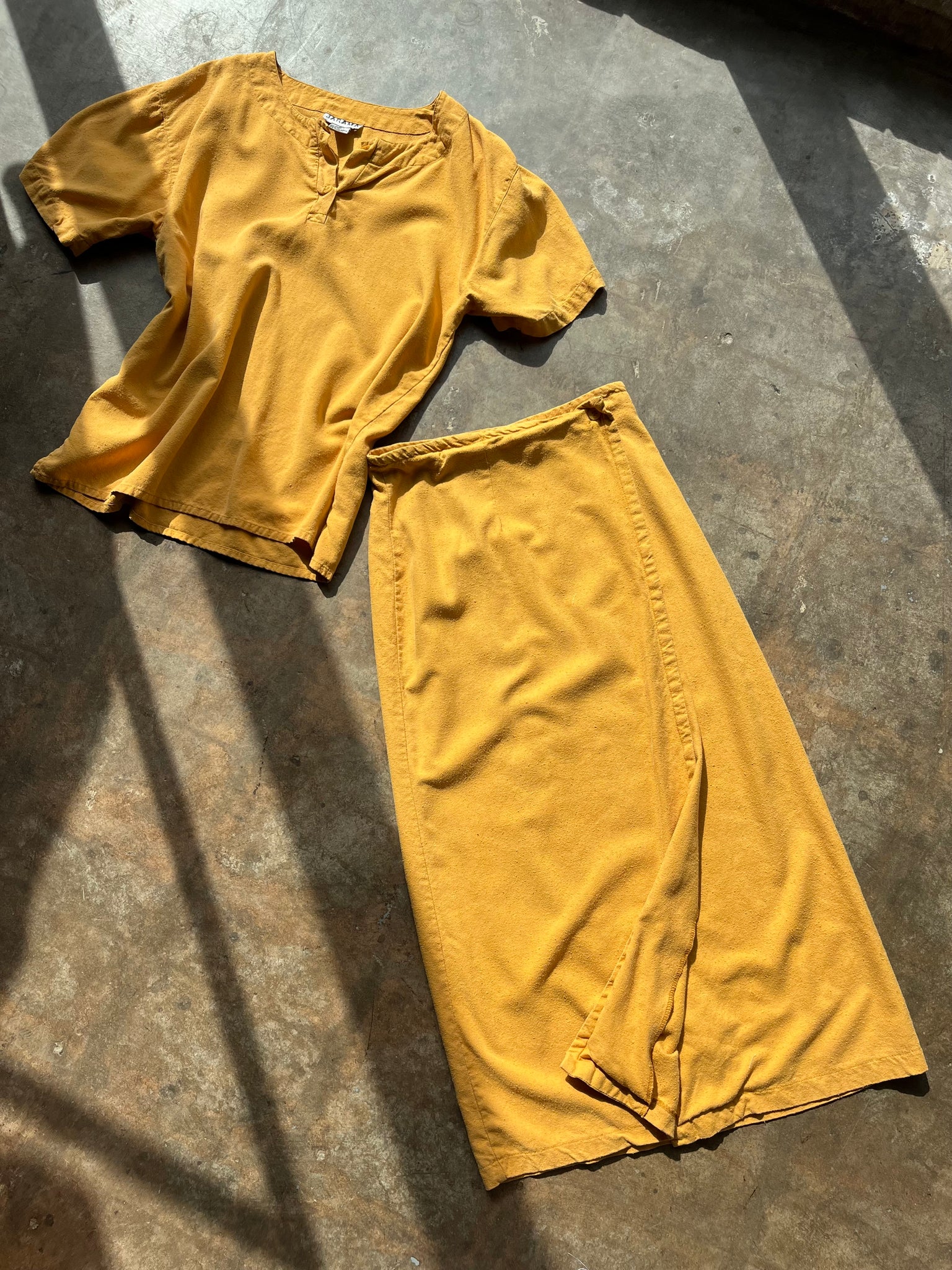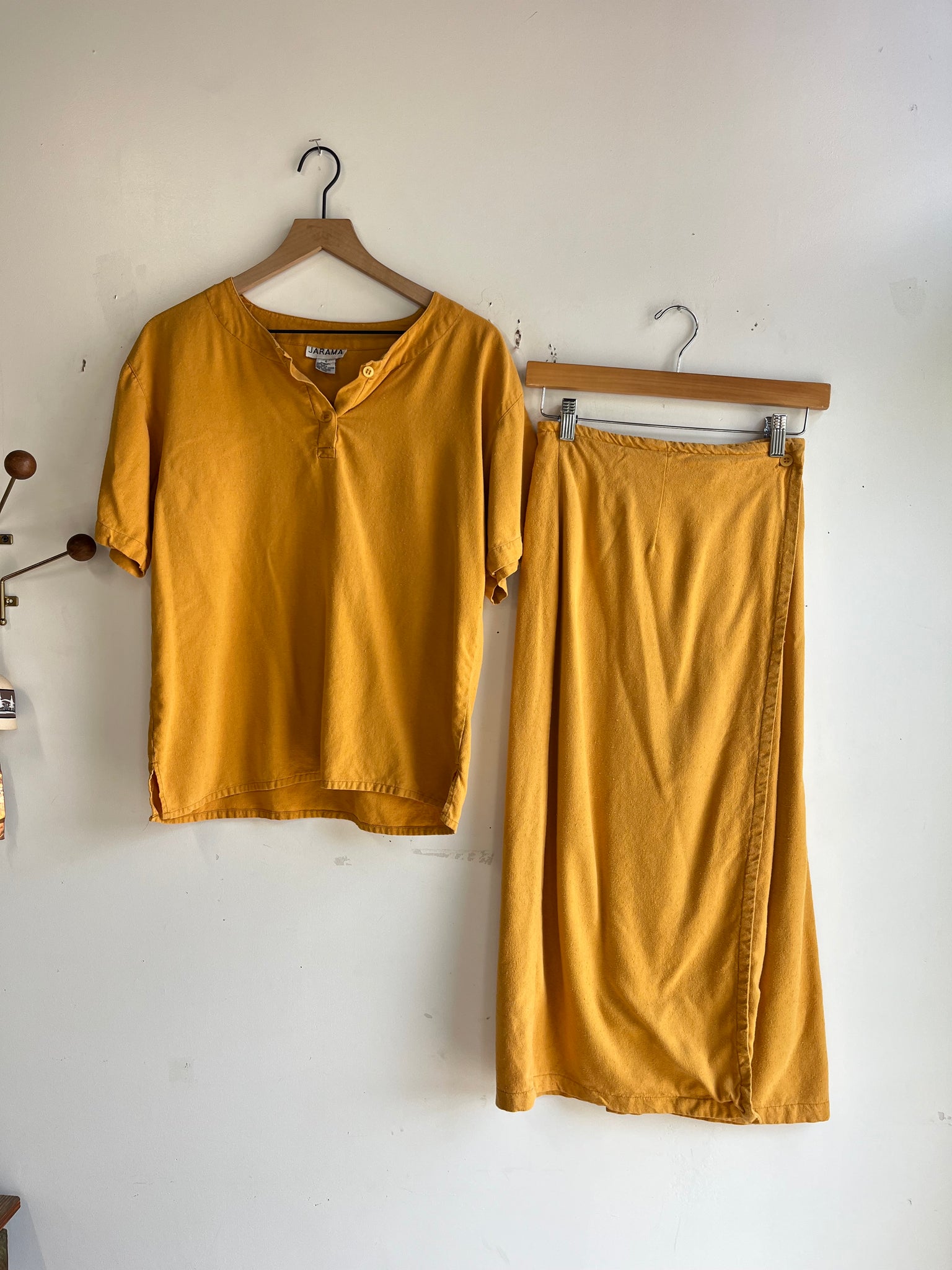 90s Mustard Raw Silk Top and Wrap Skirt Set