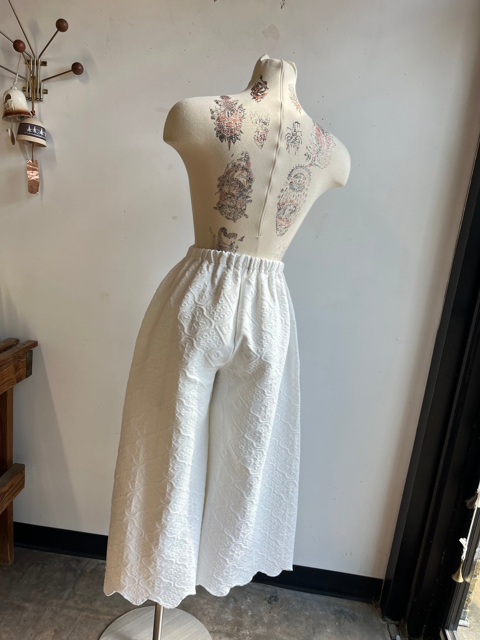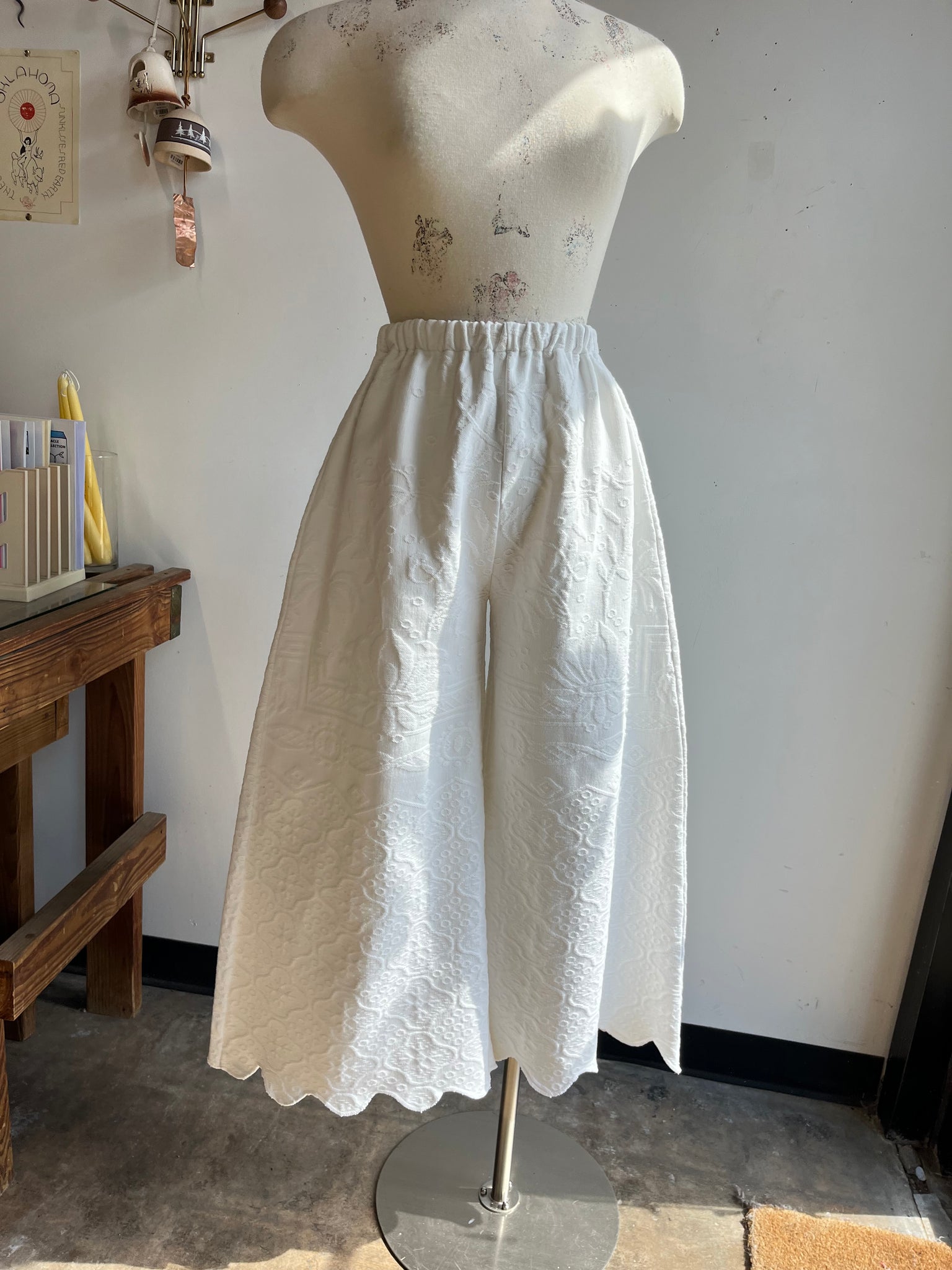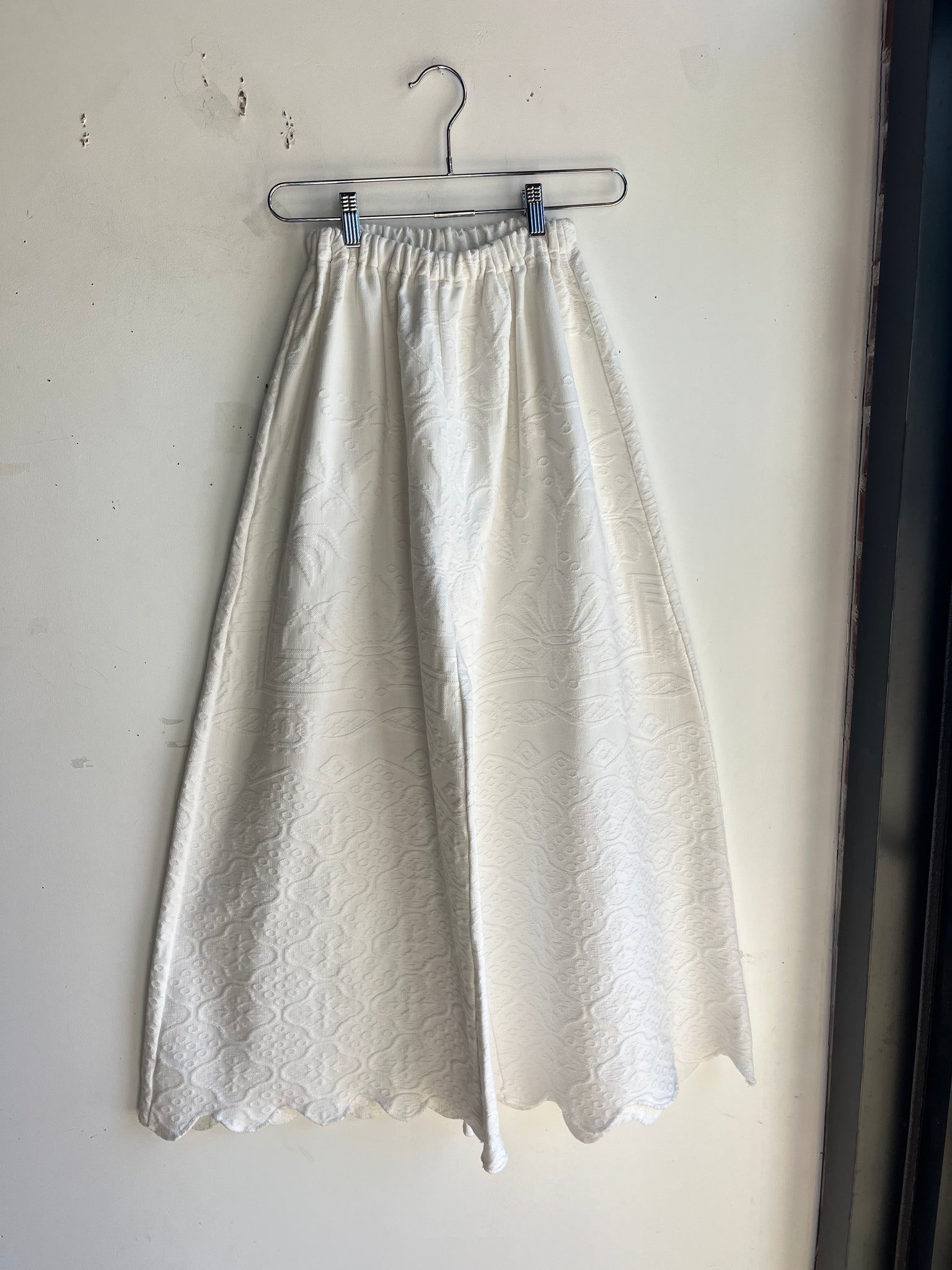 These pants are made from a vintage embroidered tapestry bed coverlet. There is no batting, but I would say this a light weight fabric. Judging by the fabric and style,I would say this is from the 1950s-1960s. This pant is made from a vintage palazzo pant pattern and features a super wide leg, high waist, and elastic waist band to fit a variety of sizes