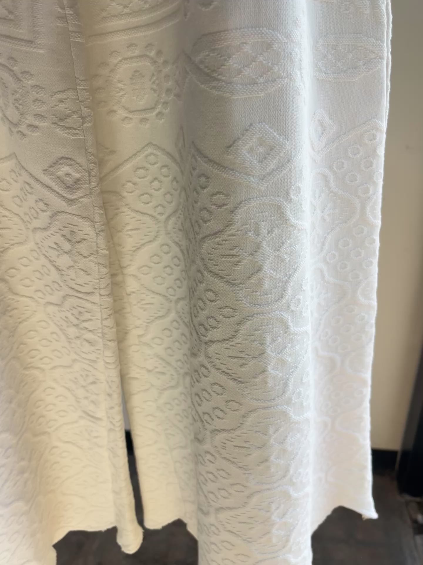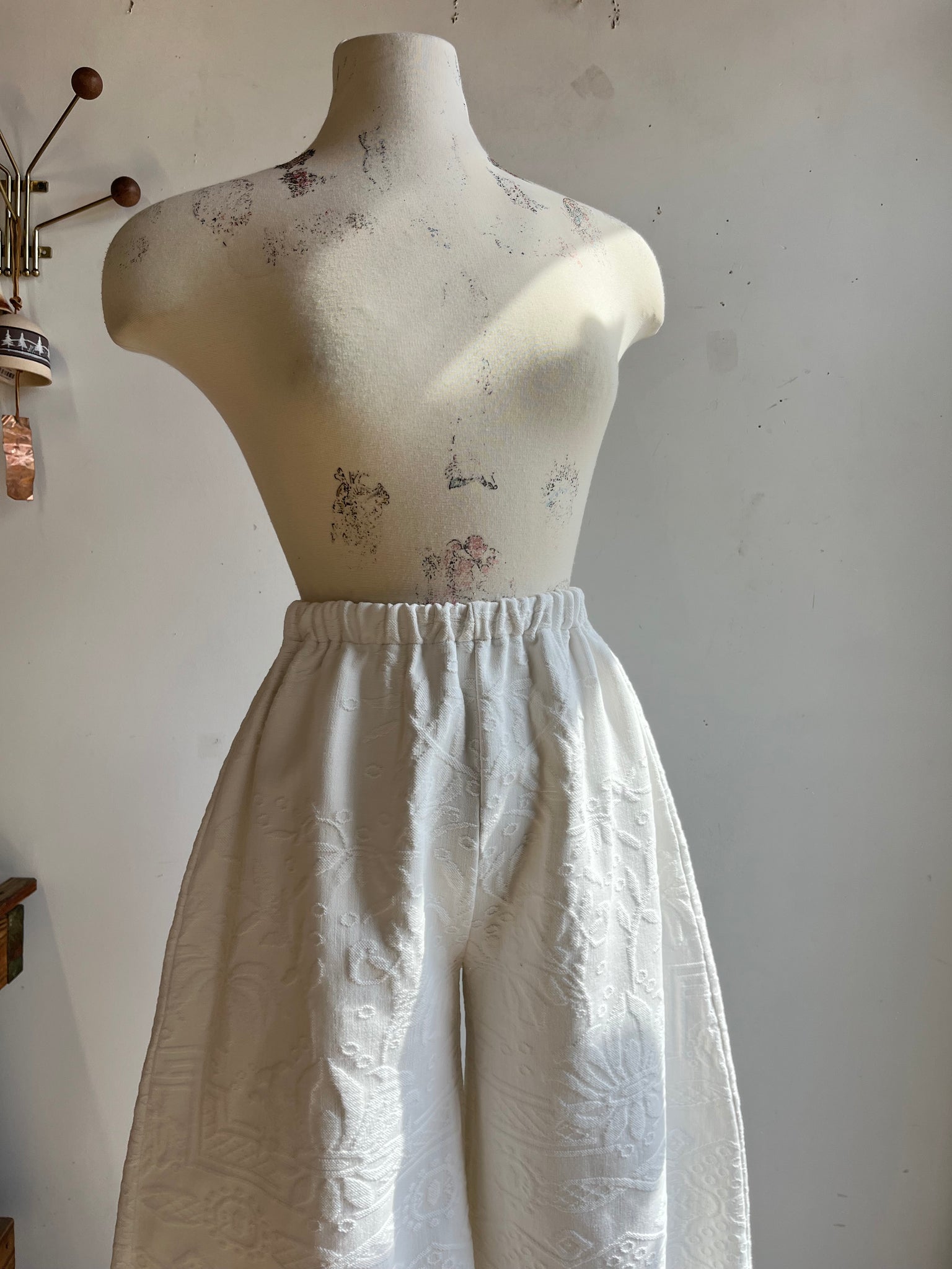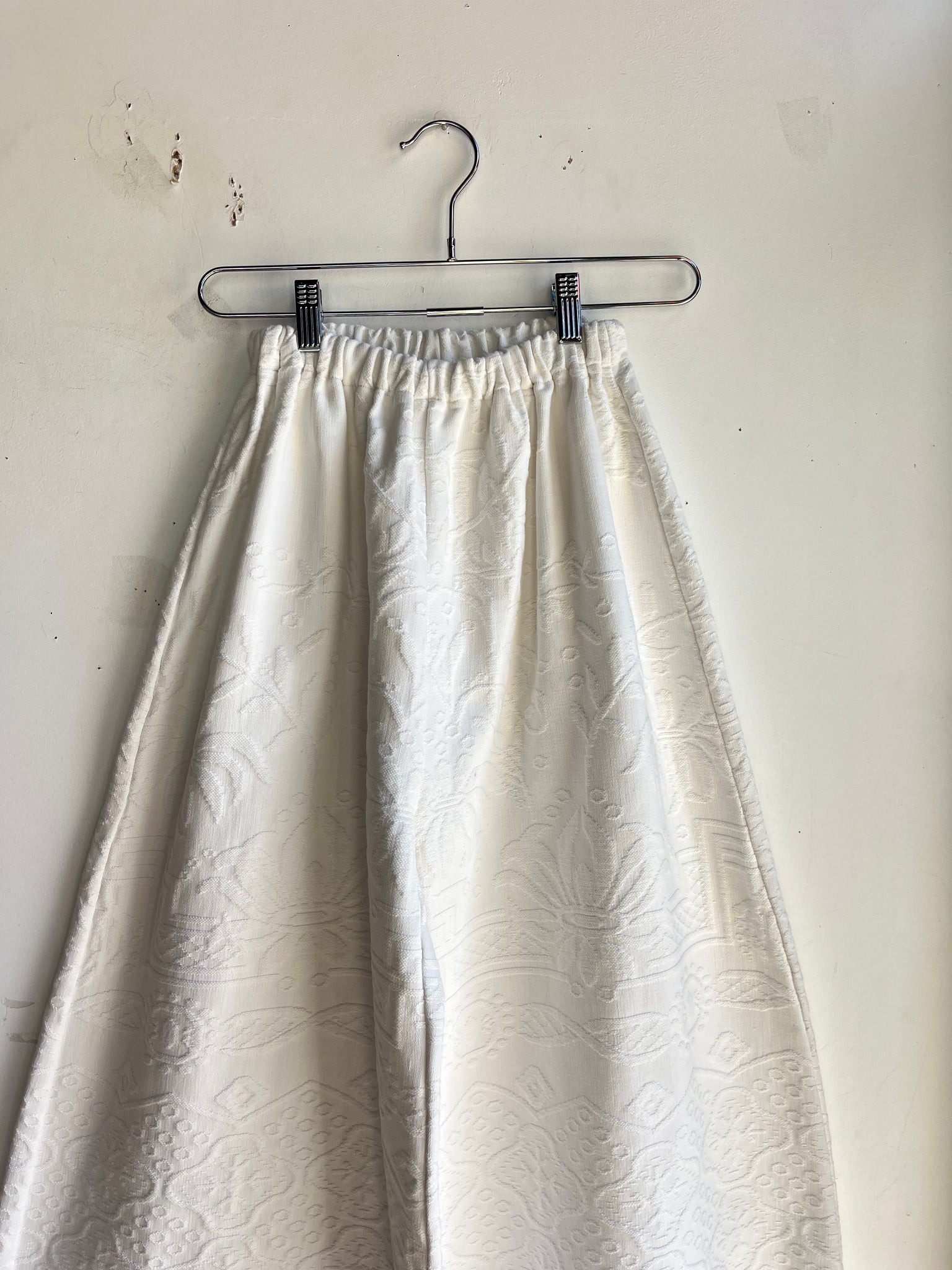 These pants are made from a vintage embroidered tapestry bed coverlet. There is no batting, but I would say this a light weight fabric. Judging by the fabric and style,I would say this is from the 1950s-1960s. This pant is made from a vintage palazzo pant pattern and features a super wide leg, high waist, and elastic waist band to fit a variety of sizes