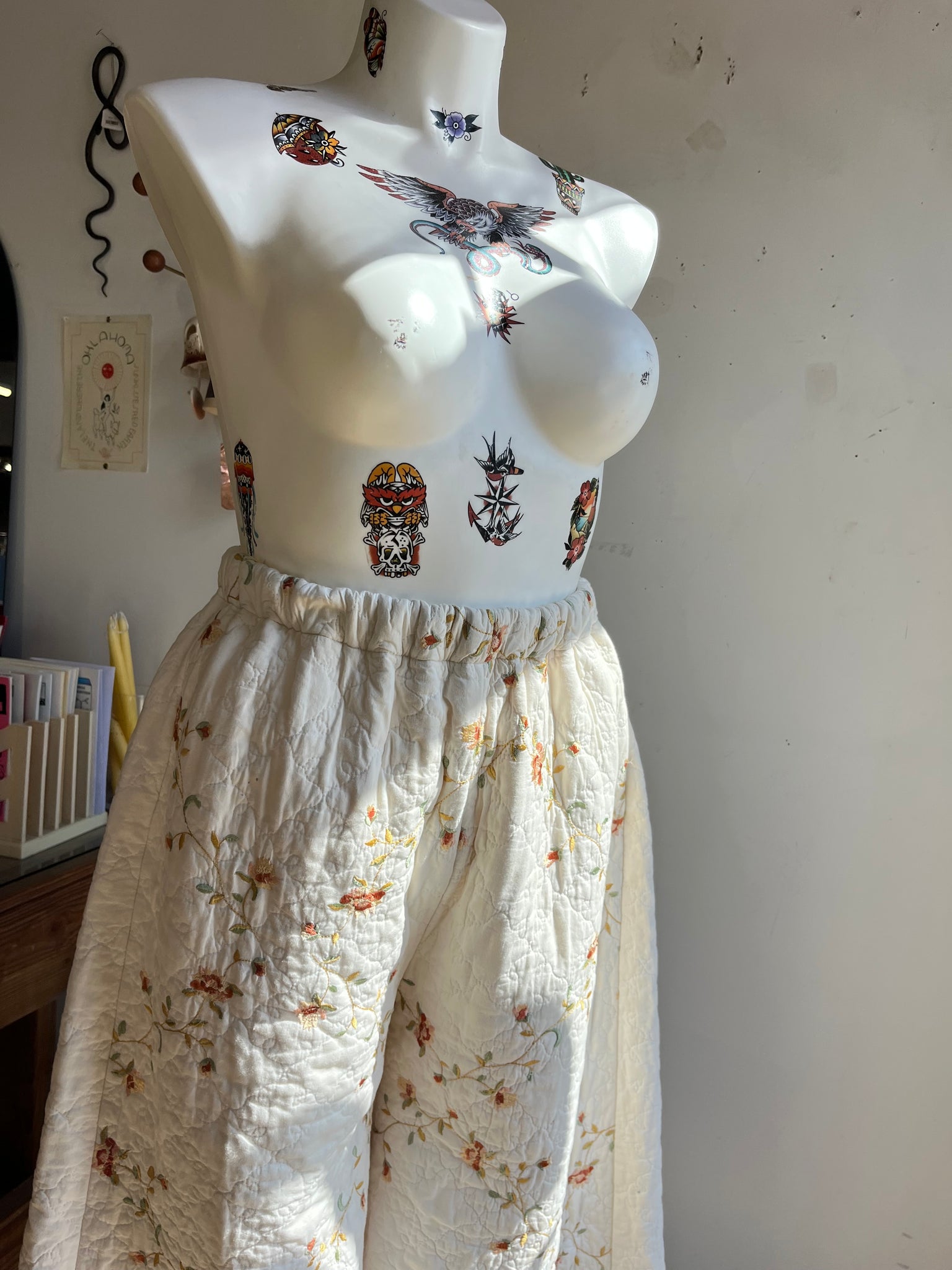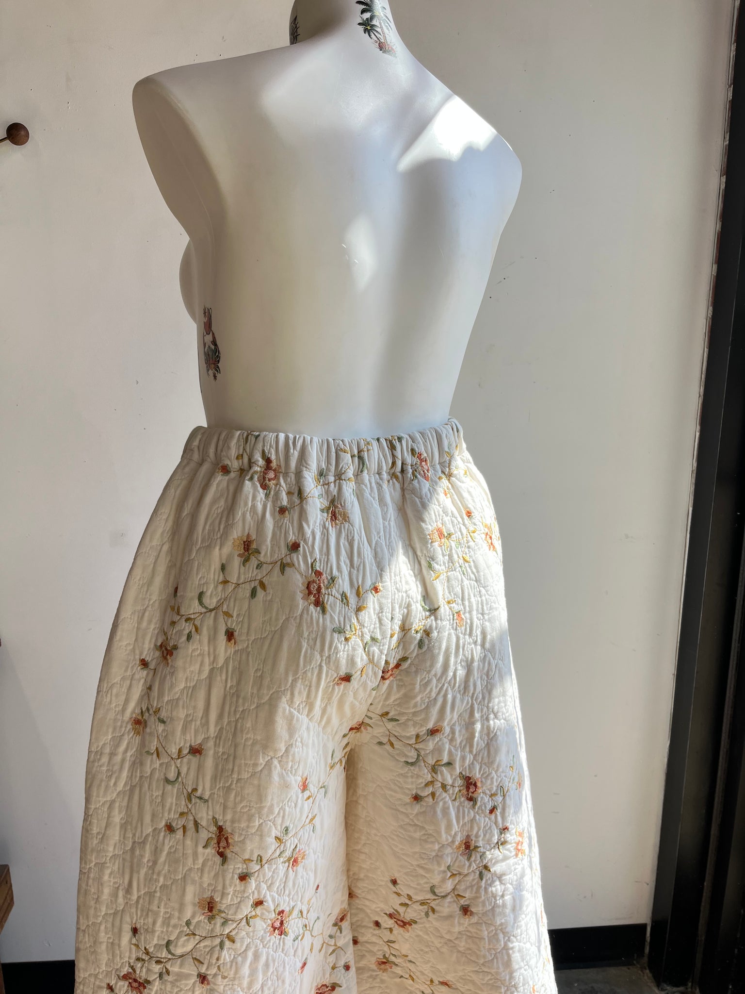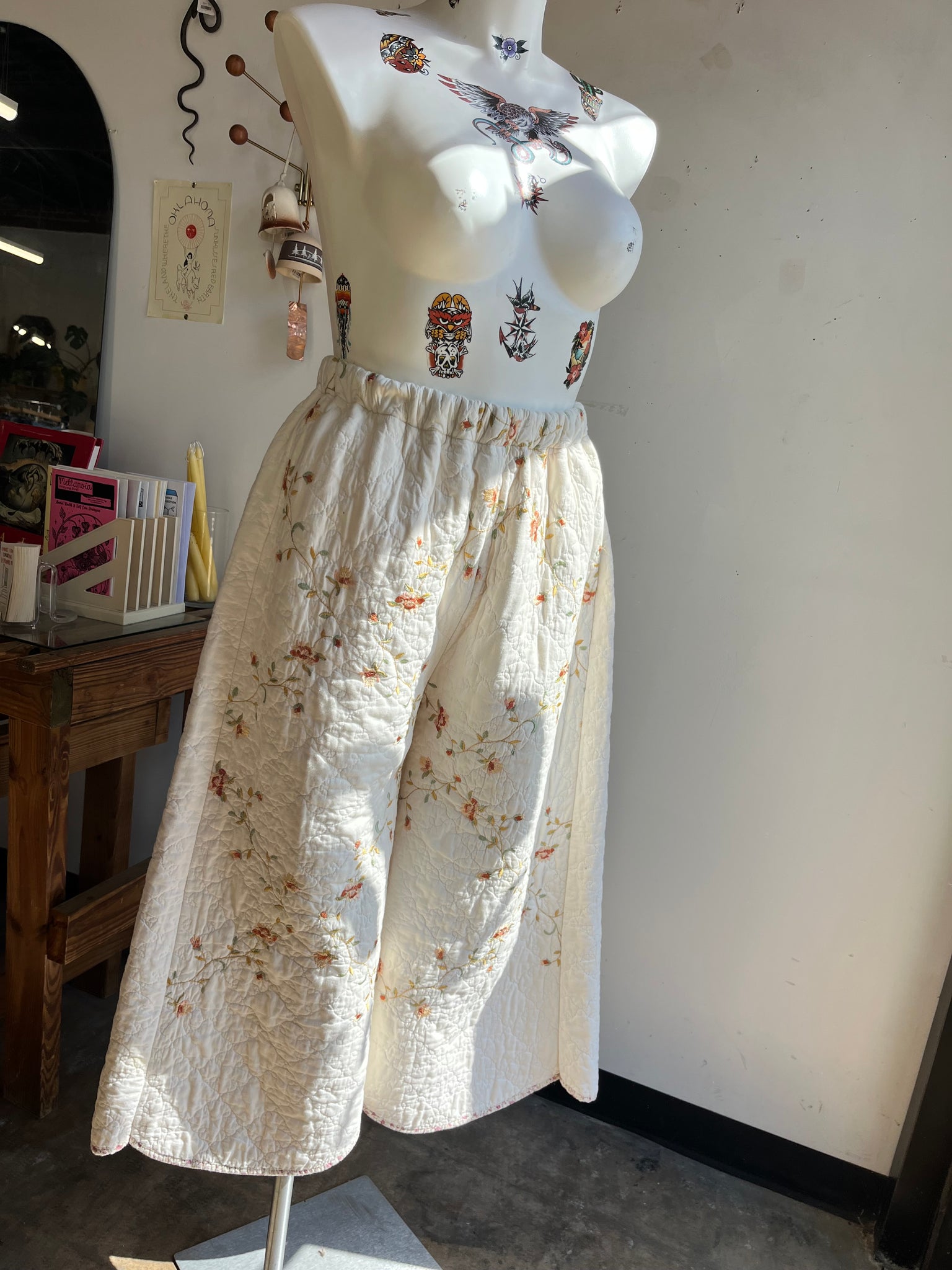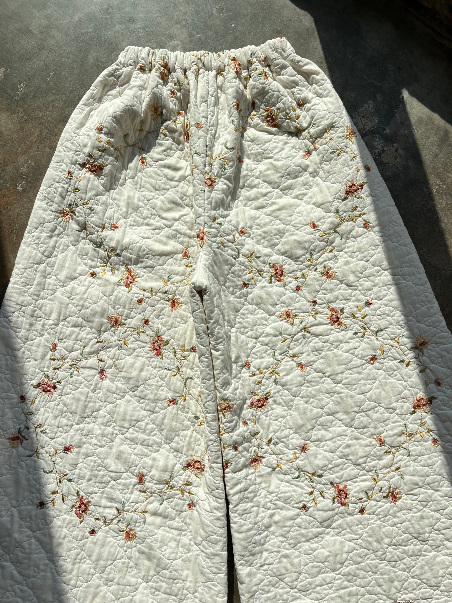 These pants are made from a Embroidered Rose quilt. When it was found, it had several tears, so why not use the good parts for pants:) There is a light batting between the two layers, but I would say this a light weight quilt. Judging by the fabric, style, and that it is all hand stitched, I would say this is from the 1990s-Y2K. This pant is made from a vintage palazzo pant pattern and features a super wide leg, high waist and elastic waist band to fit a variety of sizes