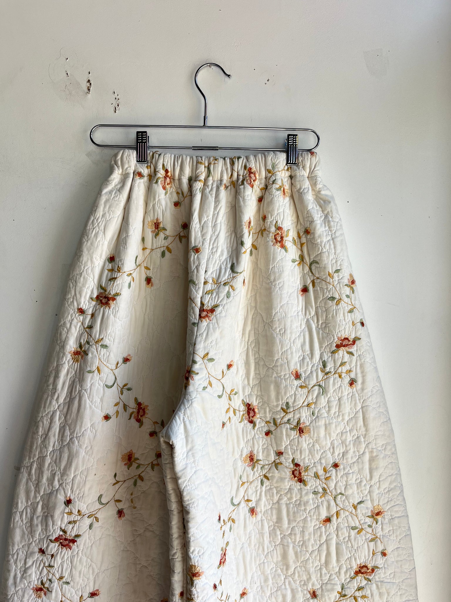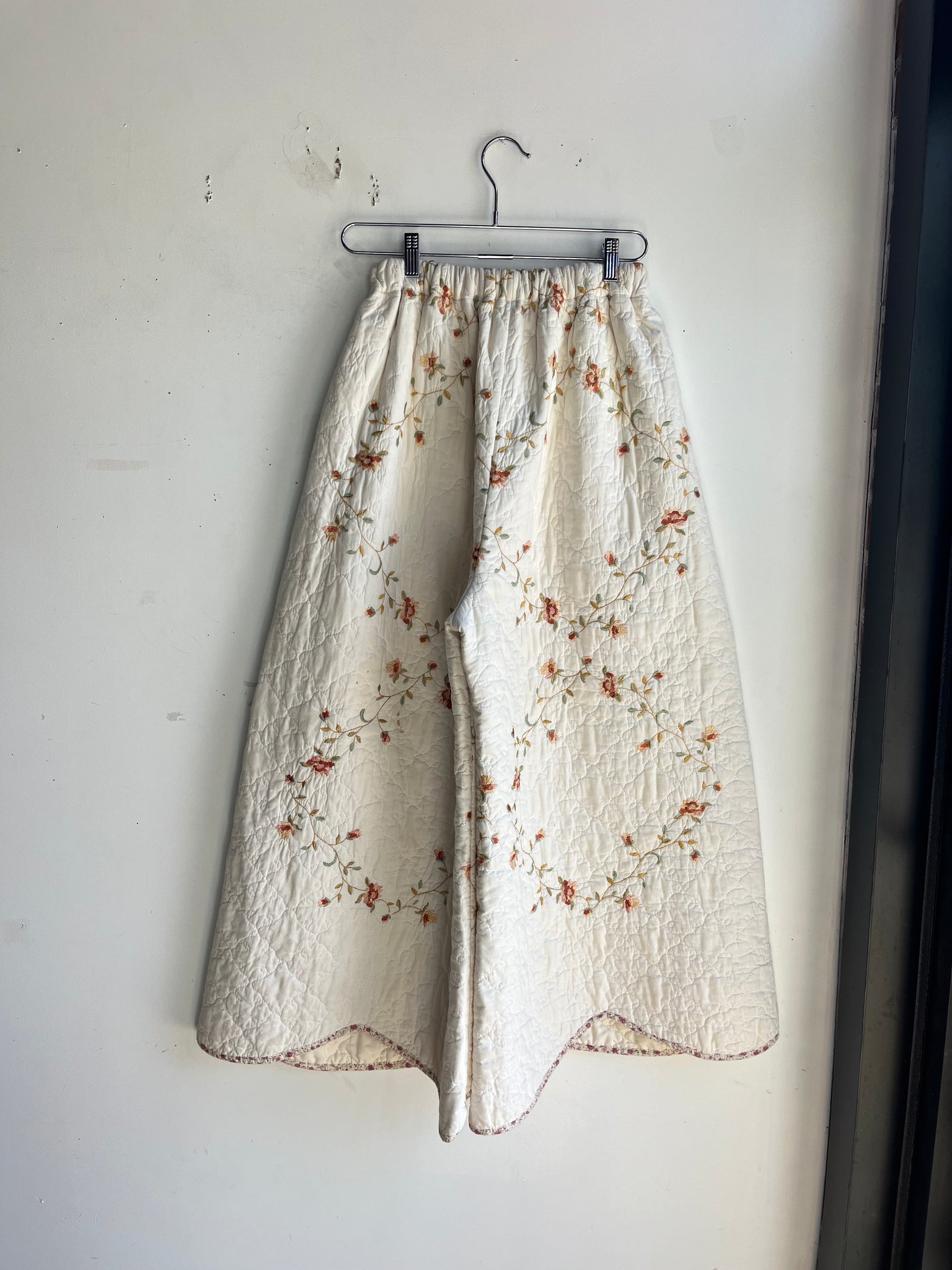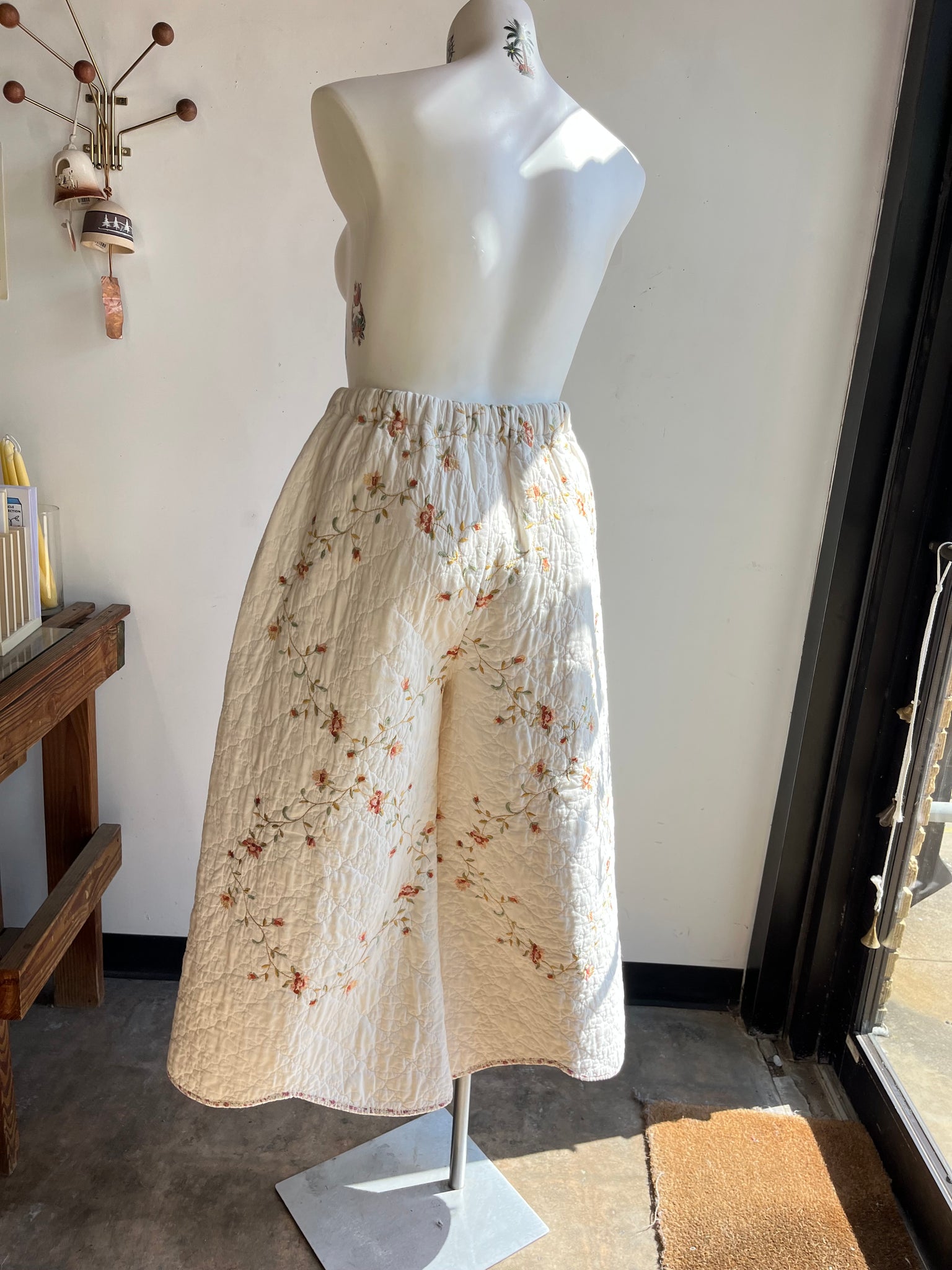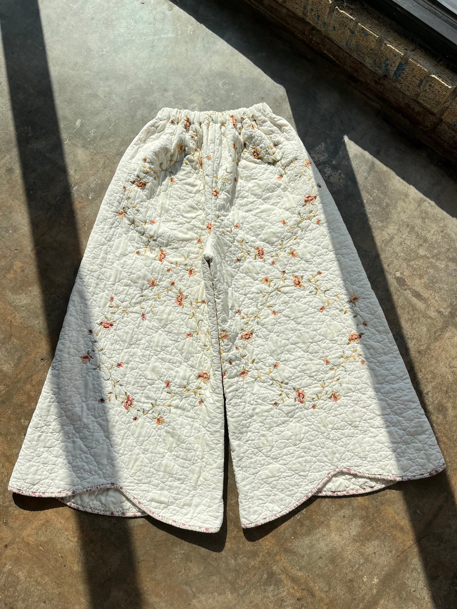 These pants are made from a Embroidered Rose quilt. When it was found, it had several tears, so why not use the good parts for pants:) There is a light batting between the two layers, but I would say this a light weight quilt. Judging by the fabric, style, and that it is all hand stitched, I would say this is from the 1990s-Y2K. This pant is made from a vintage palazzo pant pattern and features a super wide leg, high waist and elastic waist band to fit a variety of sizes