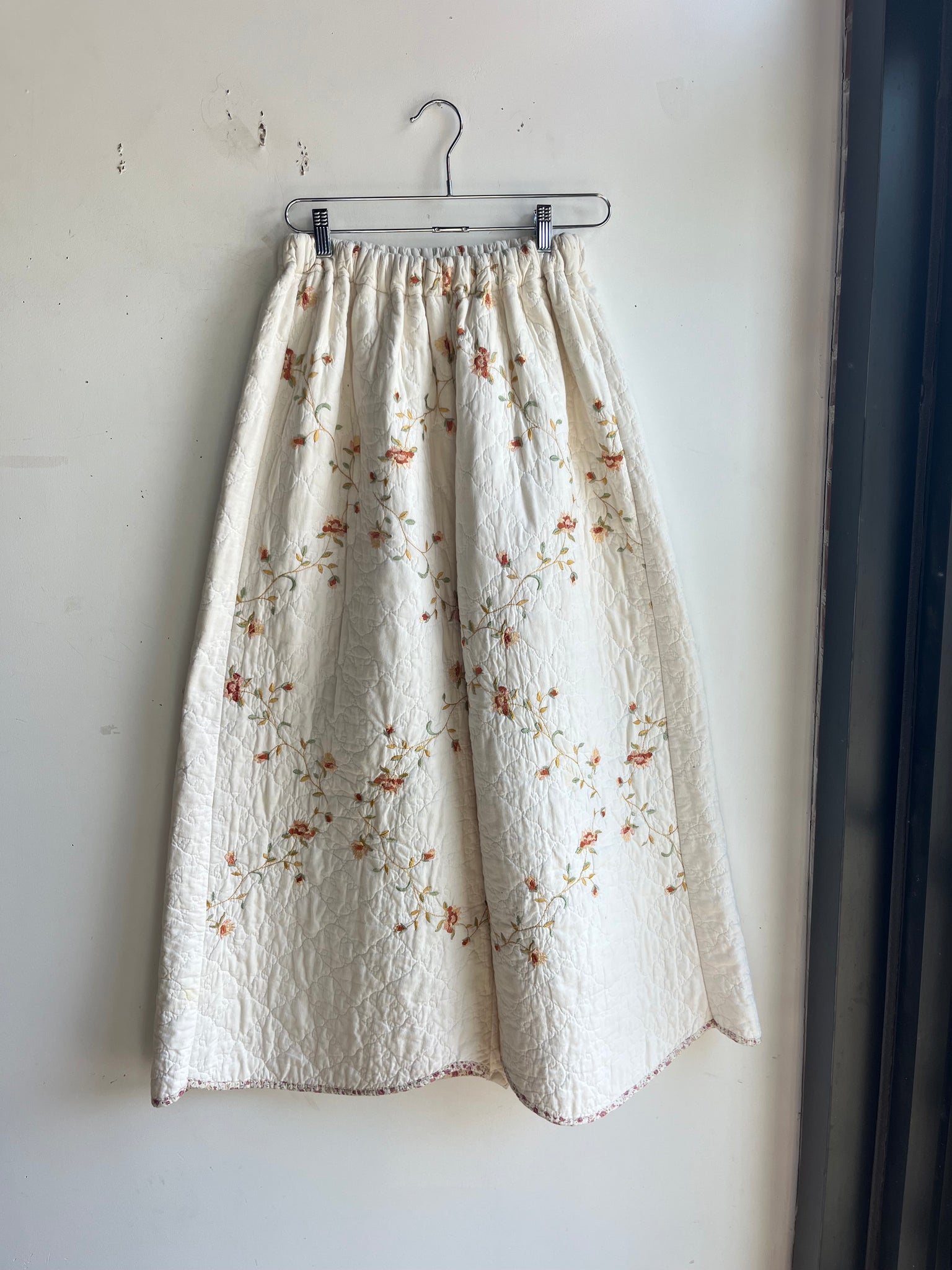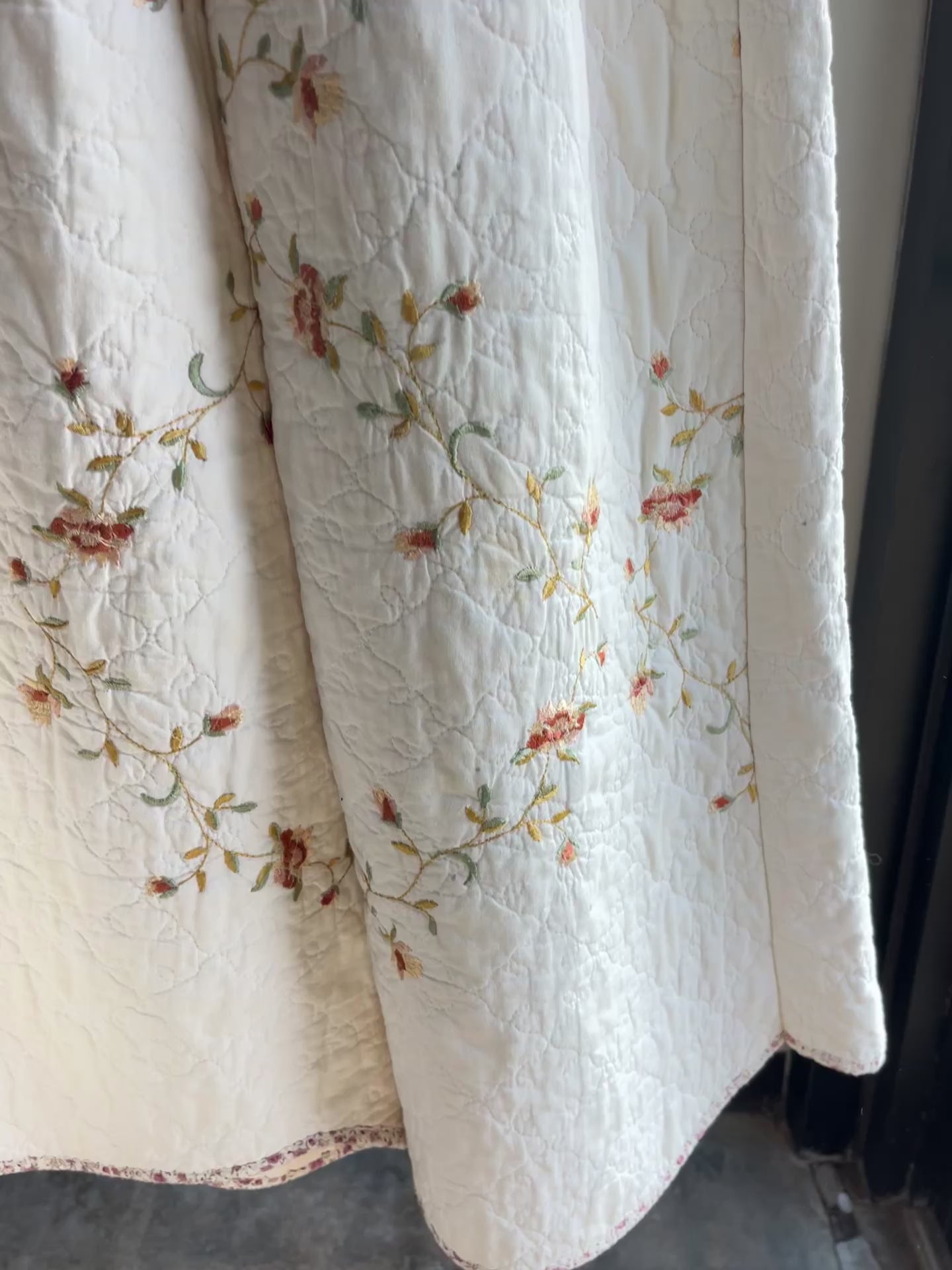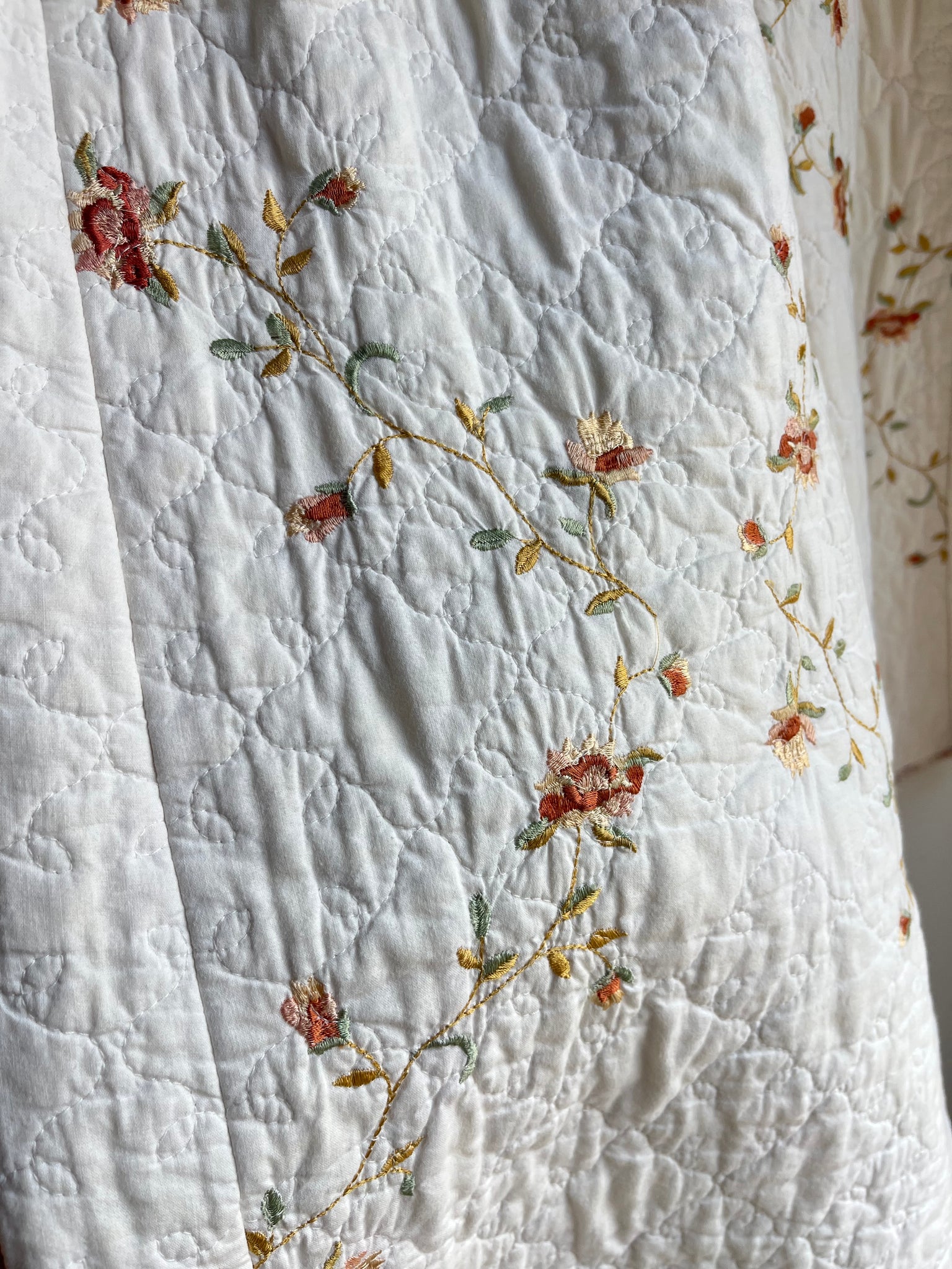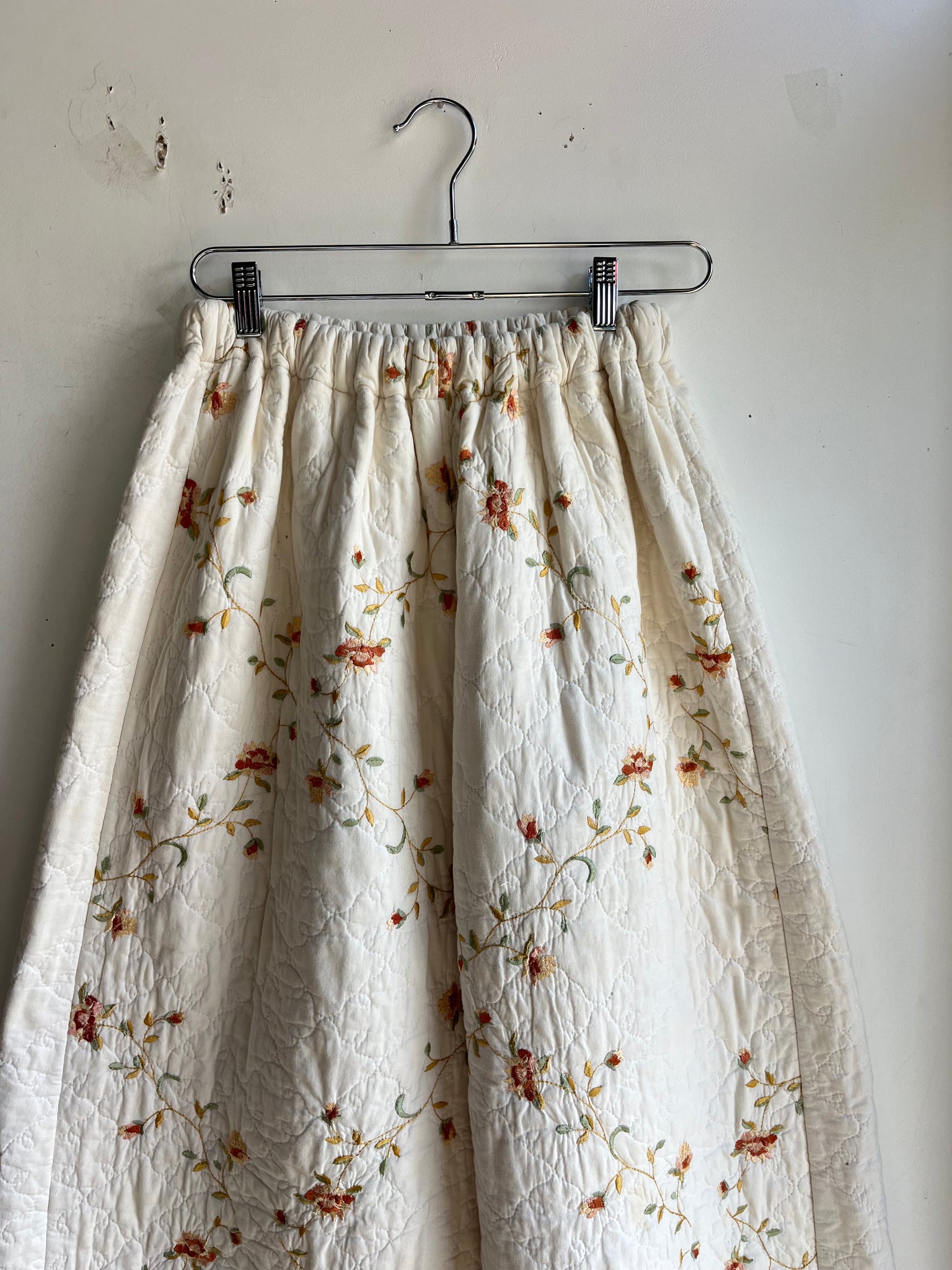 These pants are made from a Embroidered Rose quilt. When it was found, it had several tears, so why not use the good parts for pants:) There is a light batting between the two layers, but I would say this a light weight quilt. Judging by the fabric, style, and that it is all hand stitched, I would say this is from the 1990s-Y2K. This pant is made from a vintage palazzo pant pattern and features a super wide leg, high waist and elastic waist band to fit a variety of sizes