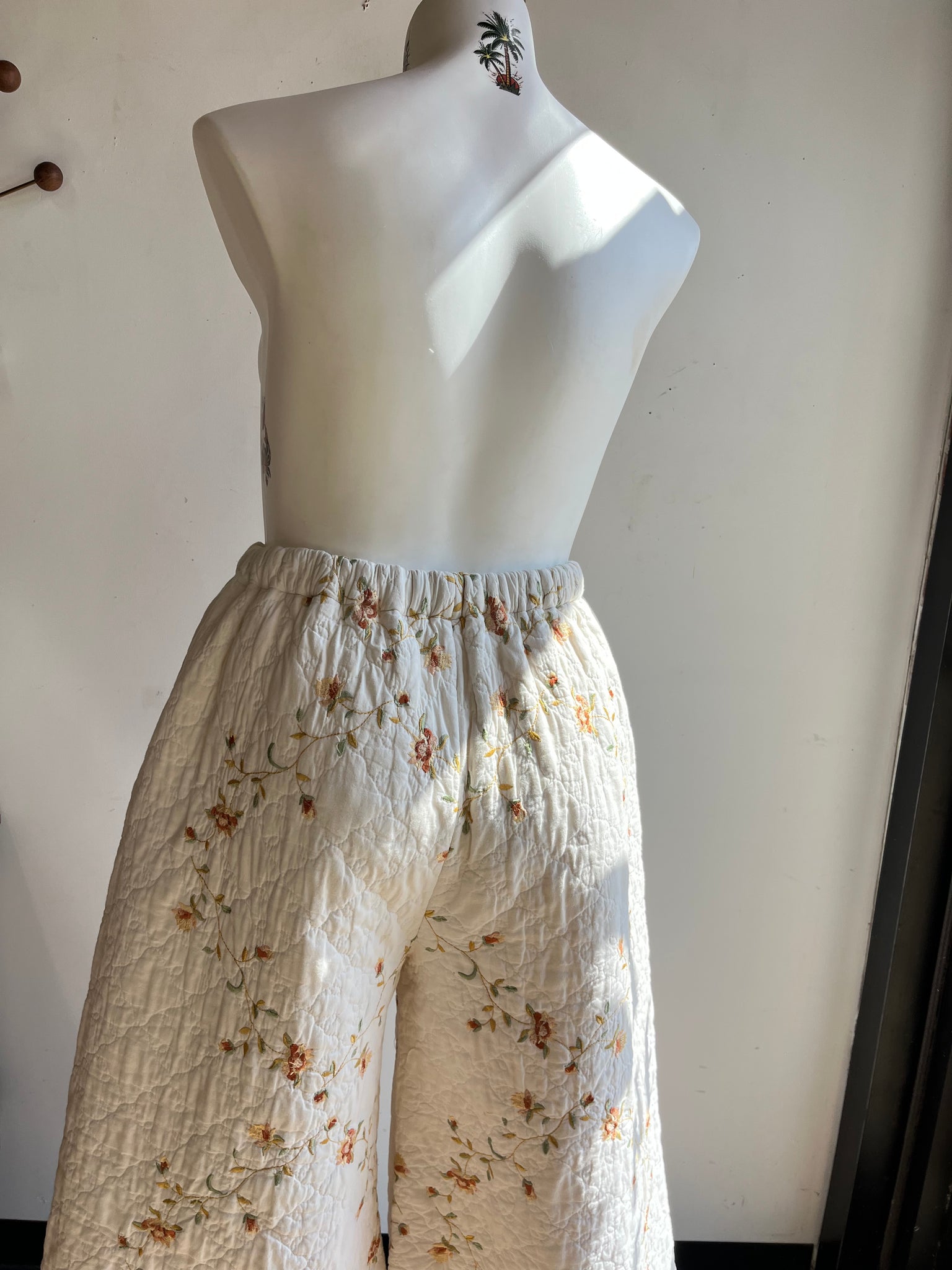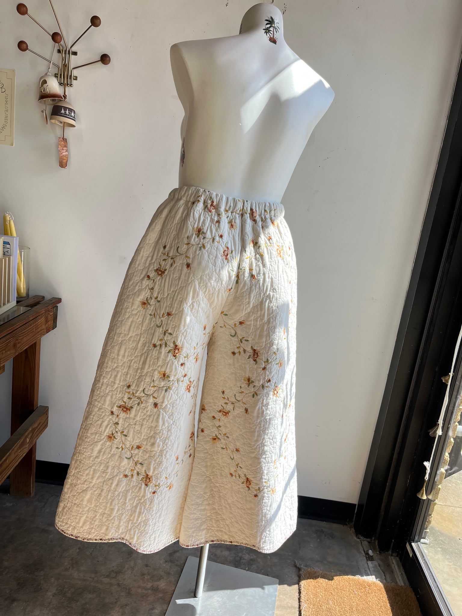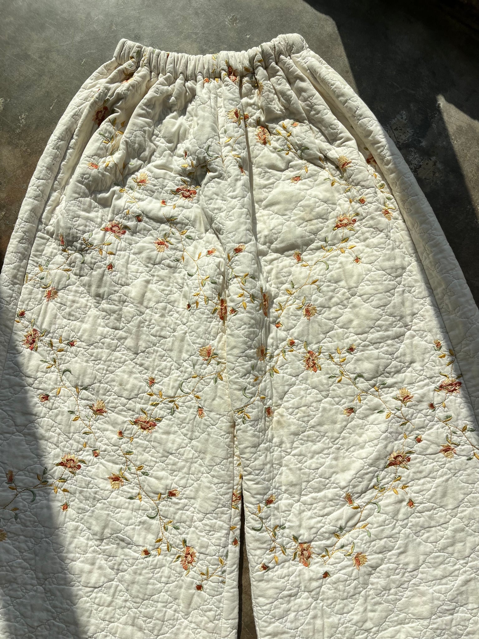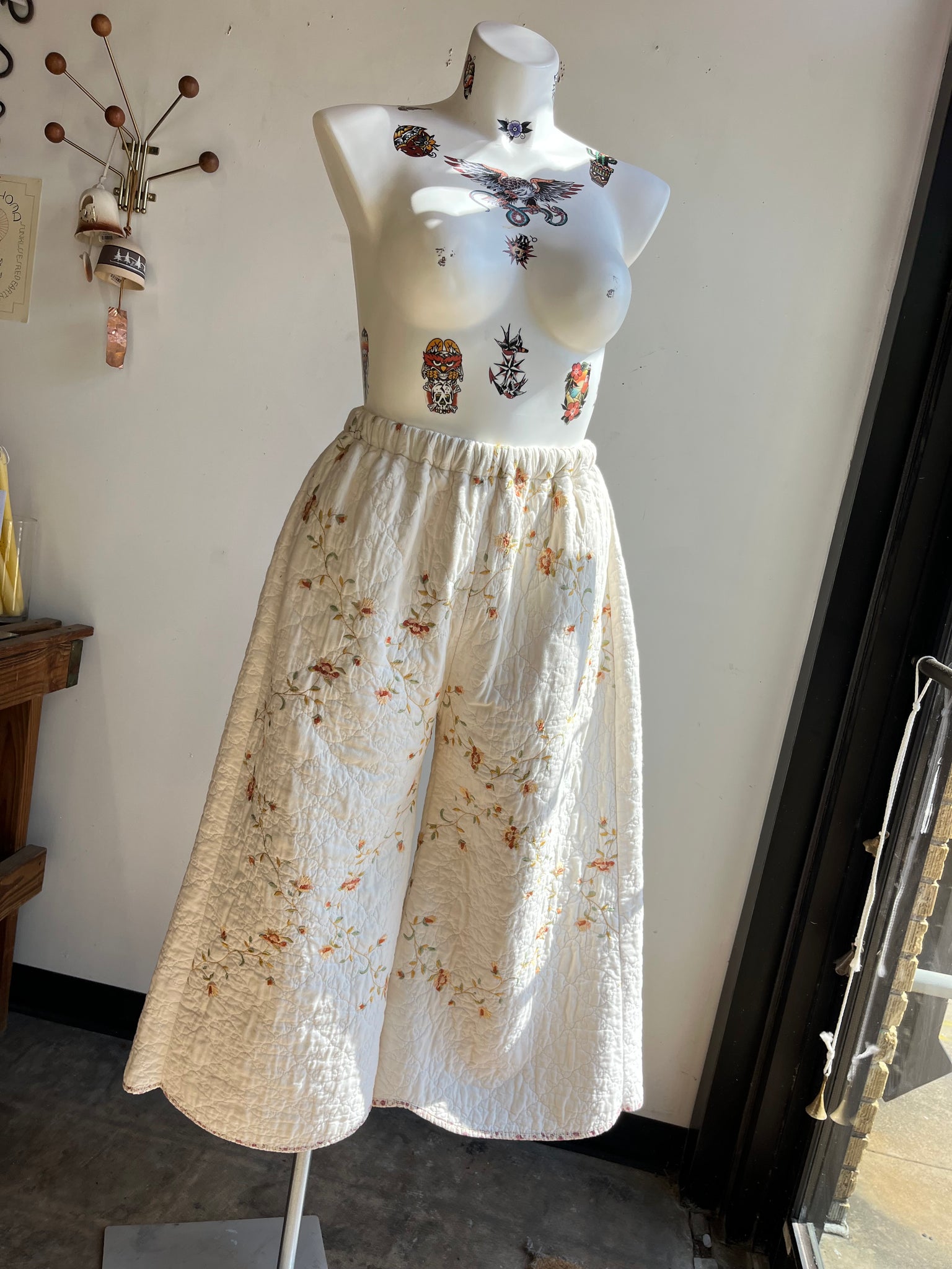These pants are made from a Embroidered Rose quilt. When it was found, it had several tears, so why not use the good parts for pants:) There is a light batting between the two layers, but I would say this a light weight quilt. Judging by the fabric, style, and that it is all hand stitched, I would say this is from the 1990s-Y2K. This pant is made from a vintage palazzo pant pattern and features a super wide leg, high waist, and elastic waist band to fit a variety of sizes