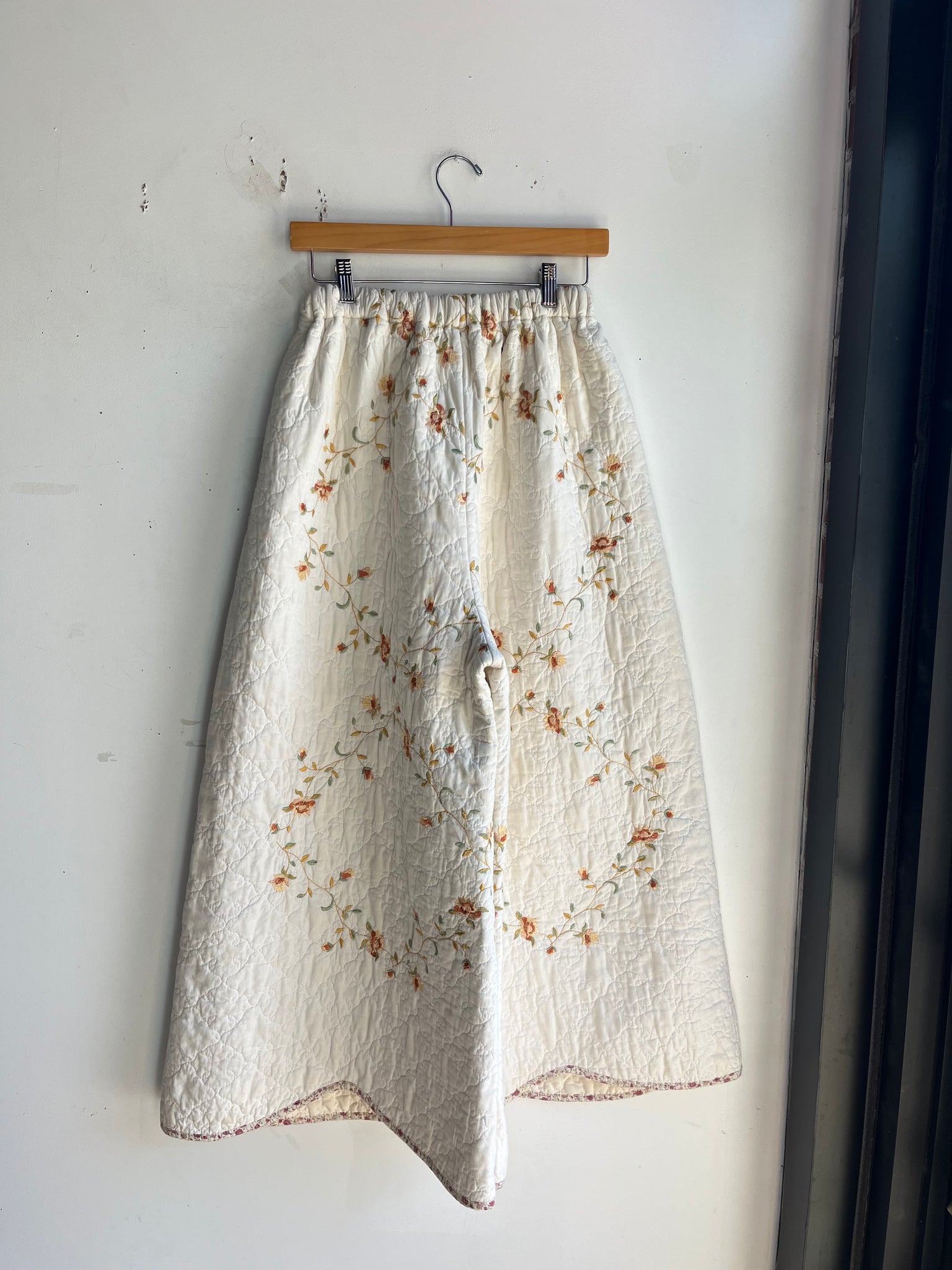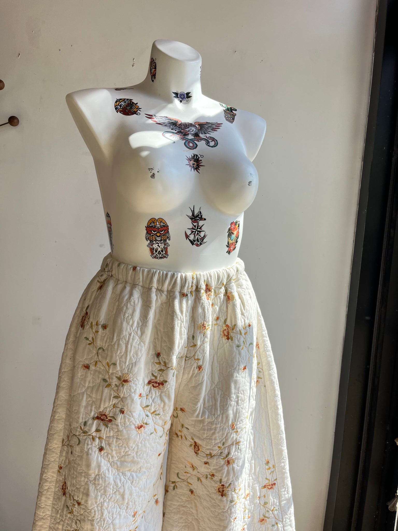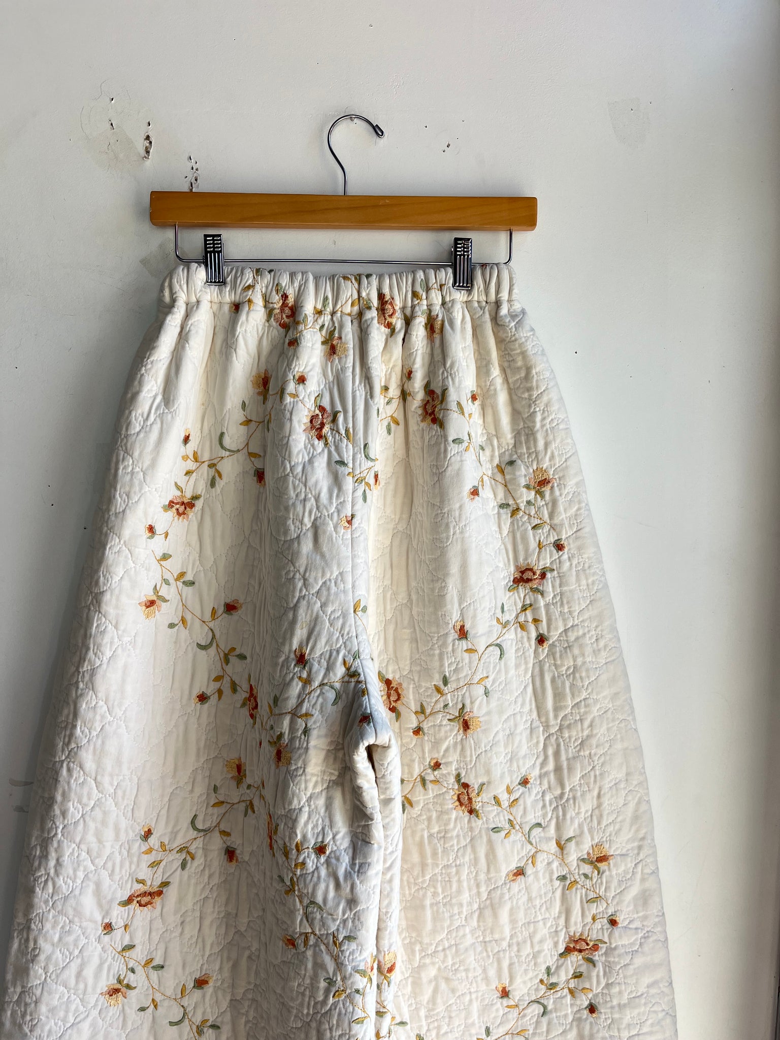 These pants are made from a Embroidered Rose quilt. When it was found, it had several tears, so why not use the good parts for pants:) There is a light batting between the two layers, but I would say this a light weight quilt. Judging by the fabric, style, and that it is all hand stitched, I would say this is from the 1990s-Y2K. This pant is made from a vintage palazzo pant pattern and features a super wide leg, high waist, and elastic waist band to fit a variety of sizes
