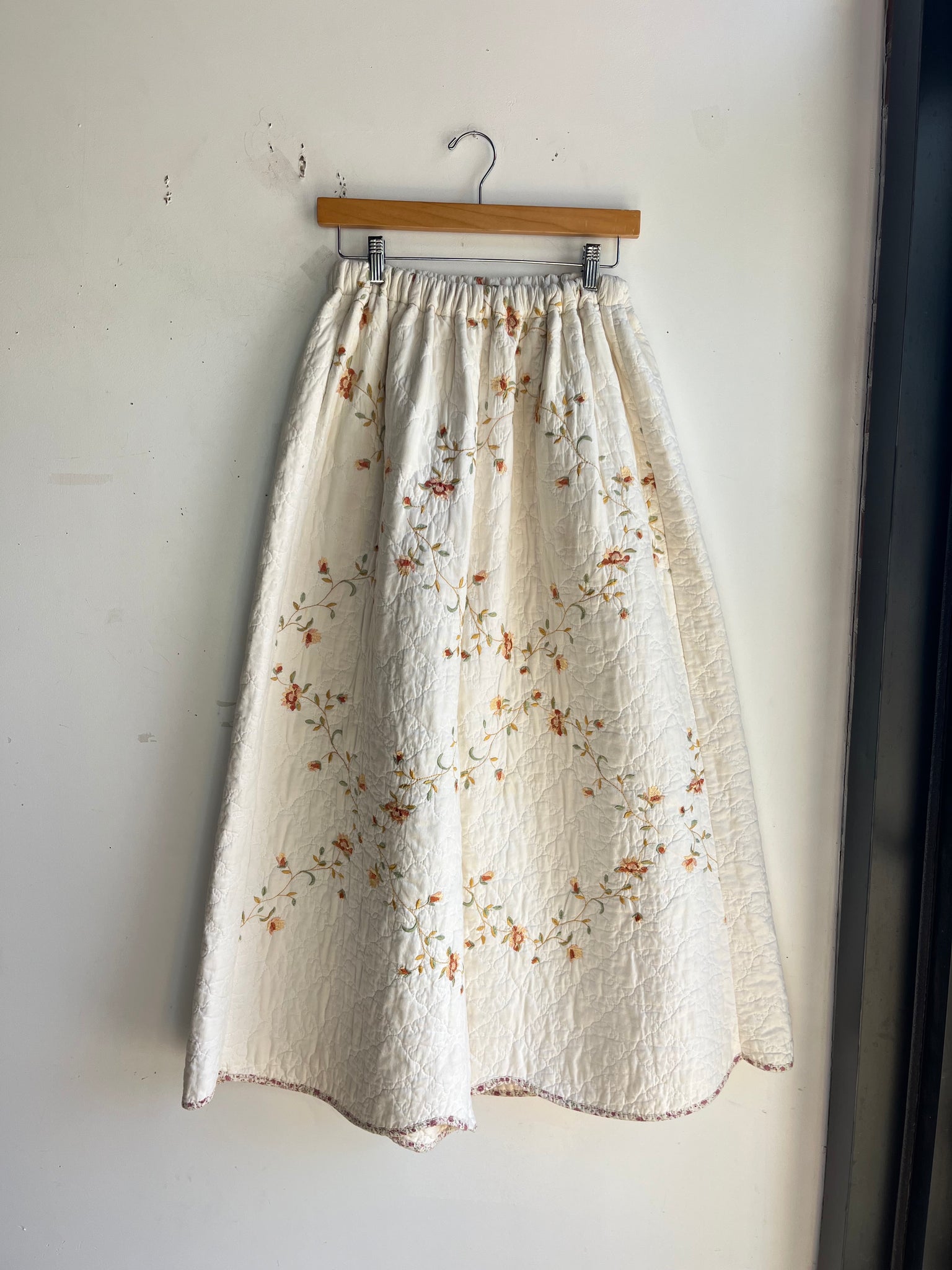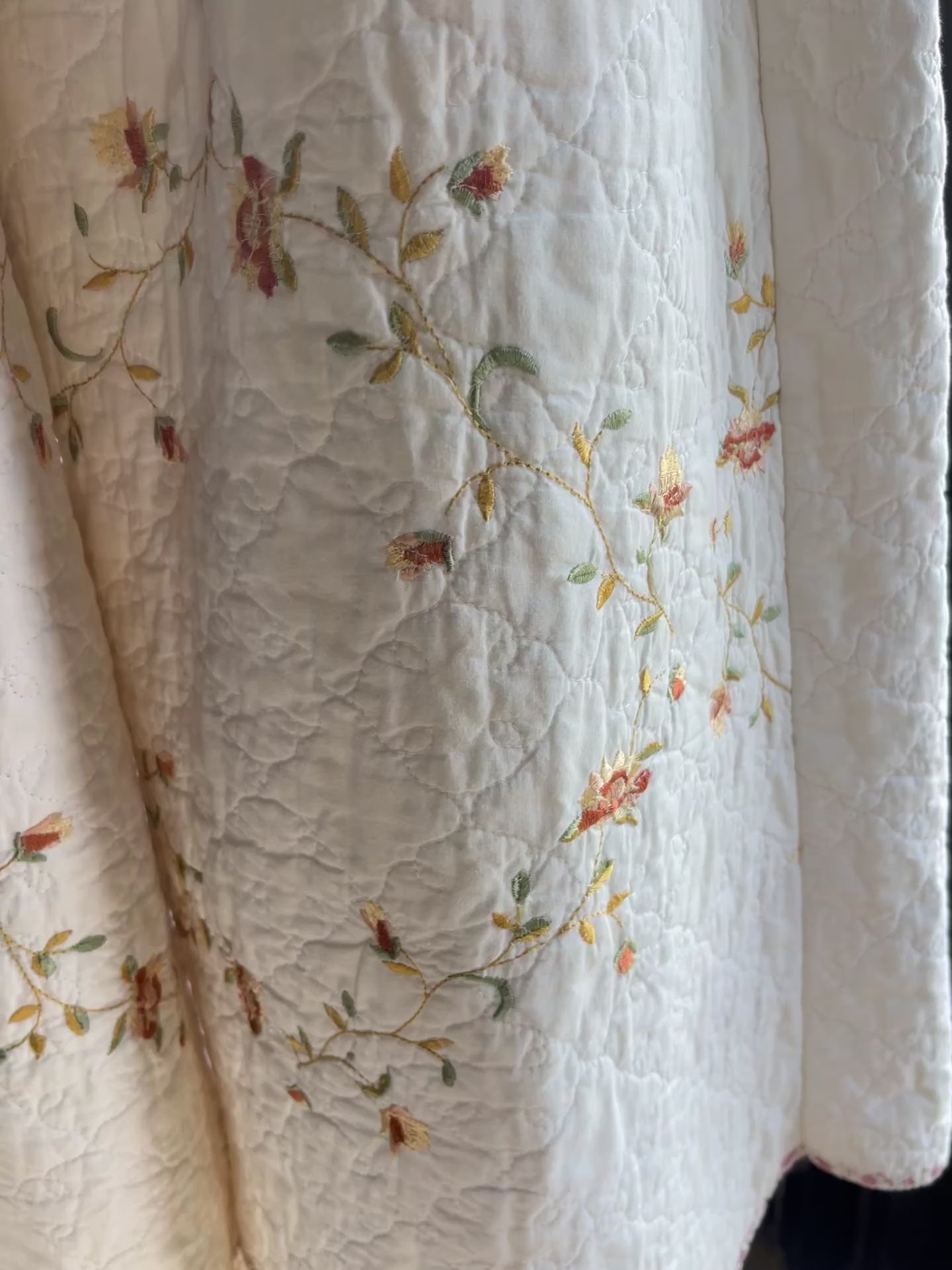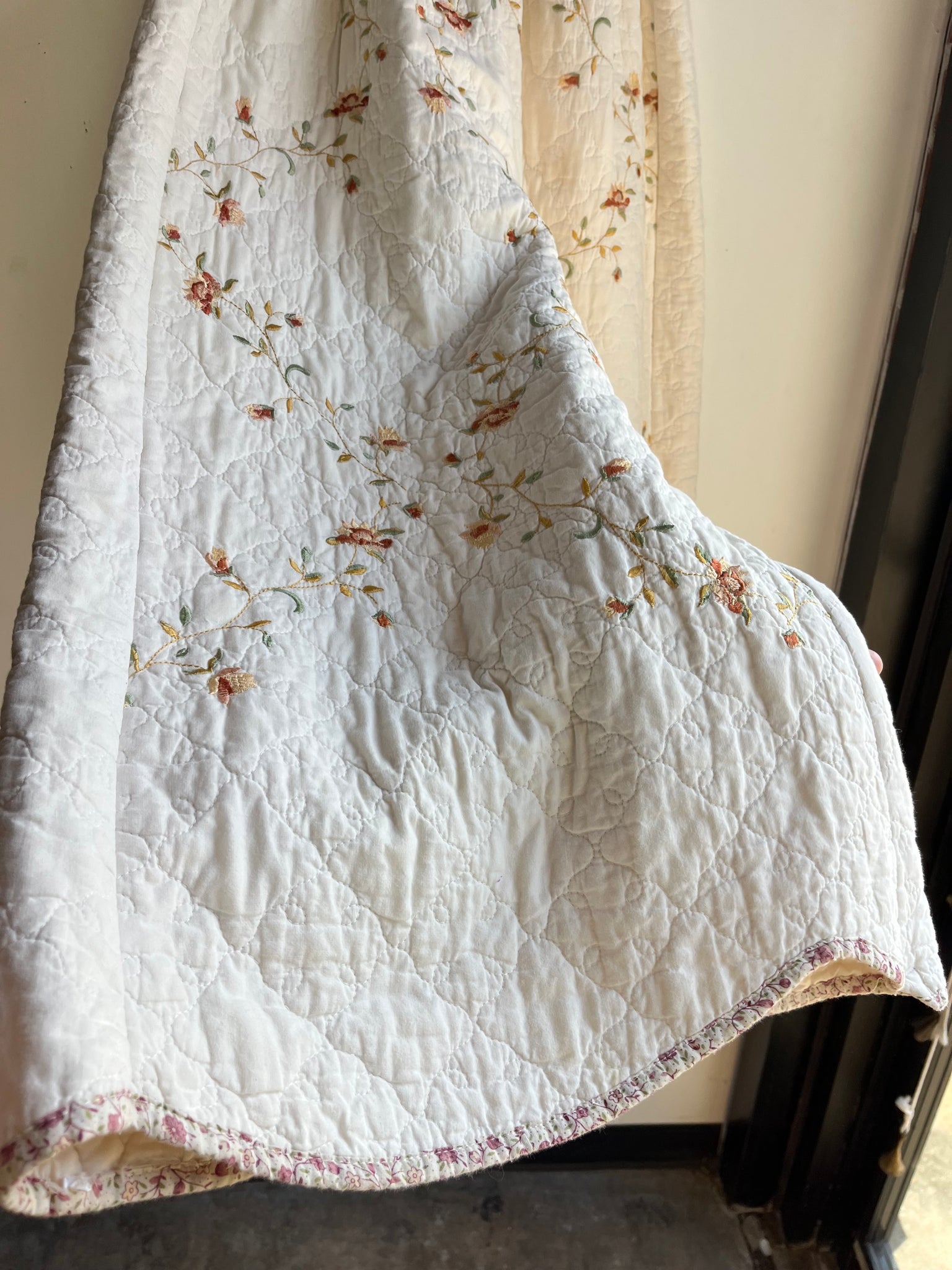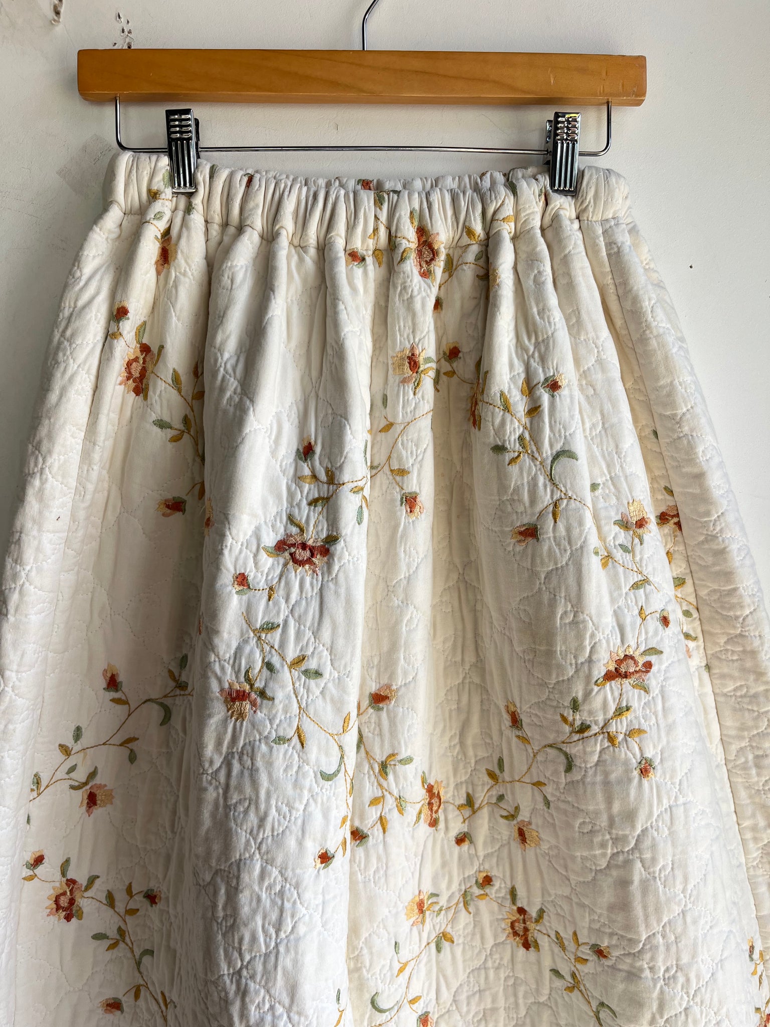 These pants are made from a Embroidered Rose quilt. When it was found, it had several tears, so why not use the good parts for pants:) There is a light batting between the two layers, but I would say this a light weight quilt. Judging by the fabric, style, and that it is all hand stitched, I would say this is from the 1990s-Y2K. This pant is made from a vintage palazzo pant pattern and features a super wide leg, high waist, and elastic waist band to fit a variety of sizes
