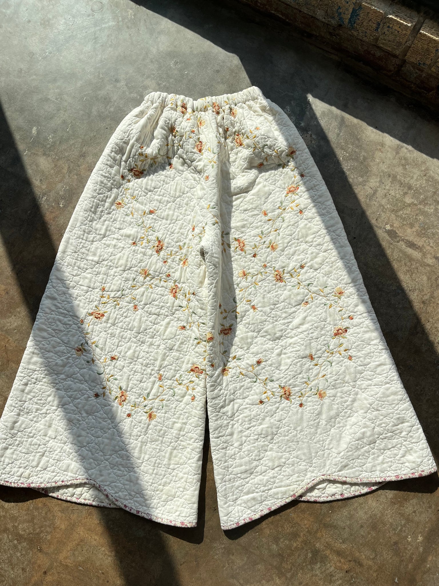 Handmade High Waist Quilt Palazzo Pants-90s Embroidered Rose with Scalloped Trim