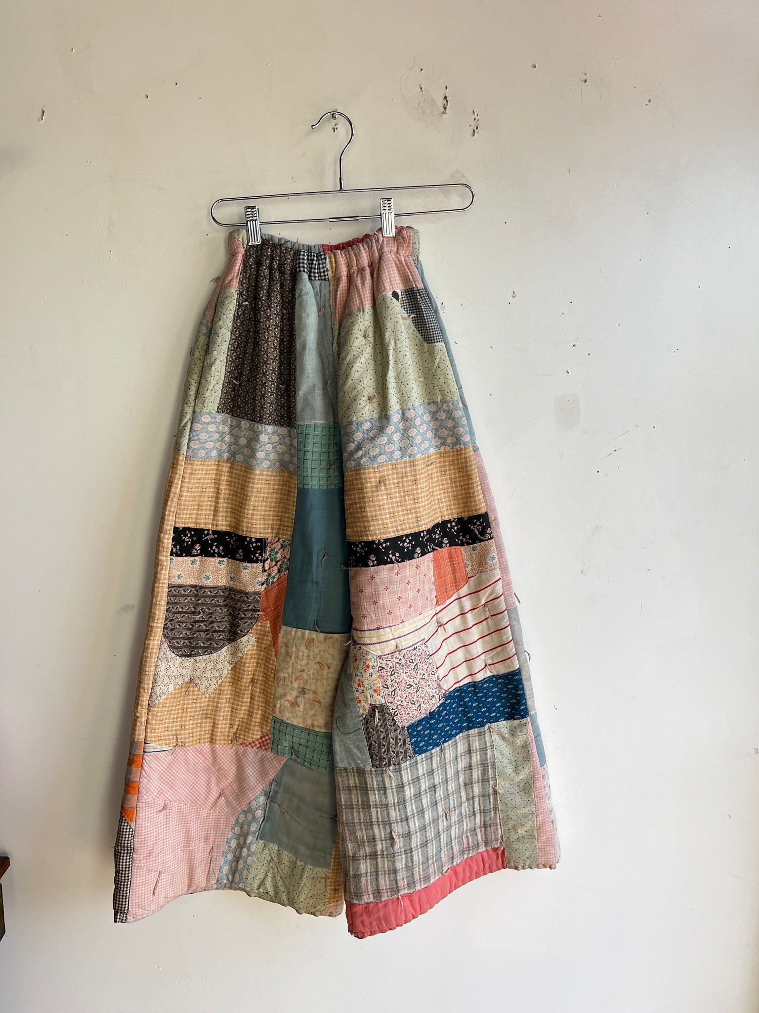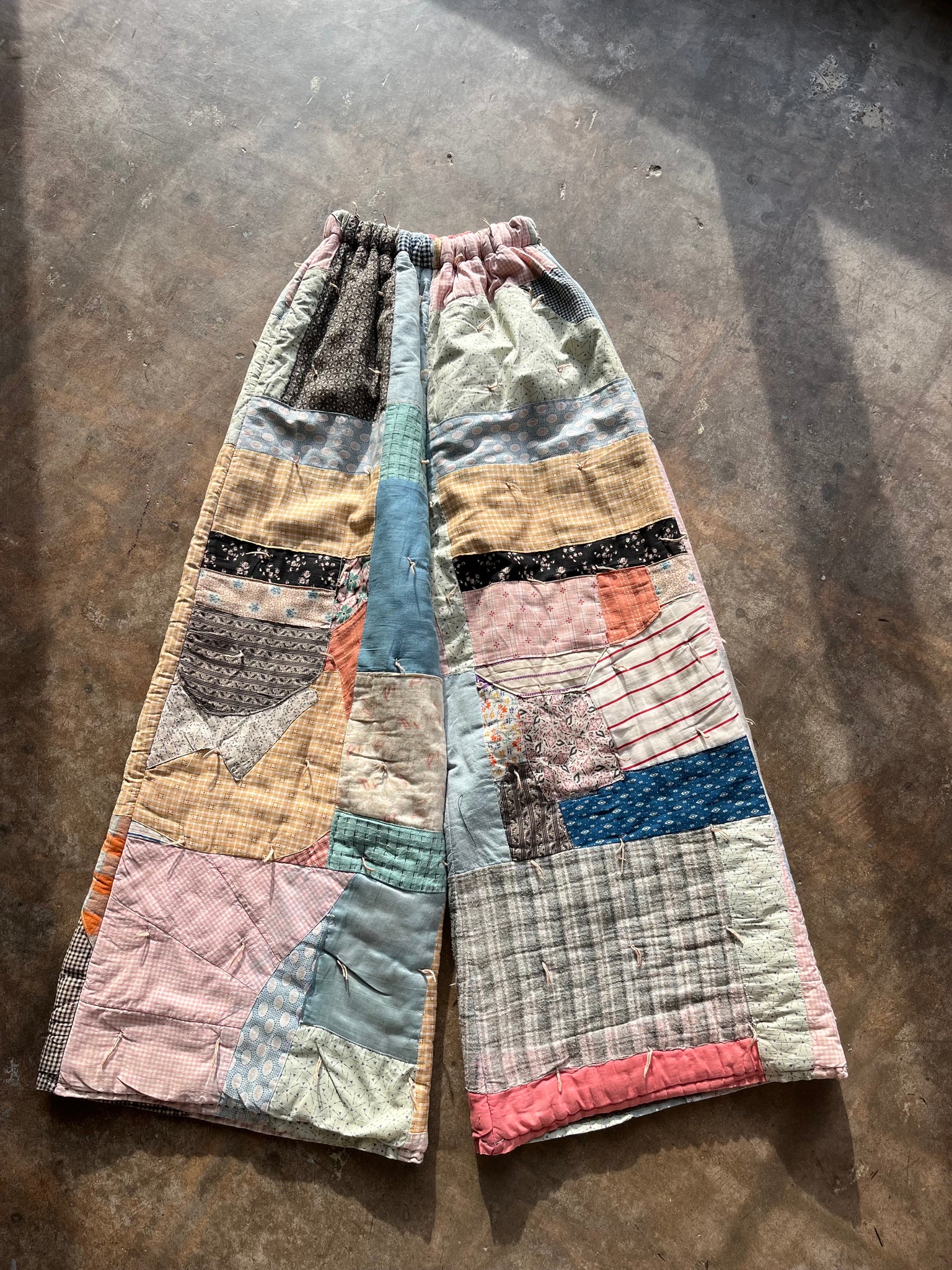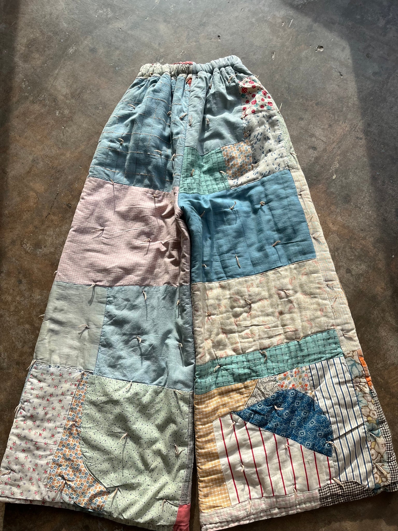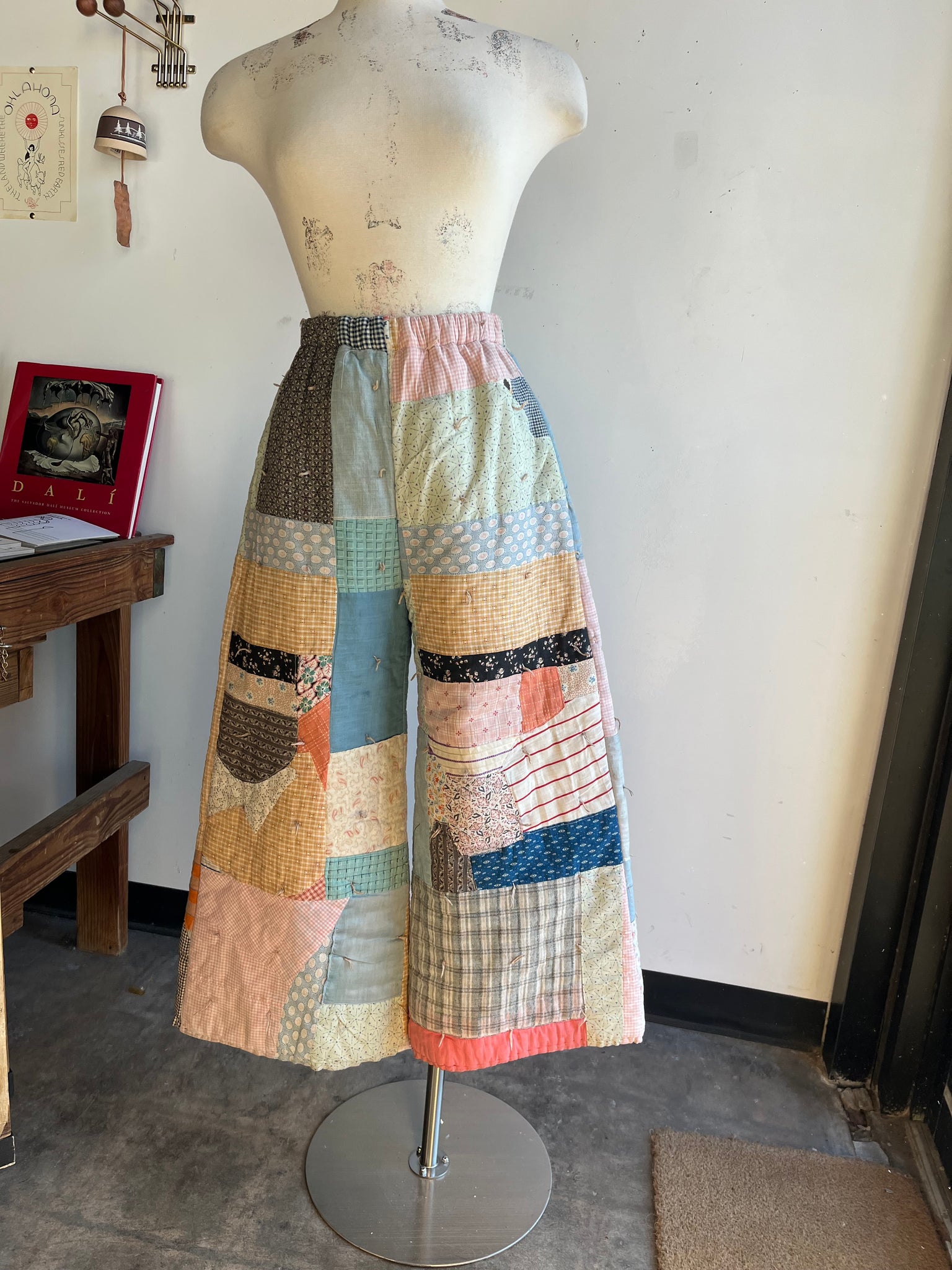 These pants are made from a vintage crazy quilt. When it was found, it was covered in tears, so why not use the good parts for pants:) There is a batting between the two layers, but I would say this a medium weight quilt. Judging by the fabric(particularly the calico pieces) and style I would say this is from the 1940s. This pant is made from a vintage palazzo pant pattern and features a super wide leg and elastic waist band to fit a variety of sizes. It also has inseam pockets for maximum comfort and utility
