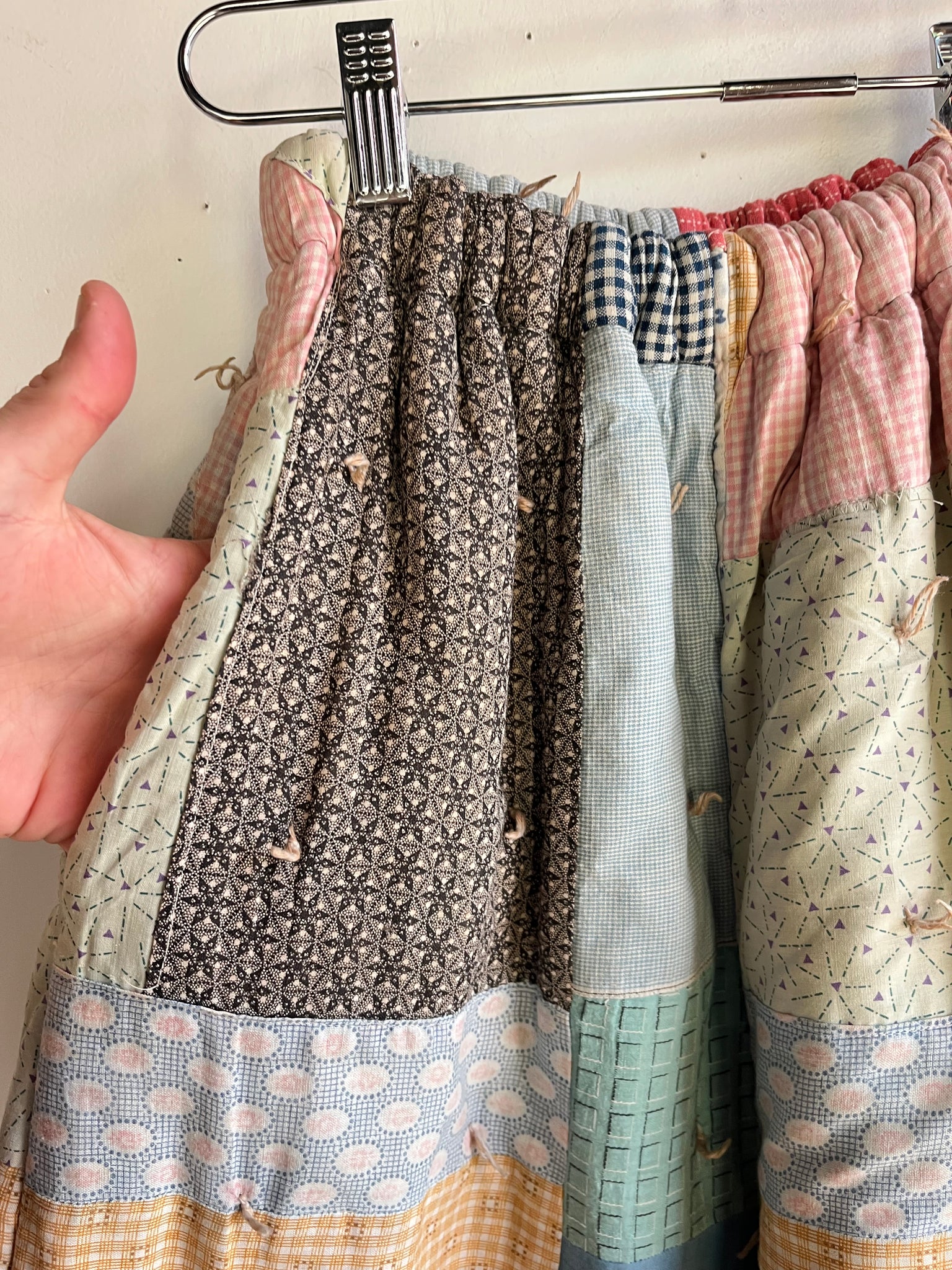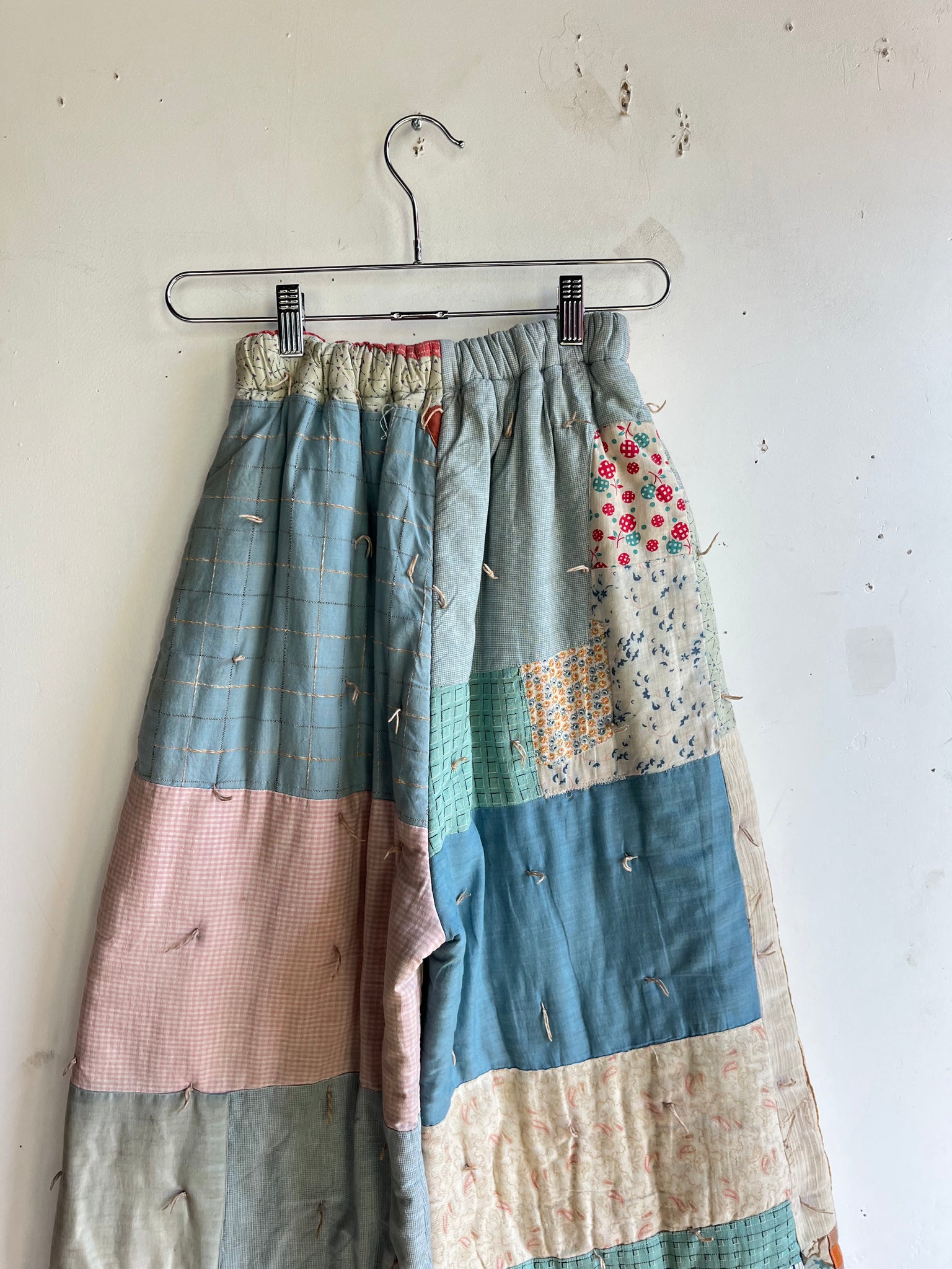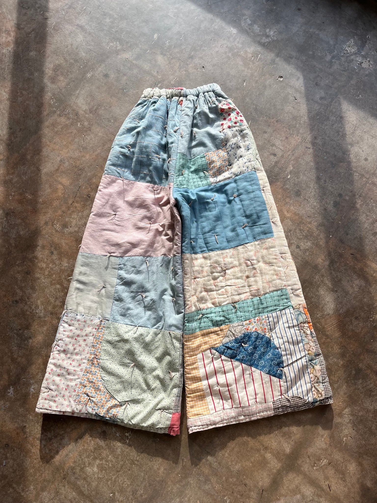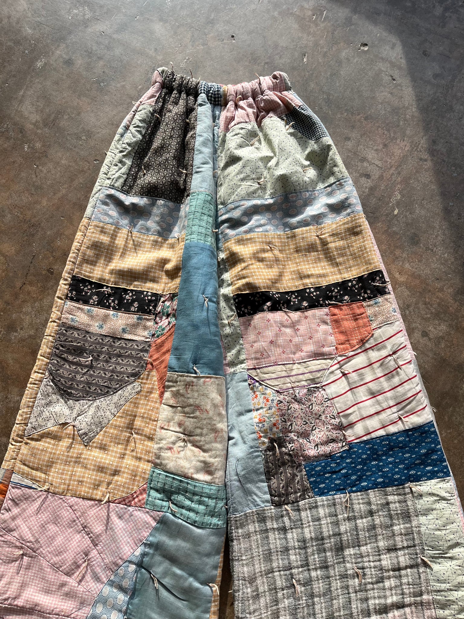 These pants are made from a vintage crazy quilt. When it was found, it was covered in tears, so why not use the good parts for pants:) There is a batting between the two layers, but I would say this a medium weight quilt. Judging by the fabric(particularly the calico pieces) and style I would say this is from the 1940s. This pant is made from a vintage palazzo pant pattern and features a super wide leg and elastic waist band to fit a variety of sizes. It also has inseam pockets for maximum comfort and utility