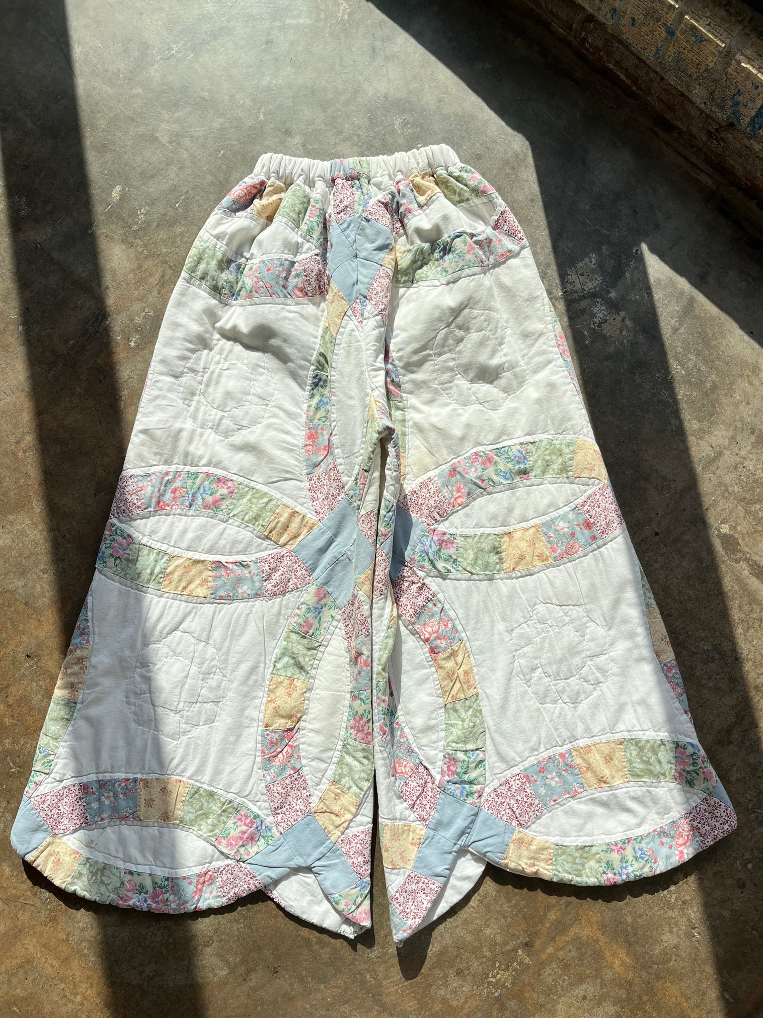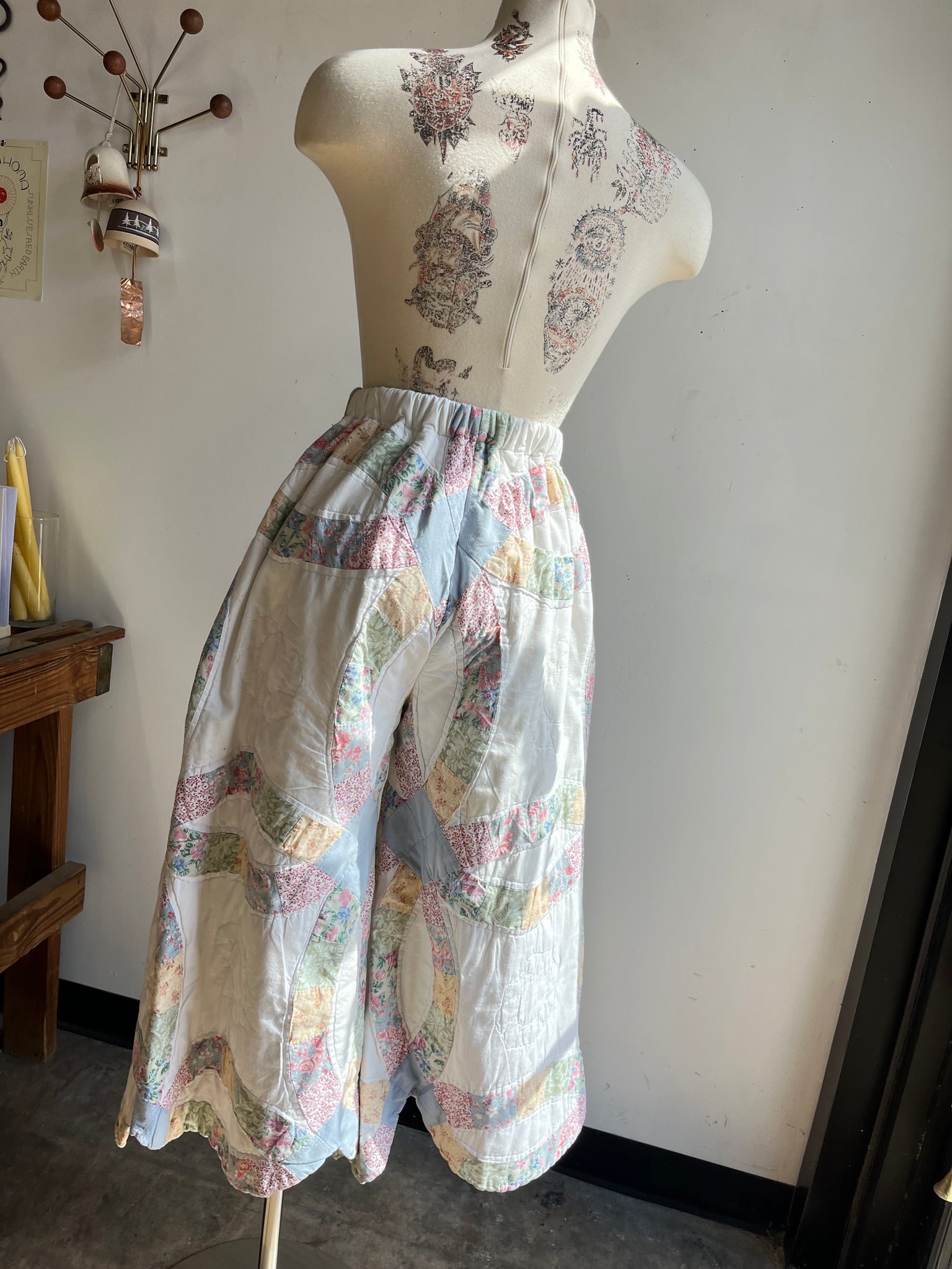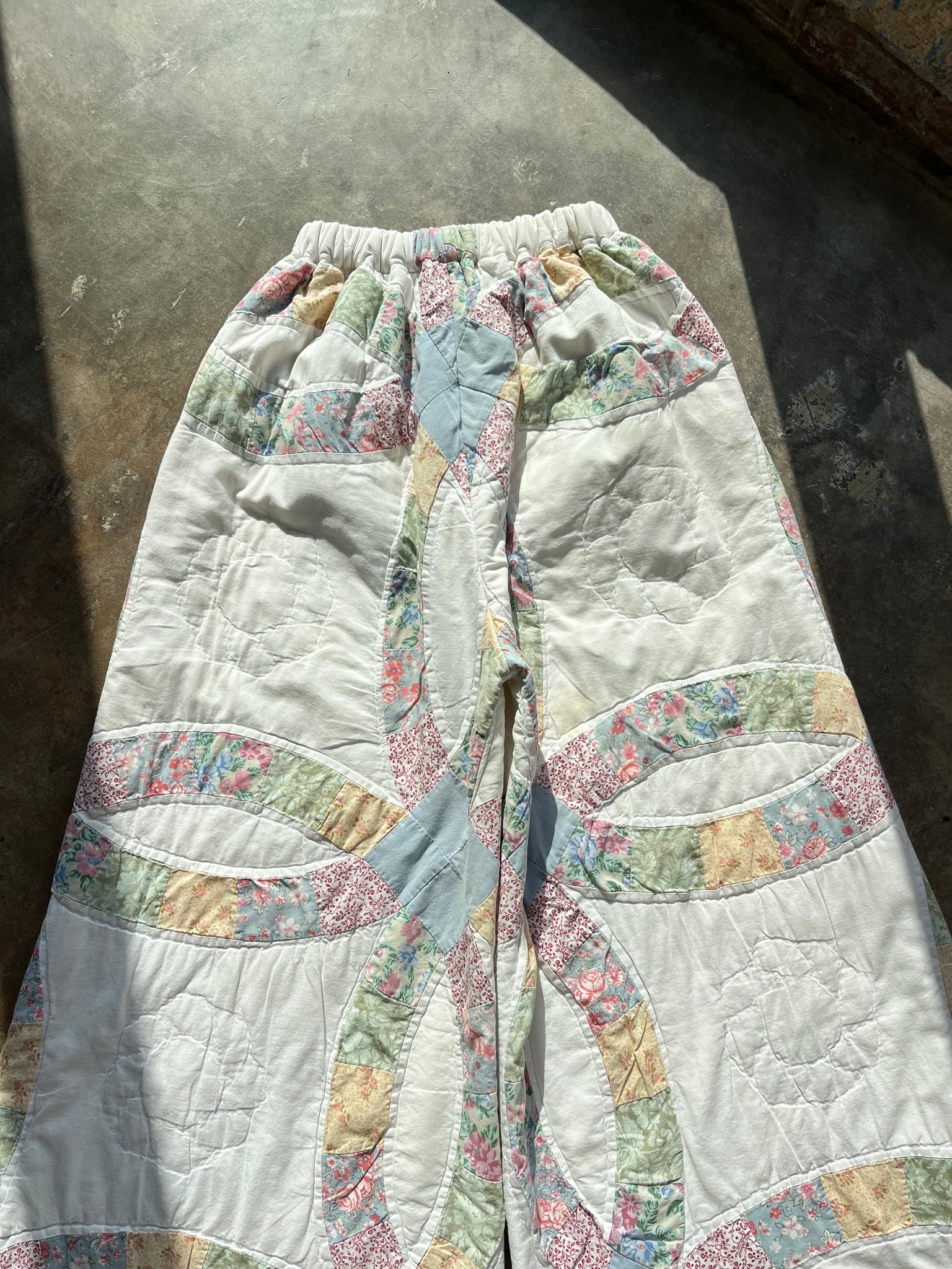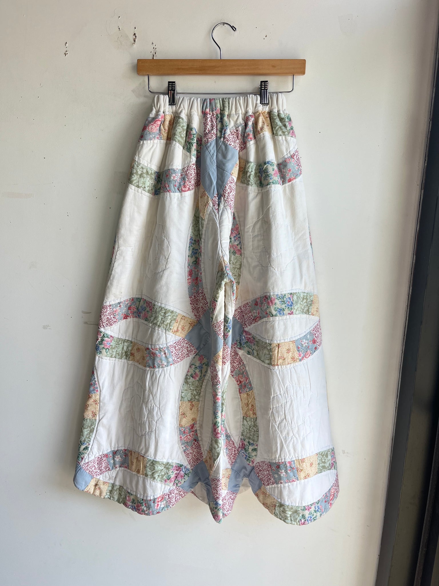 Handmade High Waist Quilt Palazzo Pants-Rare 80s Floral Double Wedding Ring With Scalloped Hem