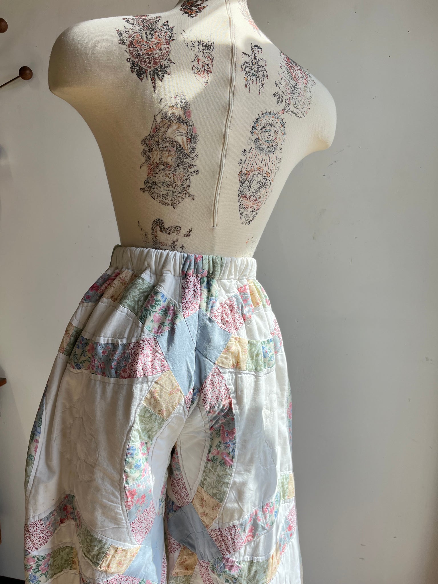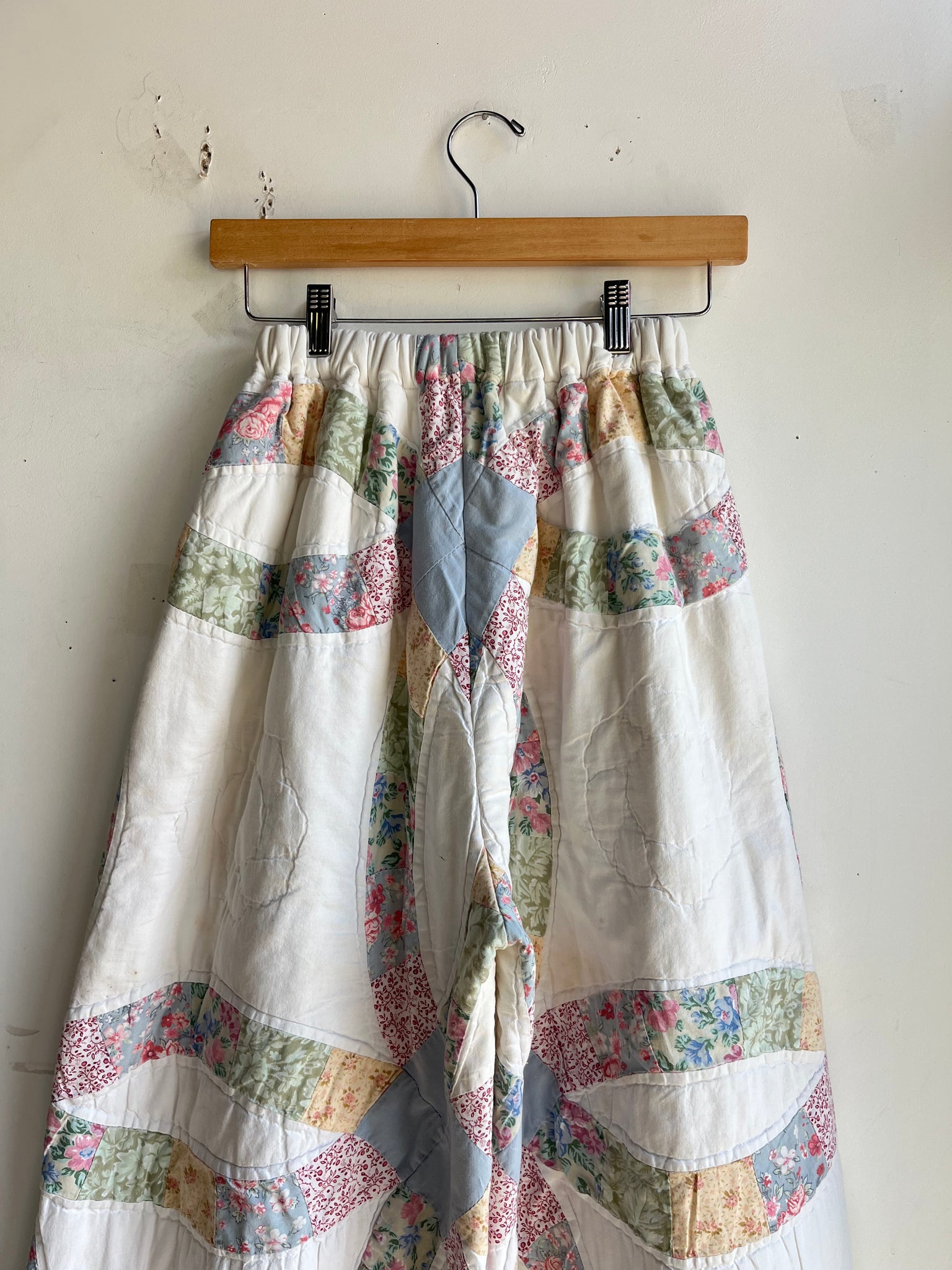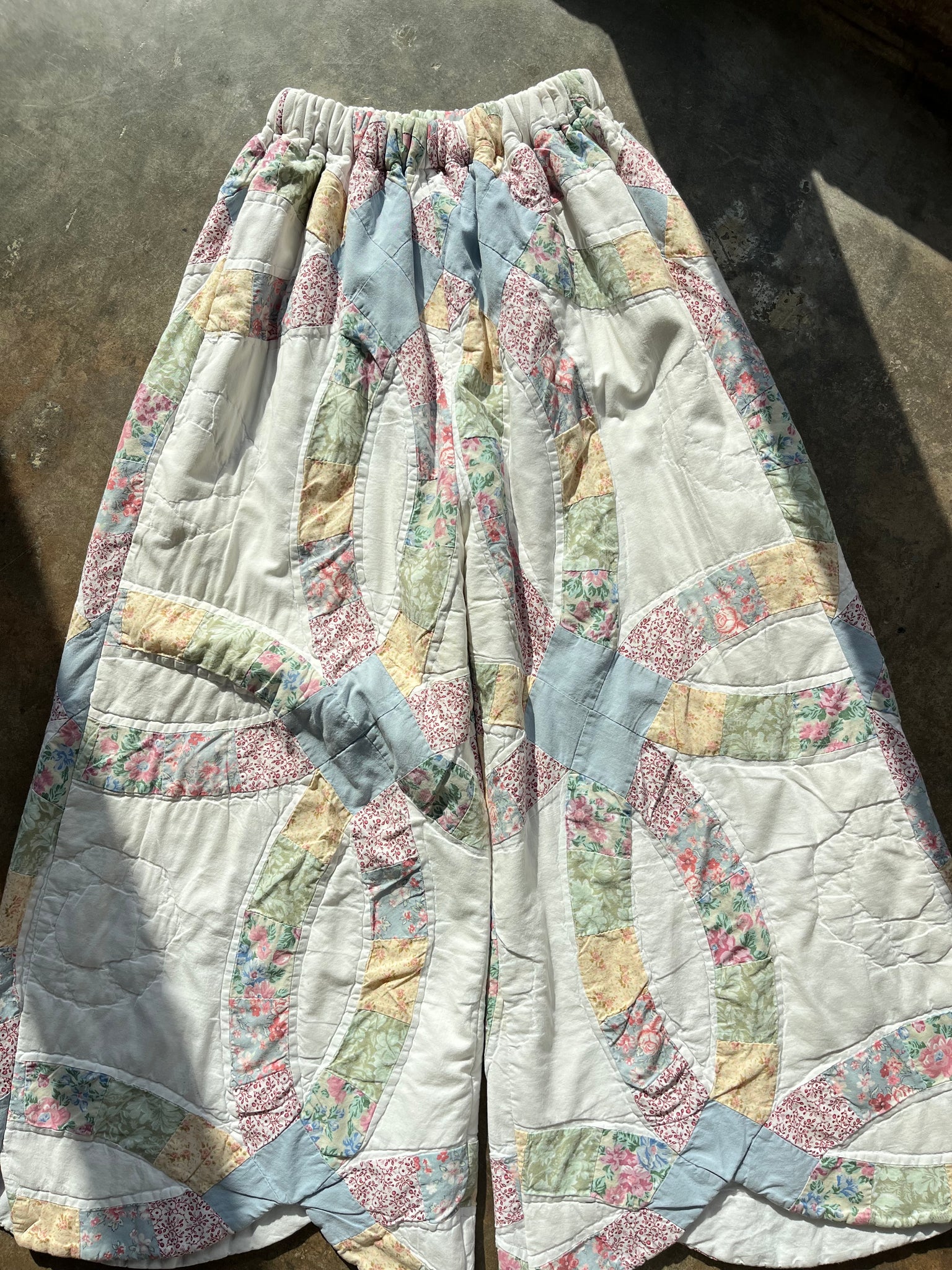 Handmade High Waist Quilt Palazzo Pants-Rare 80s Floral Double Wedding Ring With Scalloped Hem