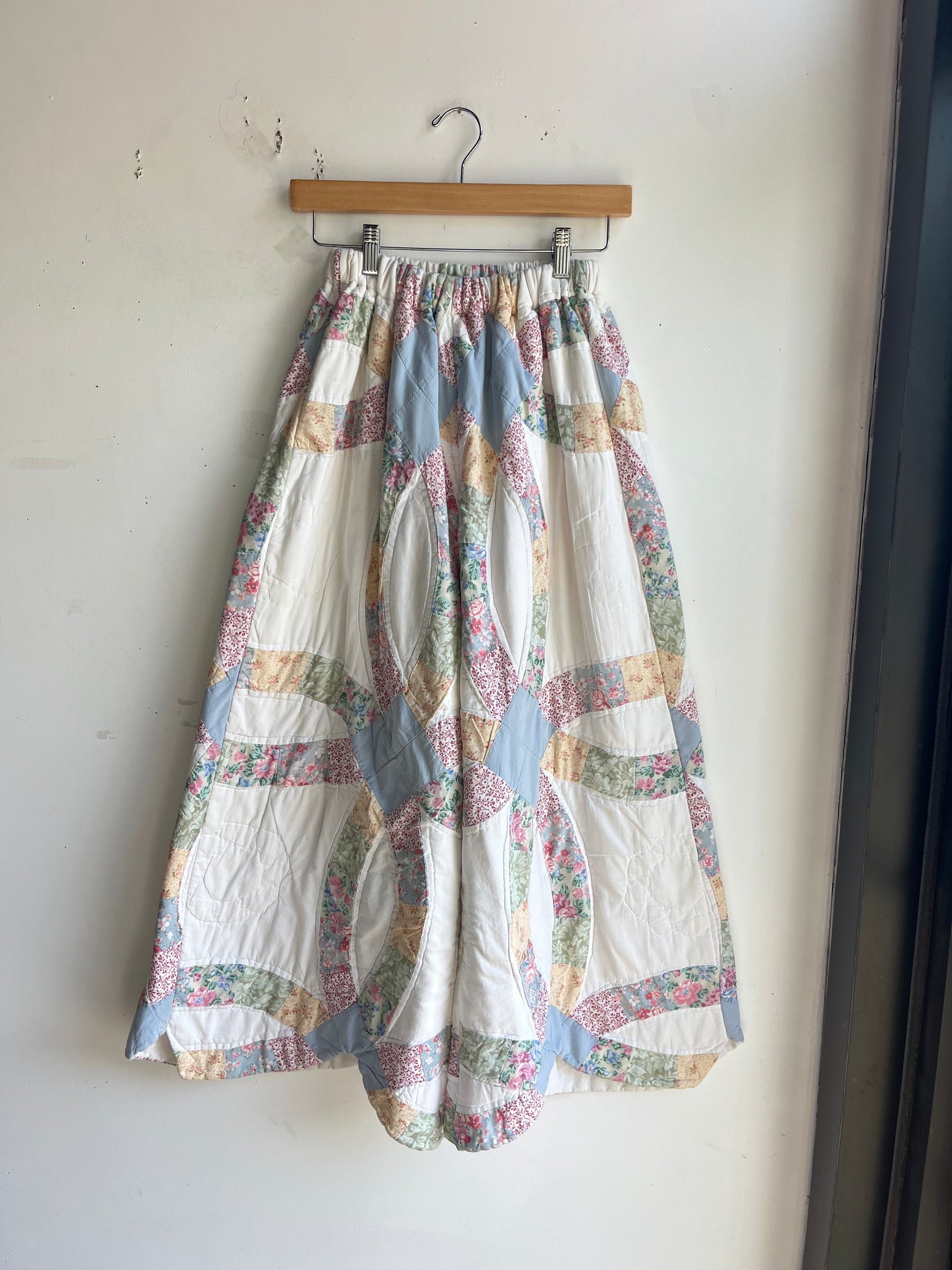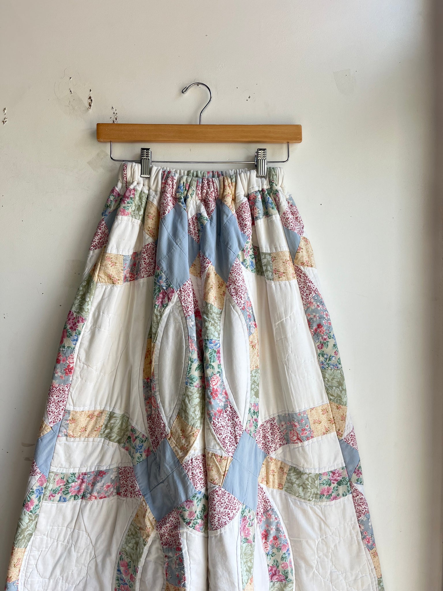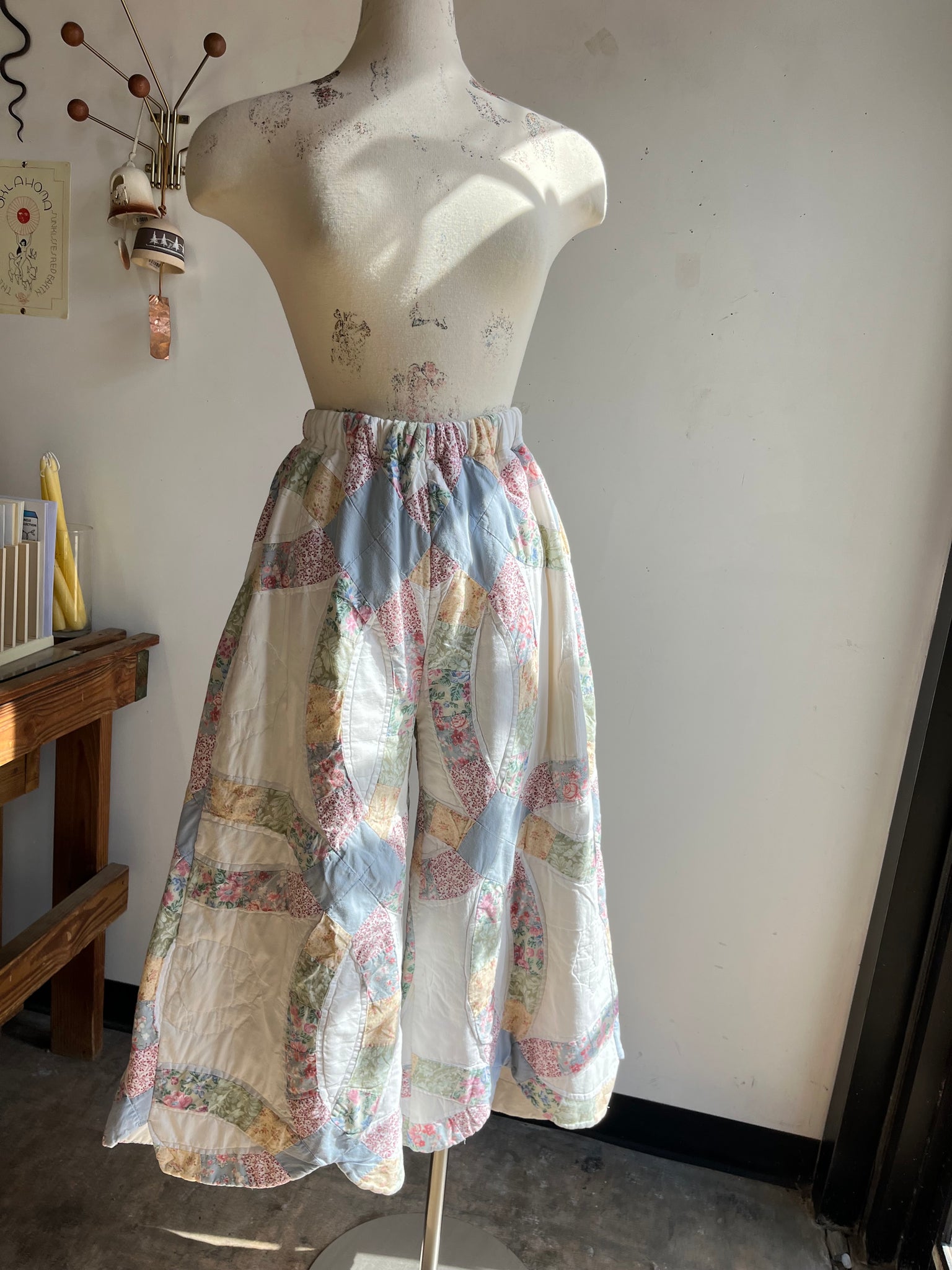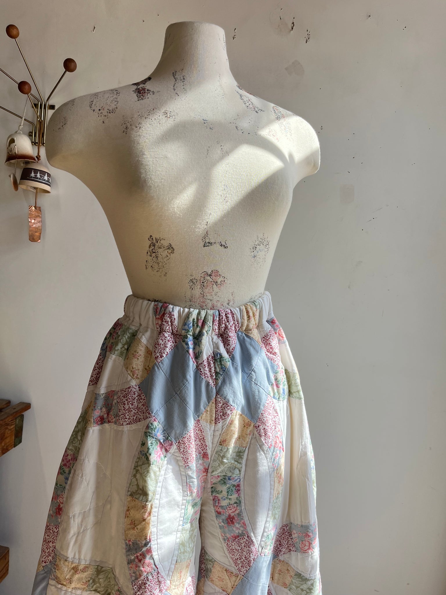 Handmade High Waist Quilt Palazzo Pants-Rare 80s Floral Double Wedding Ring With Scalloped Hem