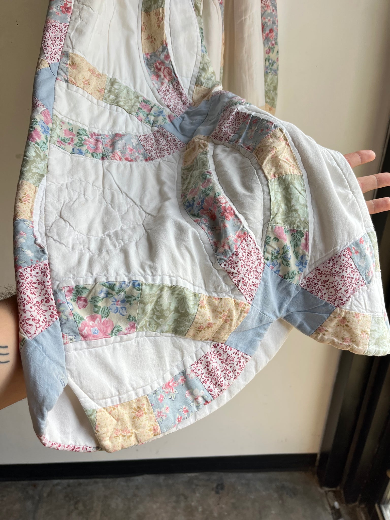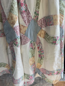 These pants are made from a hand stitched and embroidered double wedding ring quilt. When it was found, it had several tears and stains, so why not use the good parts for pants:) There is a light cotton batting between the two layers, but I would say this a light weight quilt. Judging by the fabric, style, and that it is all hand stitched, I would say this is from the 1980s-1990s. This pant is made from a vintage palazzo pant pattern and features a super wide leg, high waist and elastic waist band to fit a variety of sizes
