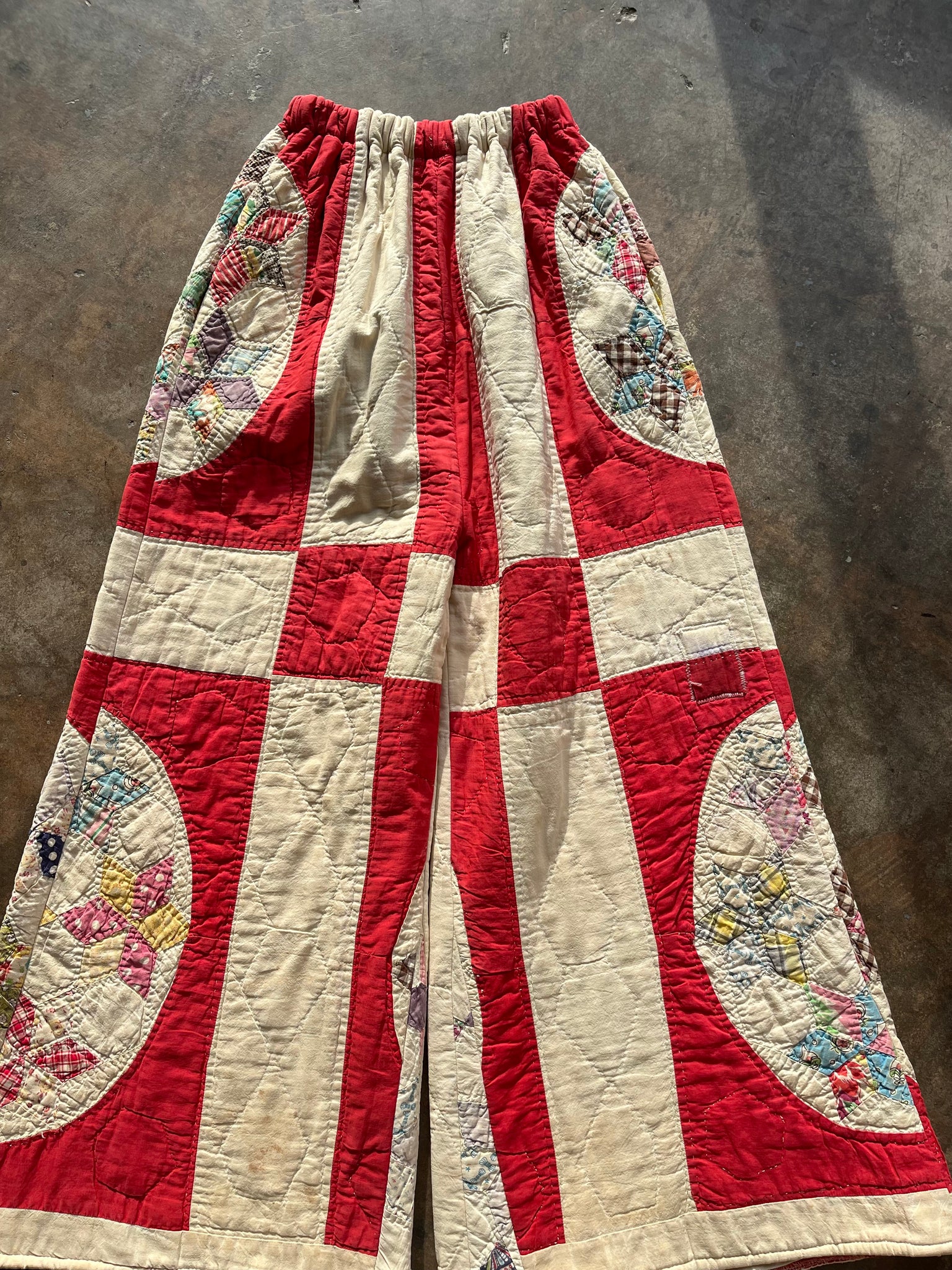 These pants are made from a vintage Seven Stars for Seven Sisters quilt When it was found, it was covered in tears, so why not use the good parts for pants:) There is a light batting between the two layers, but I would say this a light weight quilt. Judging by the fabric, style, and that it is all hand stitched, I would say this is from the 1920s-1930s. This pant is made from a vintage palazzo pant pattern and features a super wide leg and elastic waist band to fit a variety of sizes. It also has inseam pockets for maximum comfort and utility