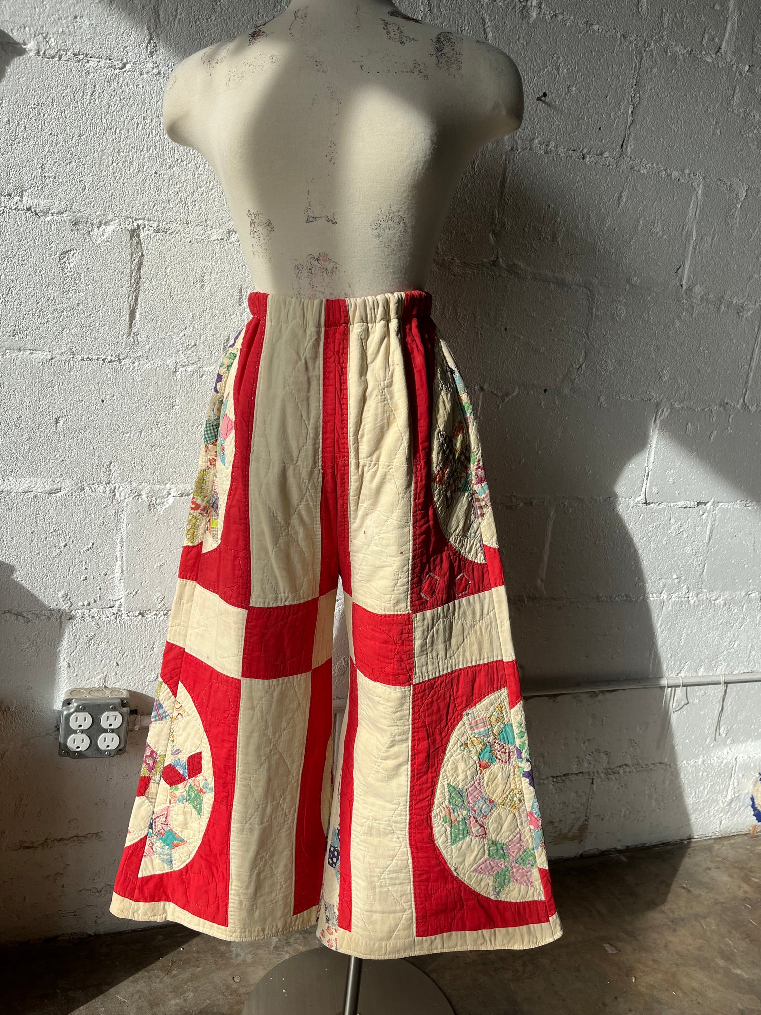 These pants are made from a vintage Seven Stars for Seven Sisters quilt When it was found, it was covered in tears, so why not use the good parts for pants:) There is a light batting between the two layers, but I would say this a light weight quilt. Judging by the fabric, style, and that it is all hand stitched, I would say this is from the 1920s-1930s. This pant is made from a vintage palazzo pant pattern and features a super wide leg and elastic waist band to fit a variety of sizes. It also has inseam pockets for maximum comfort and utility