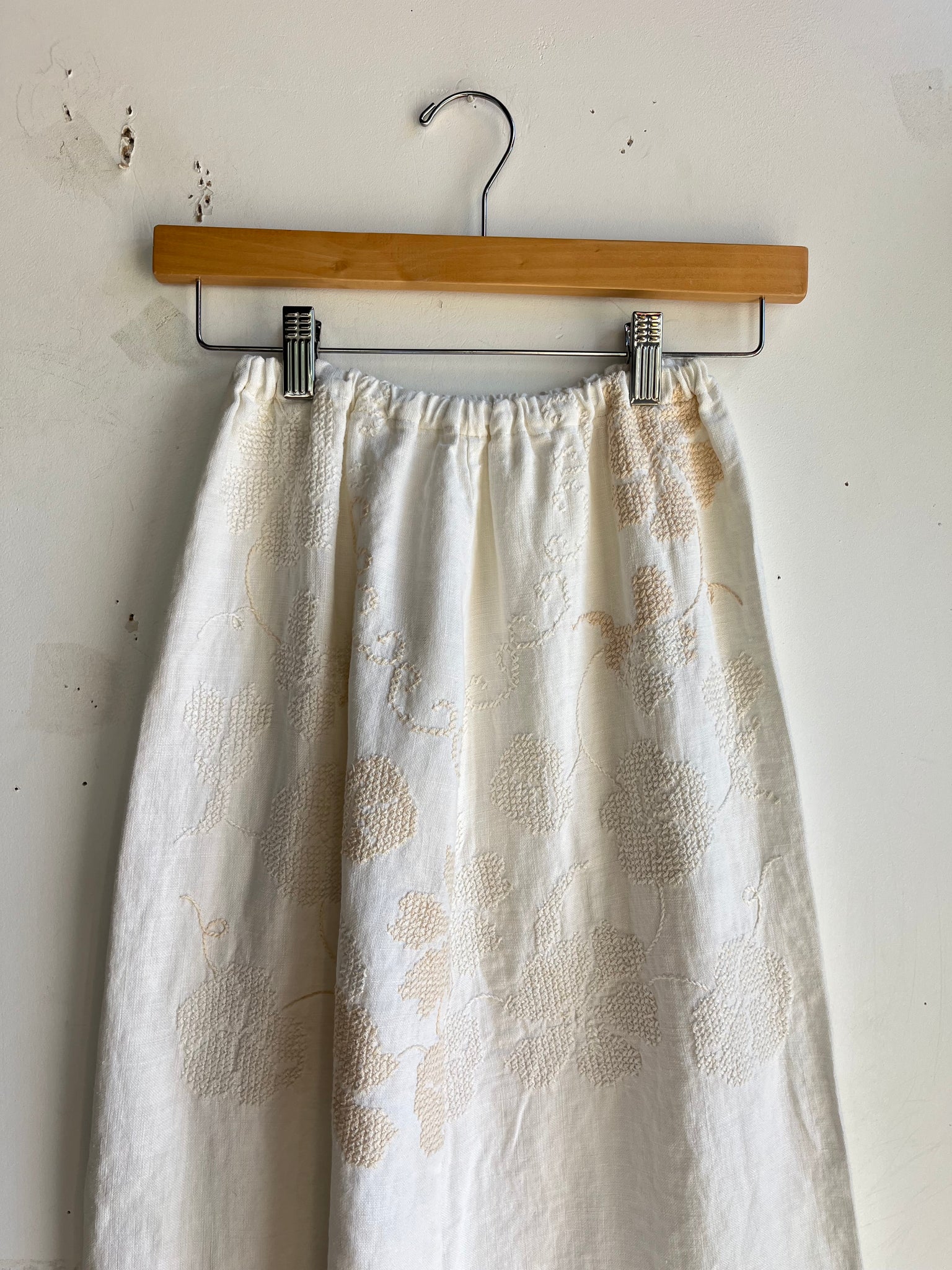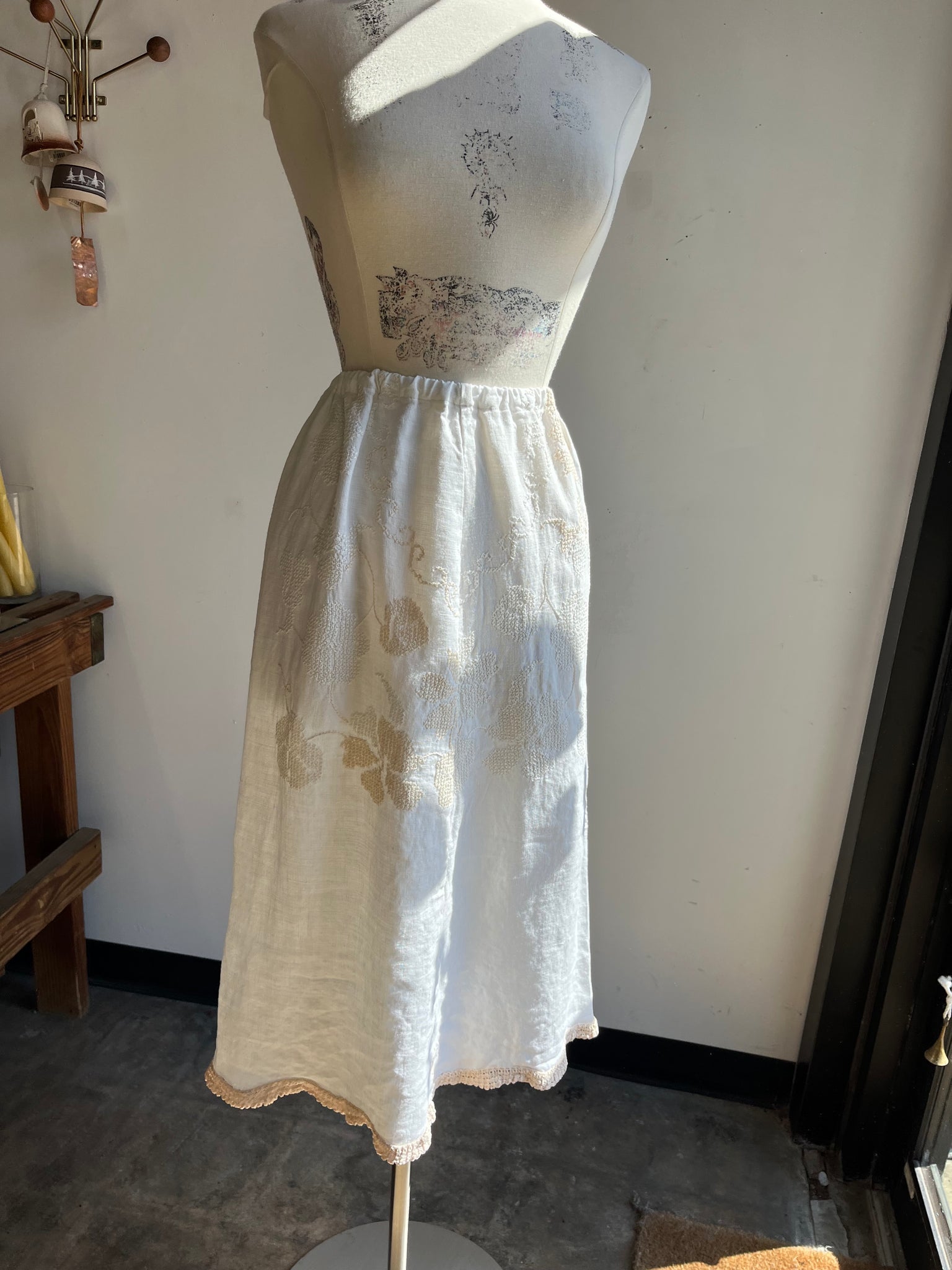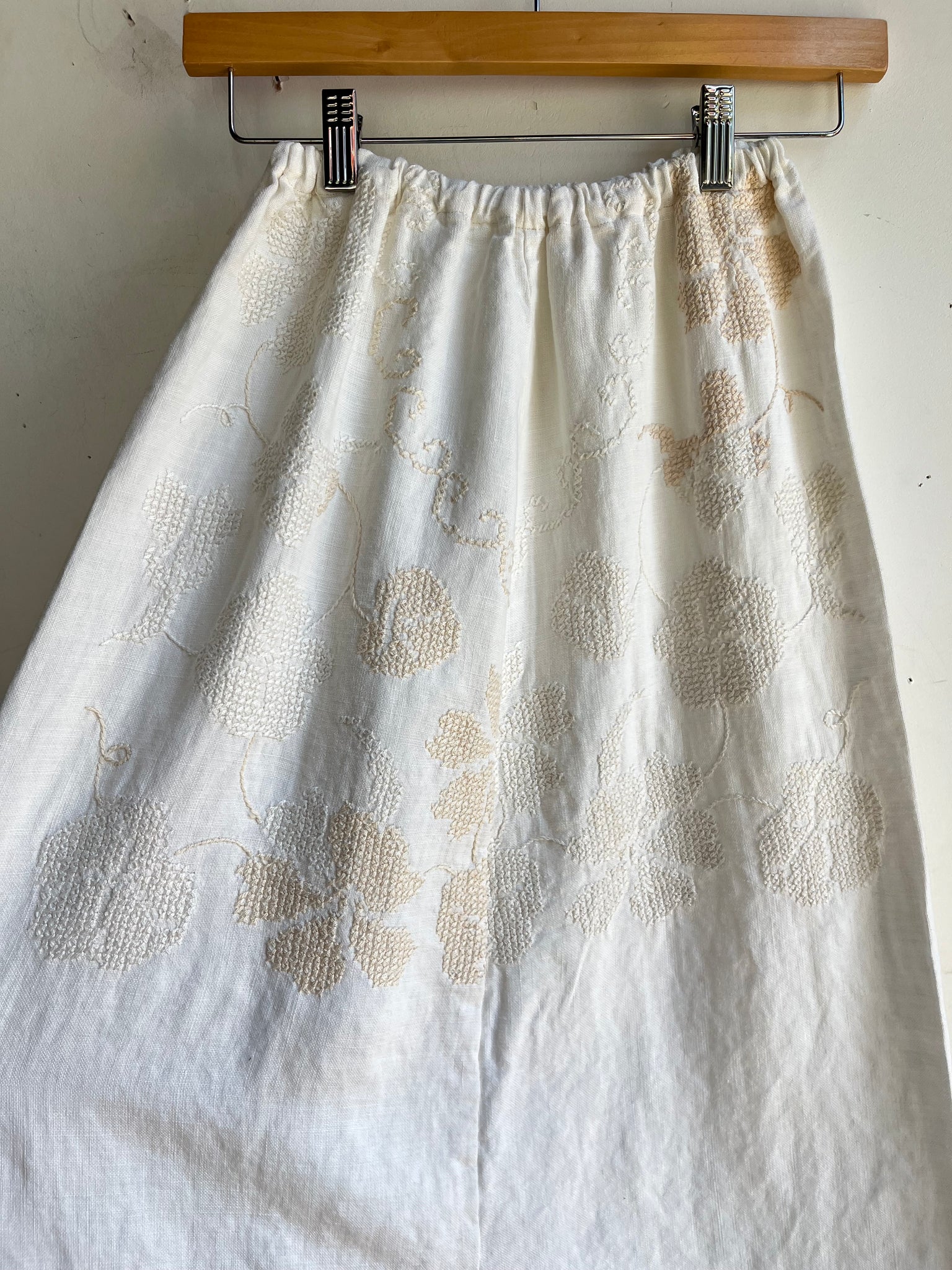 This skirt is made from a vintage (possibly antique) embroidered linen tablecloth. Judging by the fabric and style,I would say this is from the 1930s-1940s. This Skirt is cut in an a-line pattern and features an elastic waistband to fit a variety of sizes