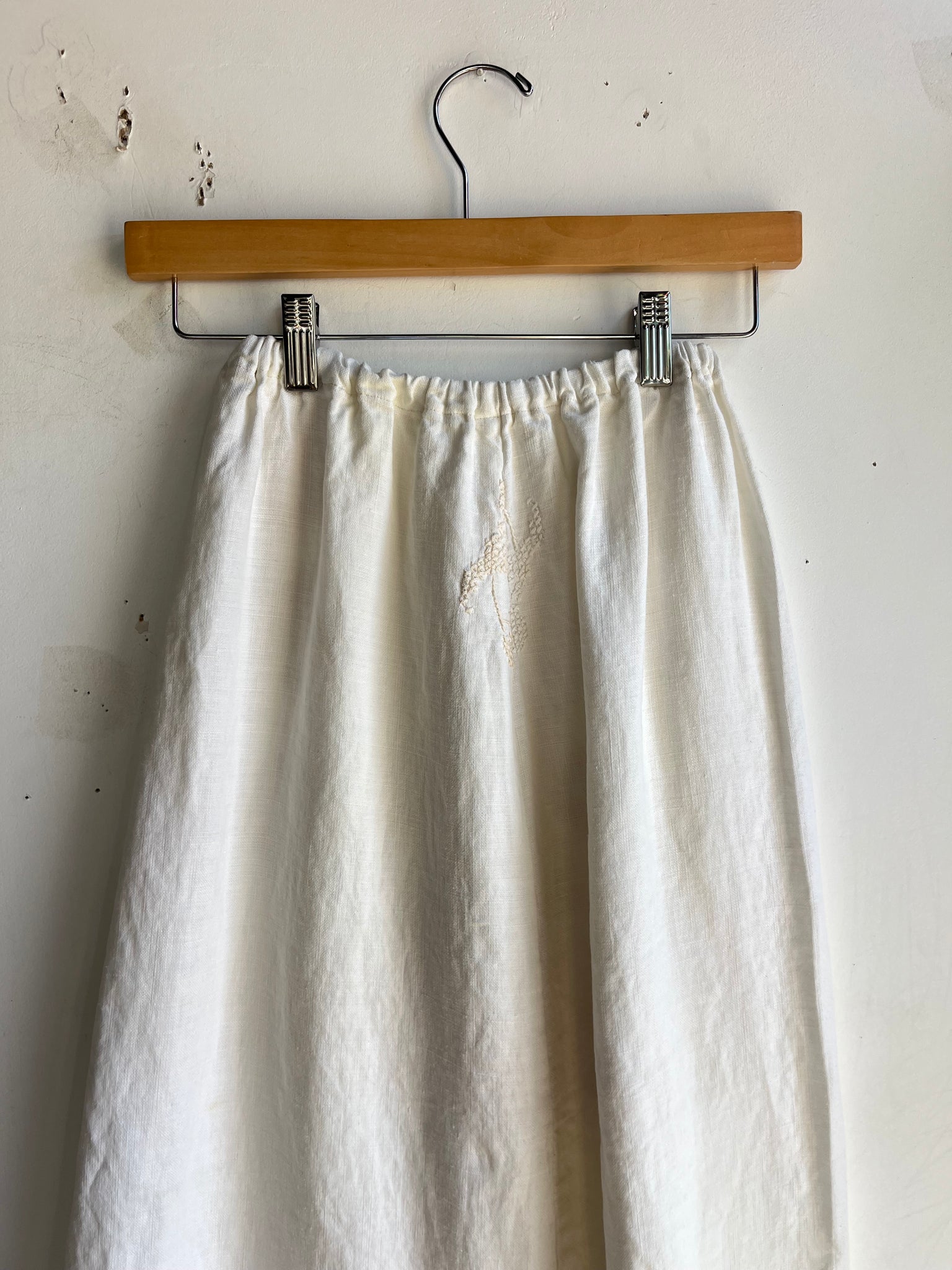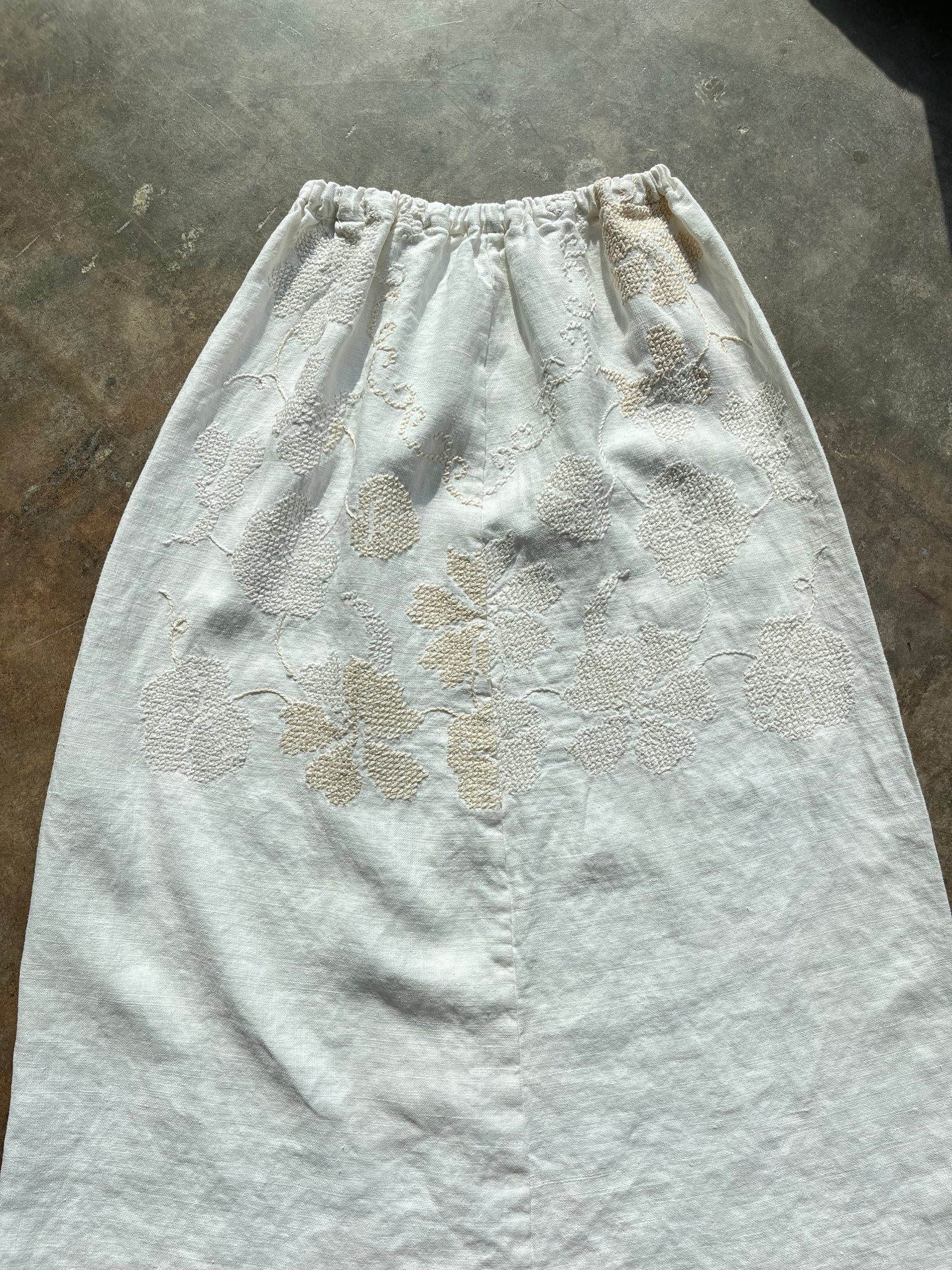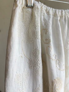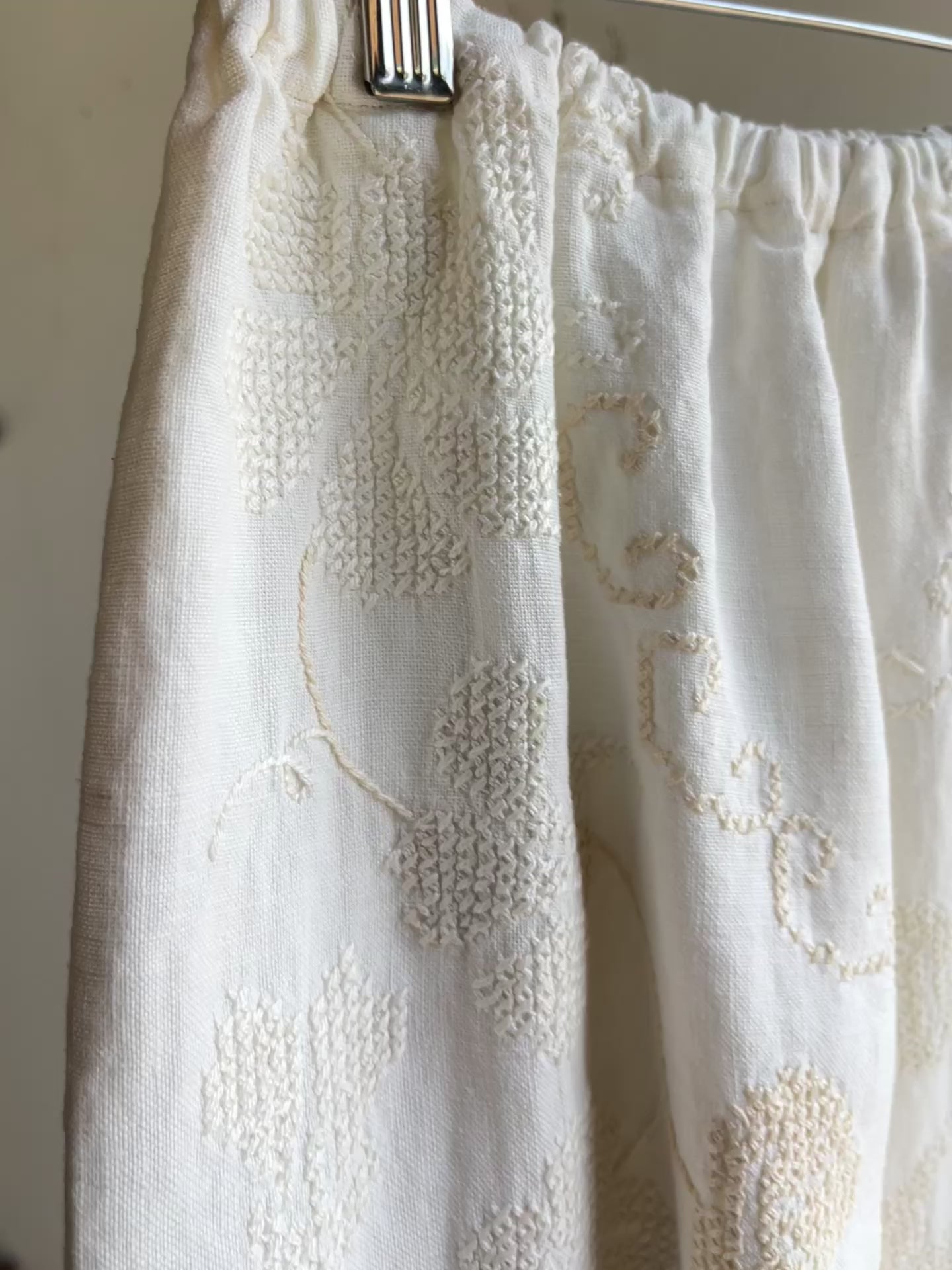 This skirt is made from a vintage (possibly antique) embroidered linen tablecloth. Judging by the fabric and style,I would say this is from the 1930s-1940s. This Skirt is cut in an a-line pattern and features an elastic waistband to fit a variety of sizes