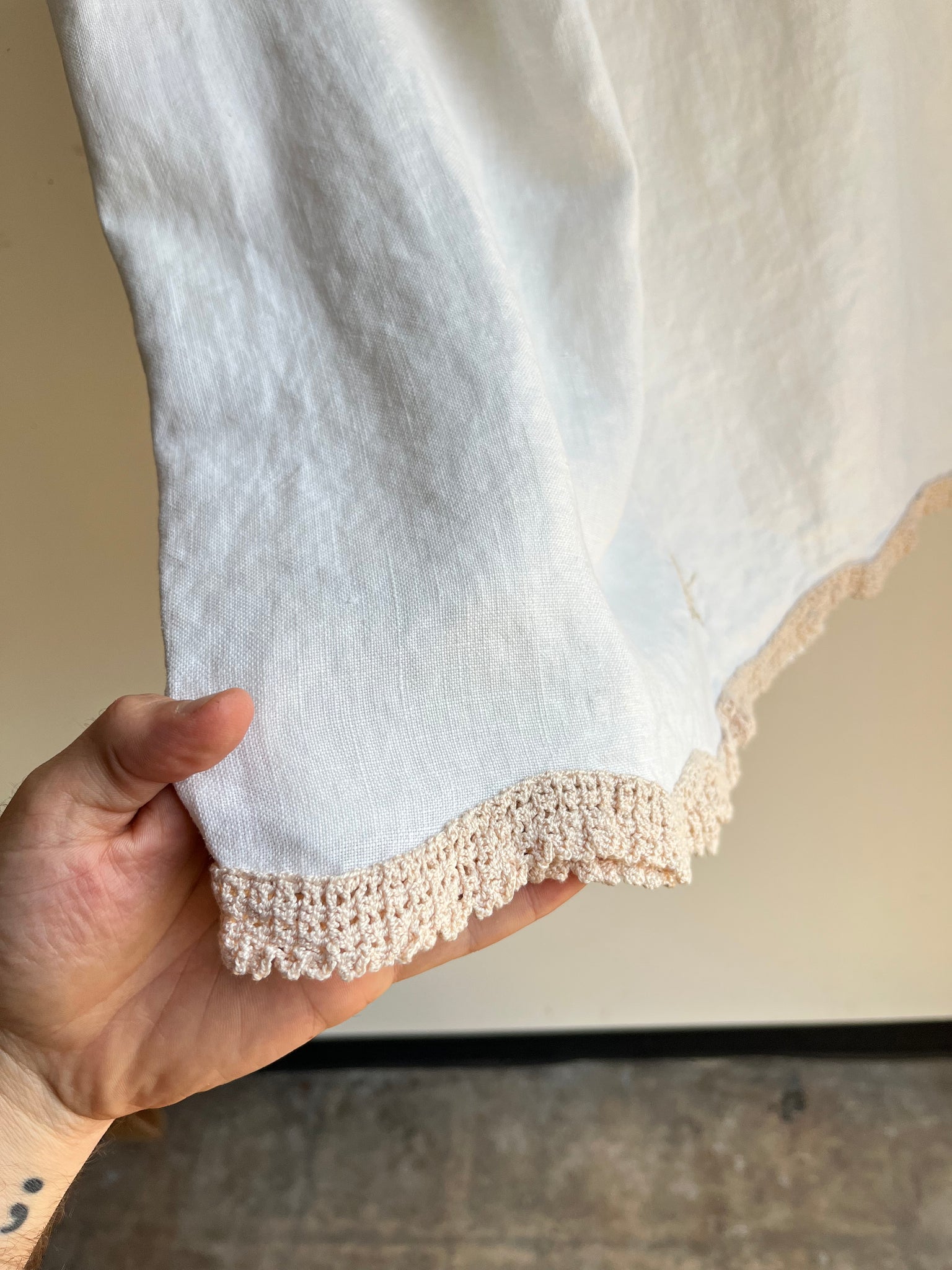 Fabric: no tags, but its definitely linen and the embroidery and crochet trim possibly cotton