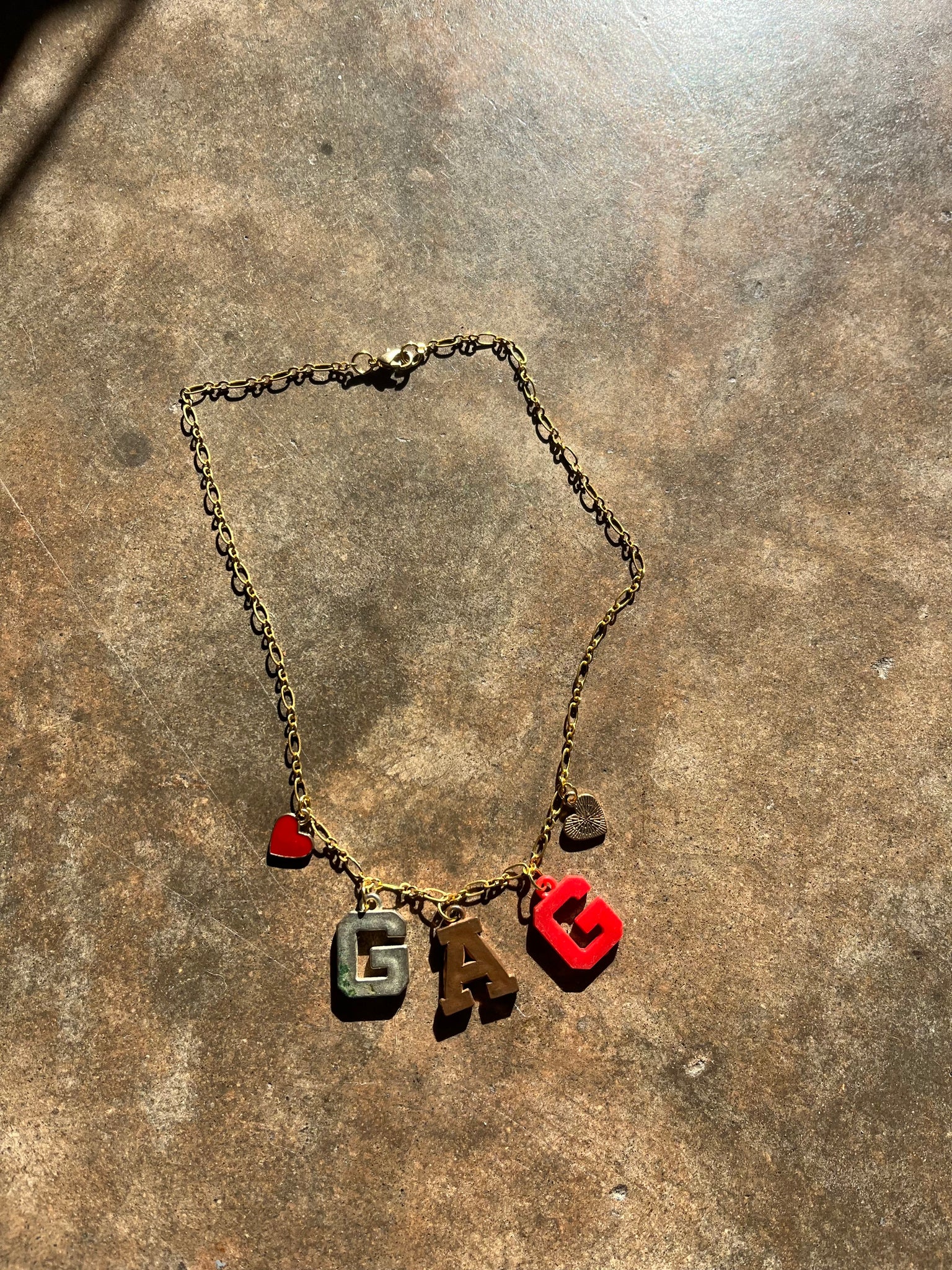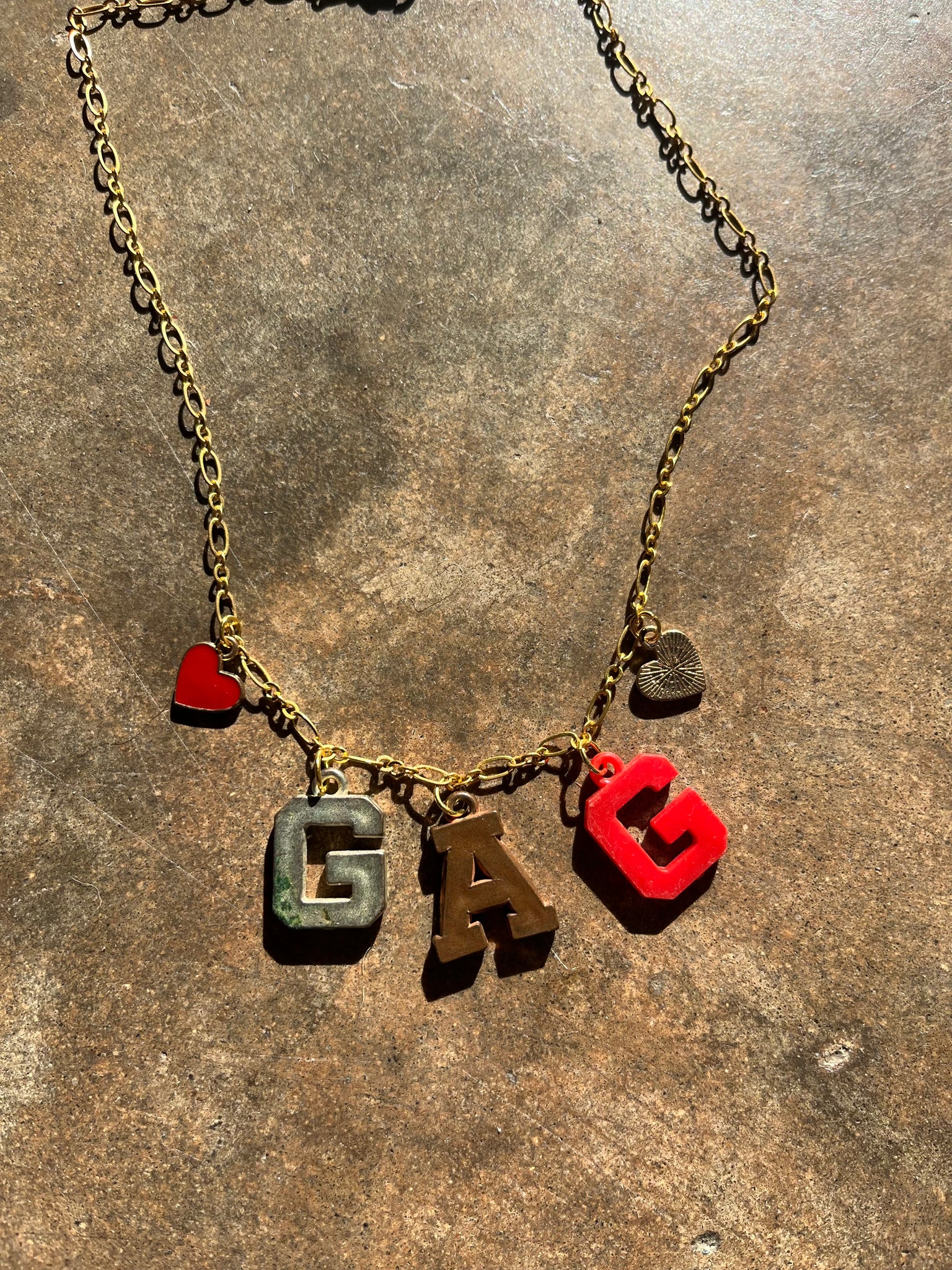 It features 5 vintage charms (in order): metal heart, metal G, Metal A, Acrylic G