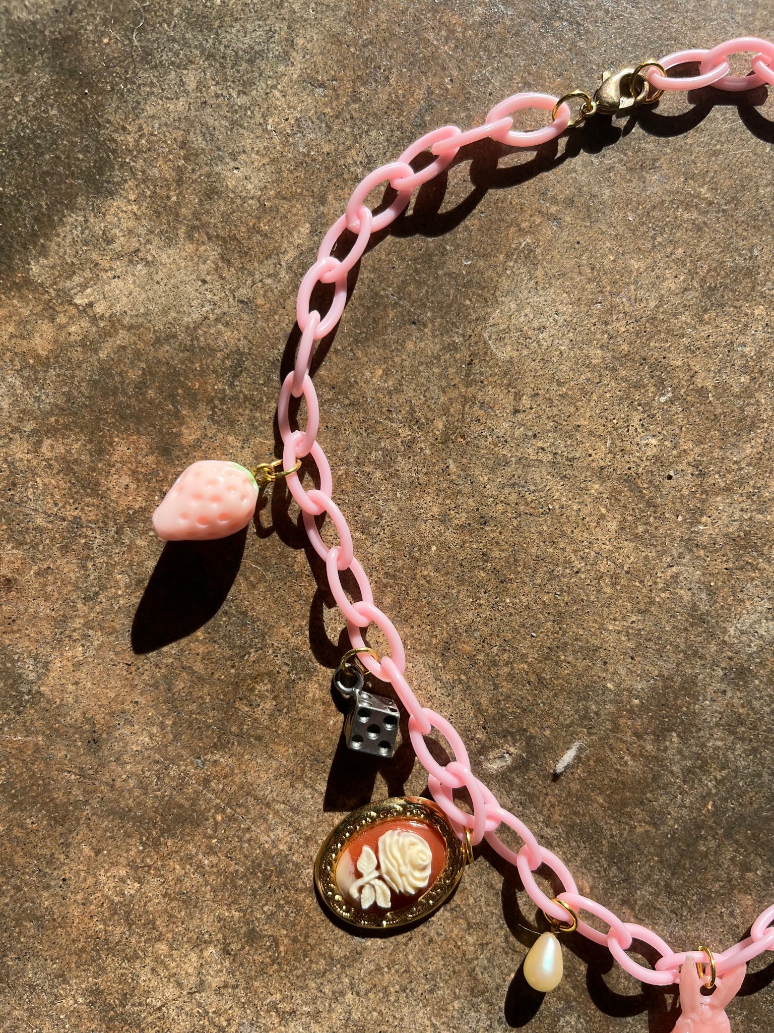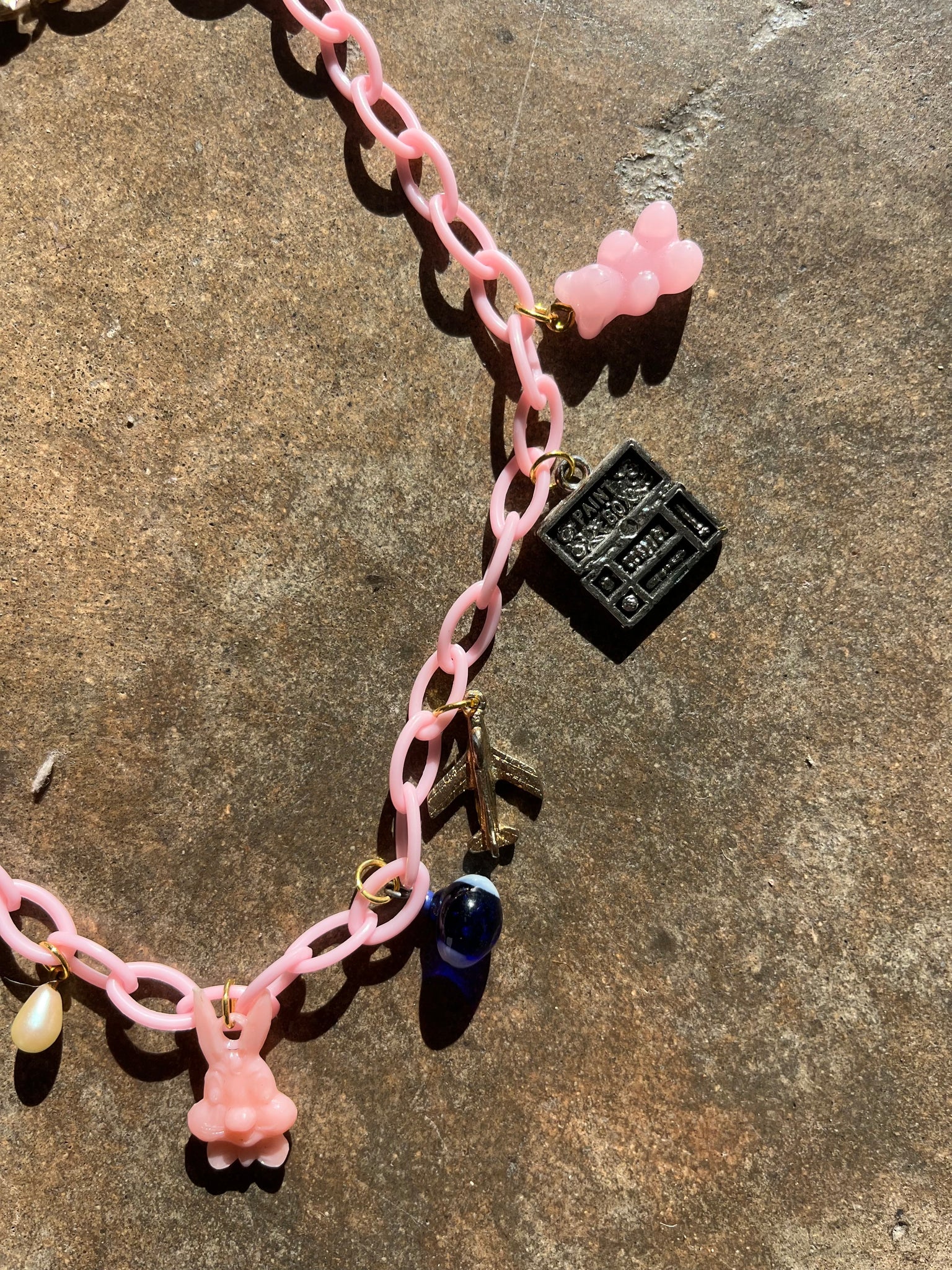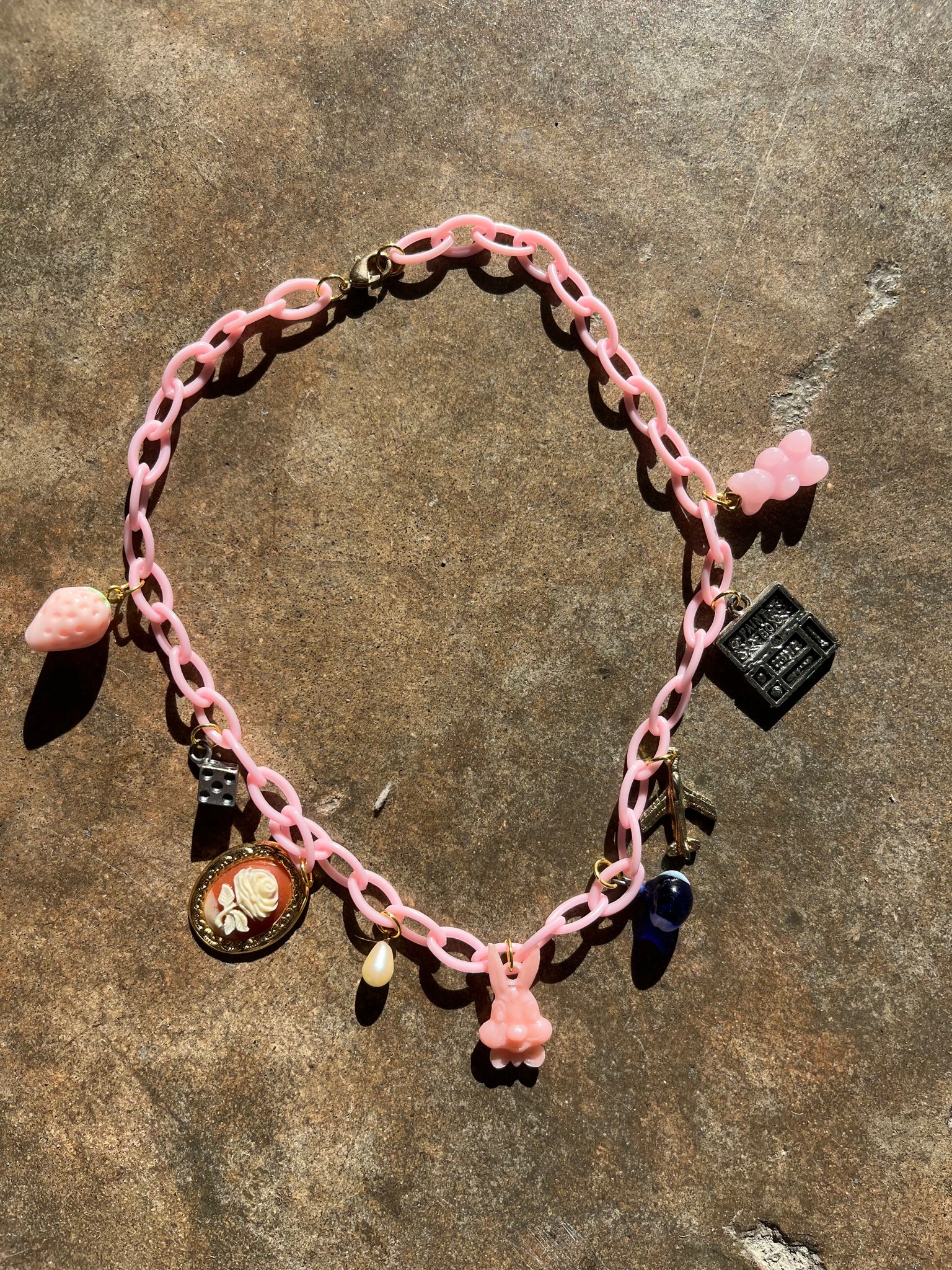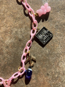 It features 9 vintage charms (in order)set on a pink acrylic chain: Acrylic Strawberry, Metal Die, Metal Cameo, Pearl, Pink Plastic Bugs Bunny, Glass Evil Eye, Metal Airplane, Metal Painters Box, Acrylic Gummy Bear
