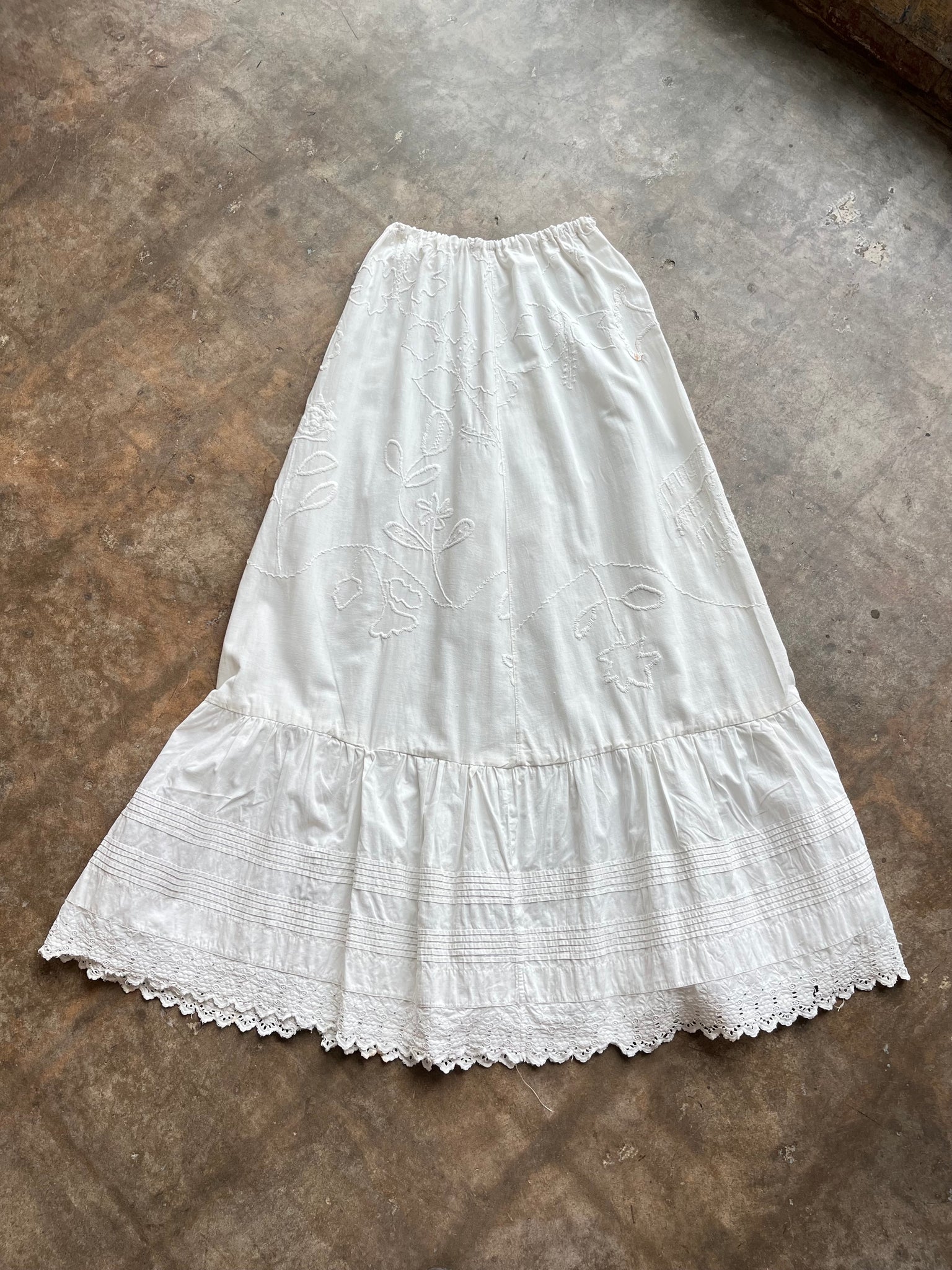 This skirt is made from an antique embroidered linen counterpane and eyelet trim. While these are 2 separate pieces. I got them from the same place, the counterpane had a note pinned on it that said