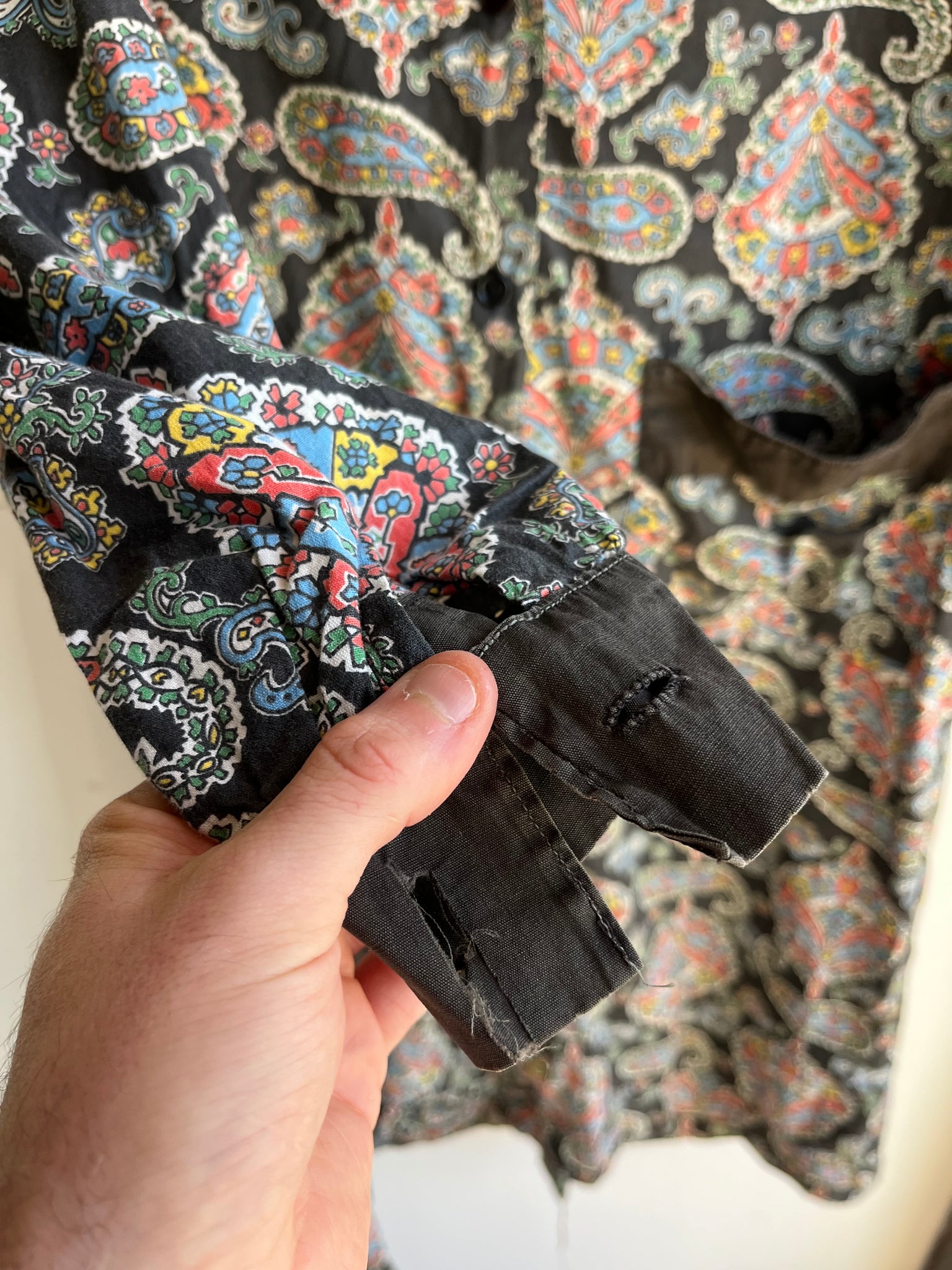Condition: Very Good wearable condition, it has all the front buttons, but it appears the cuff buttons have been torn off, there is some light discoloration