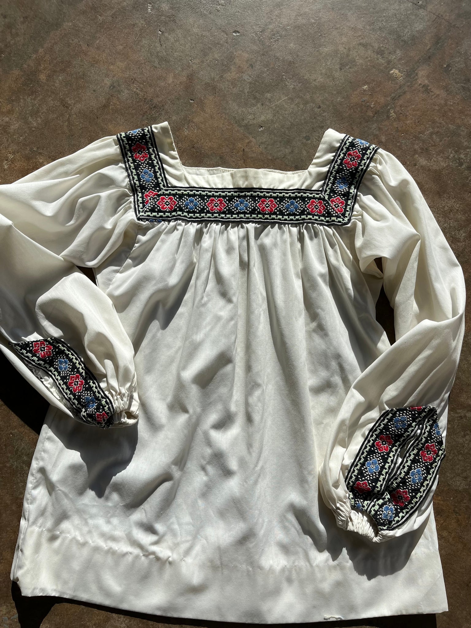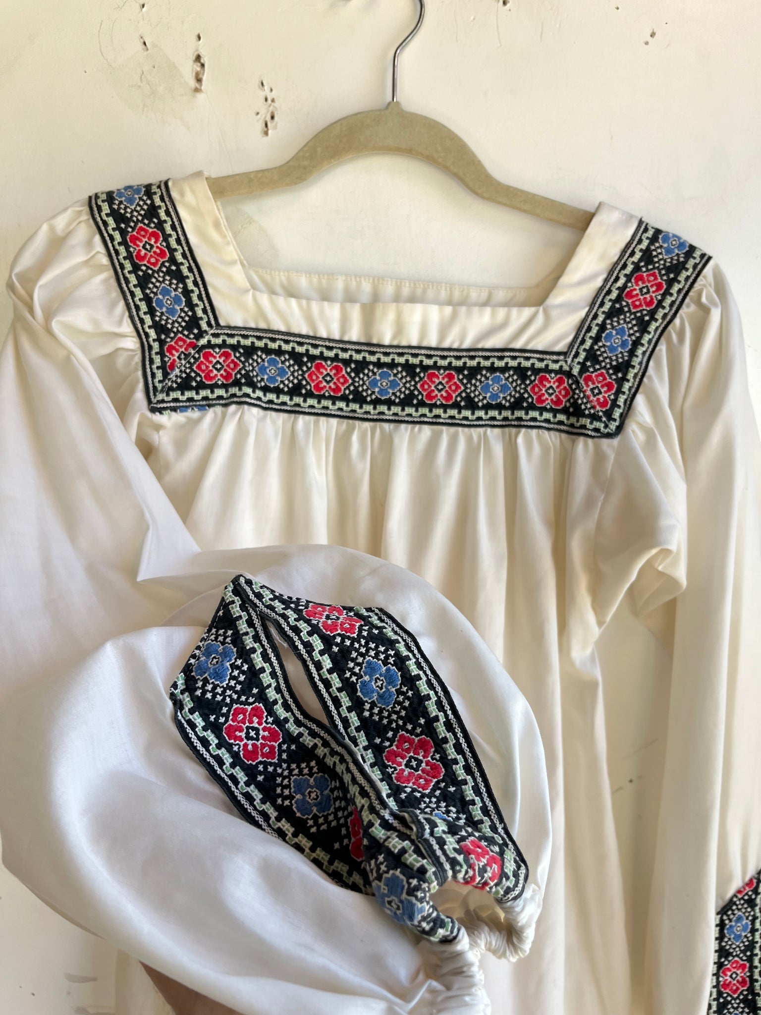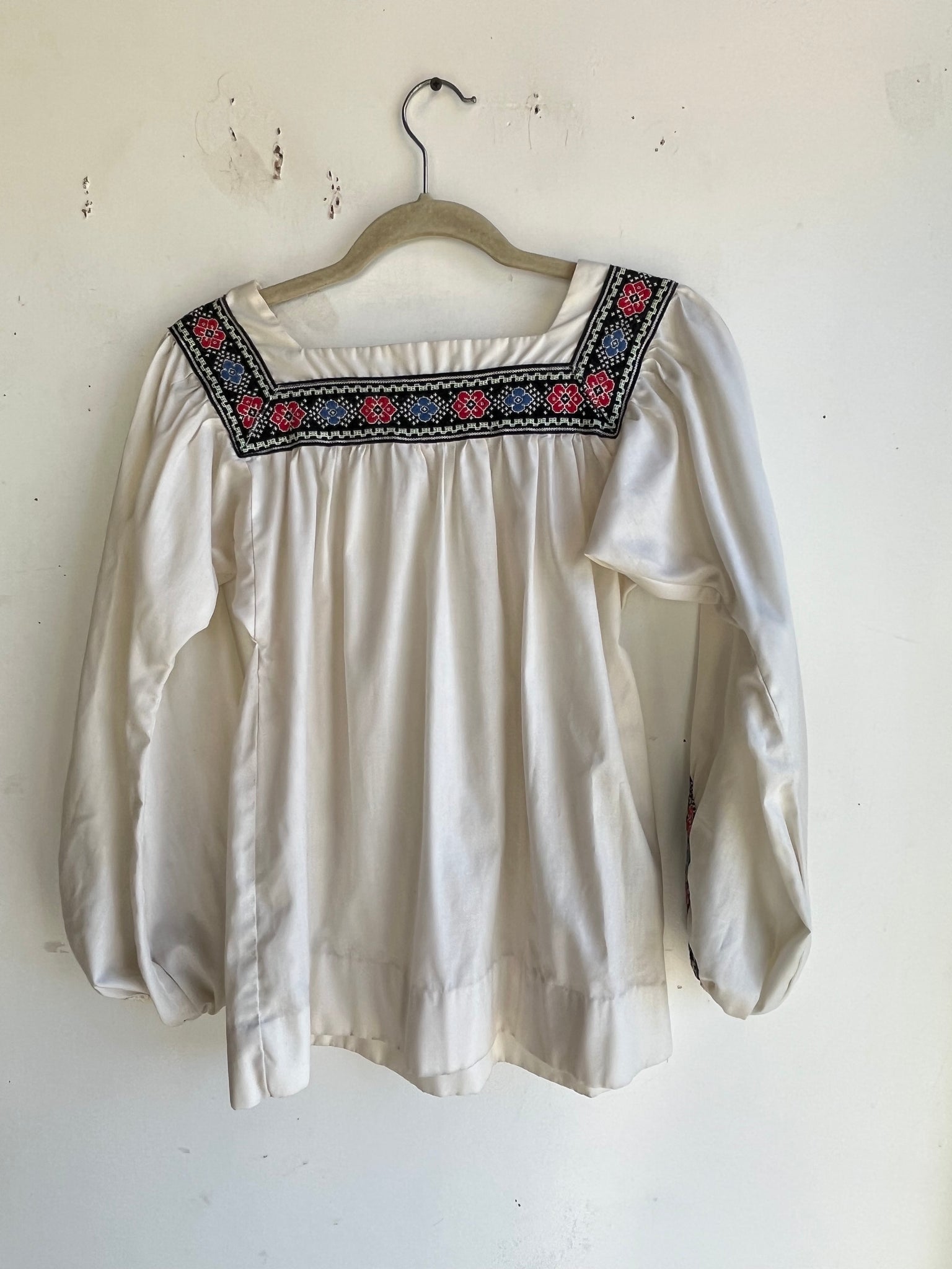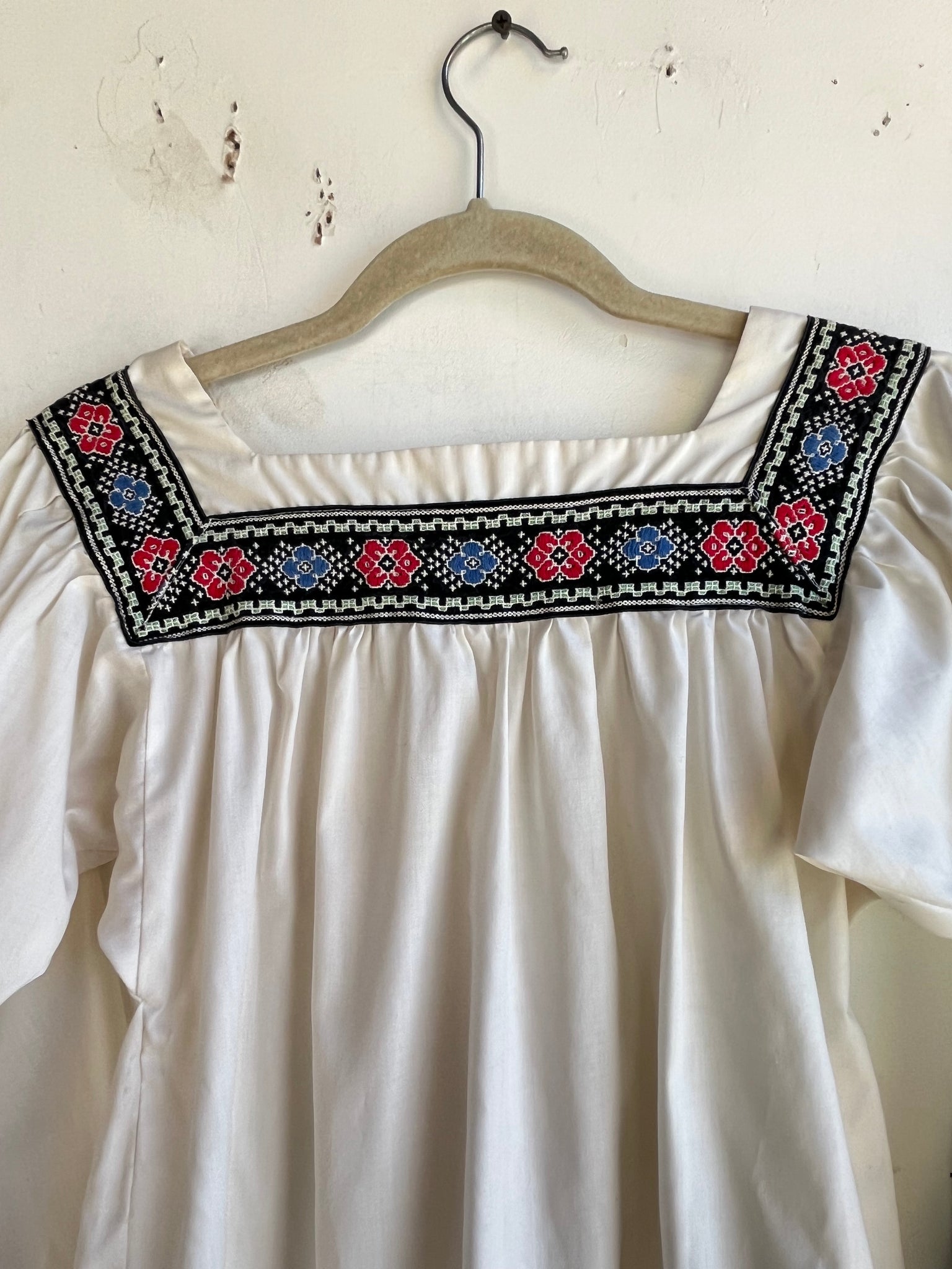 Fabric: no tags, but I would say the body is a cotton blend, and the embroidery cotton