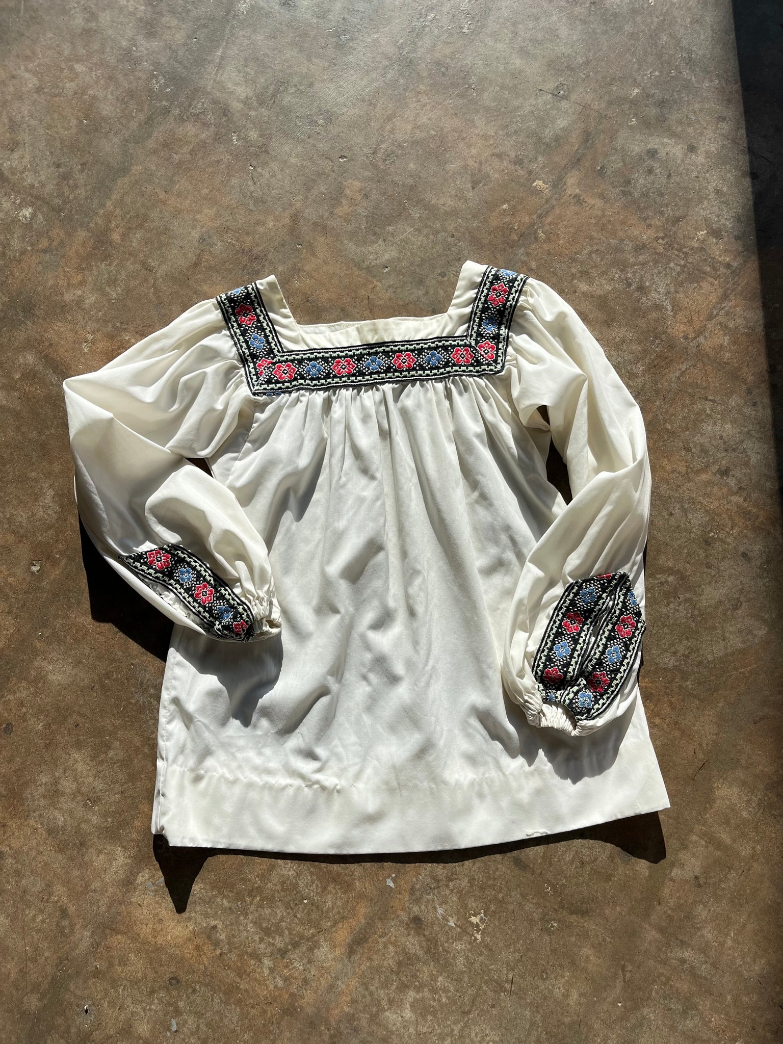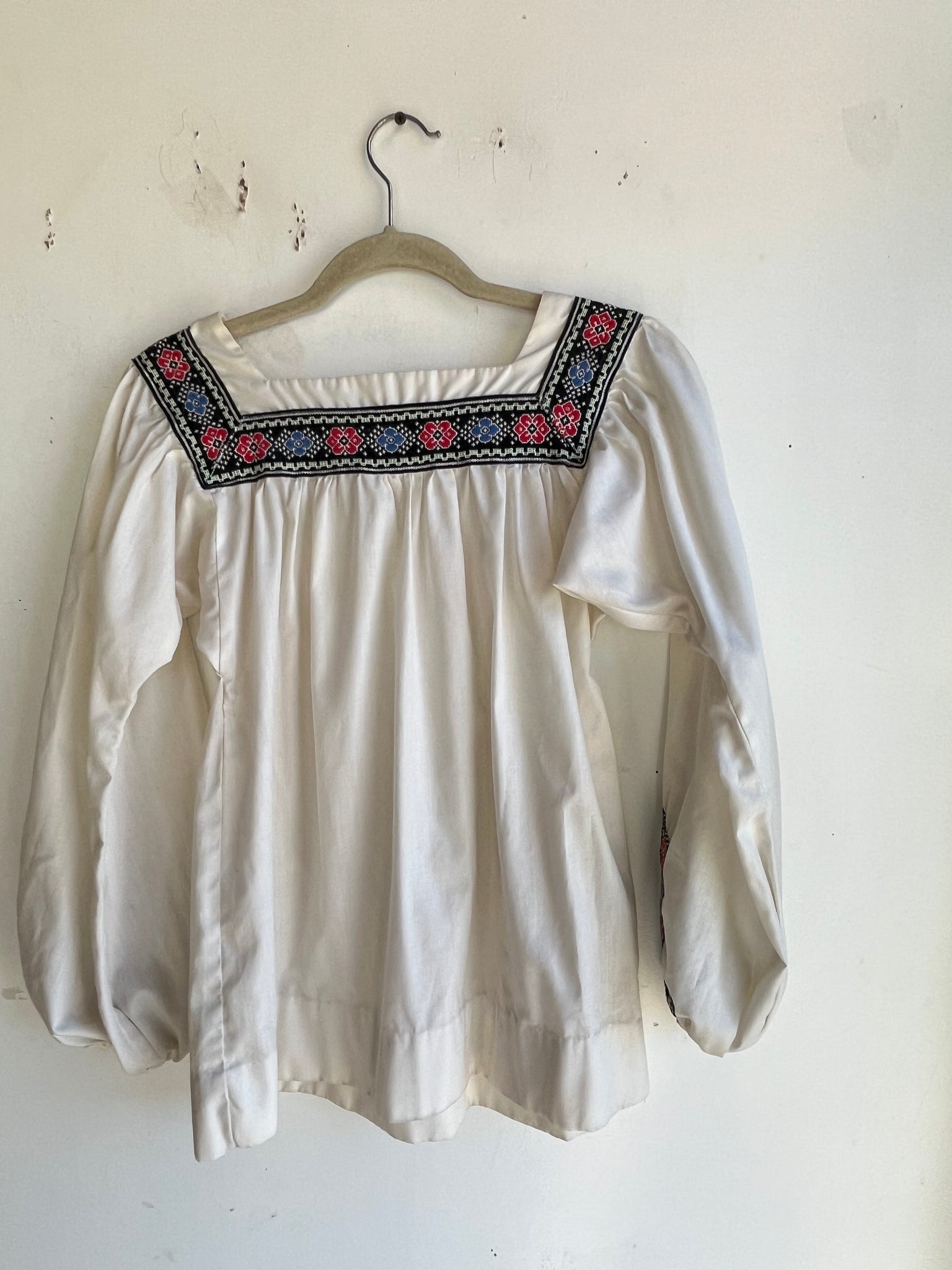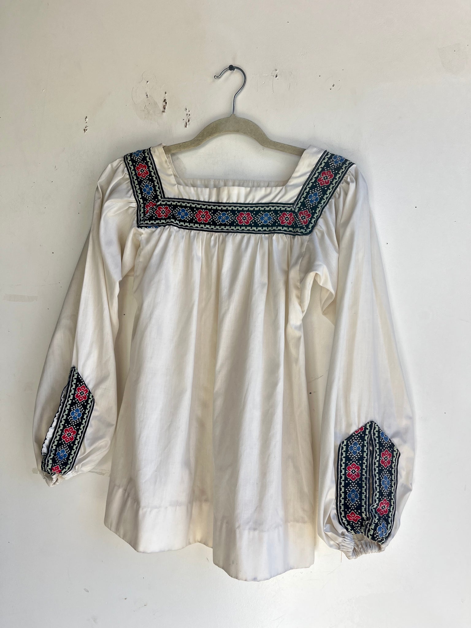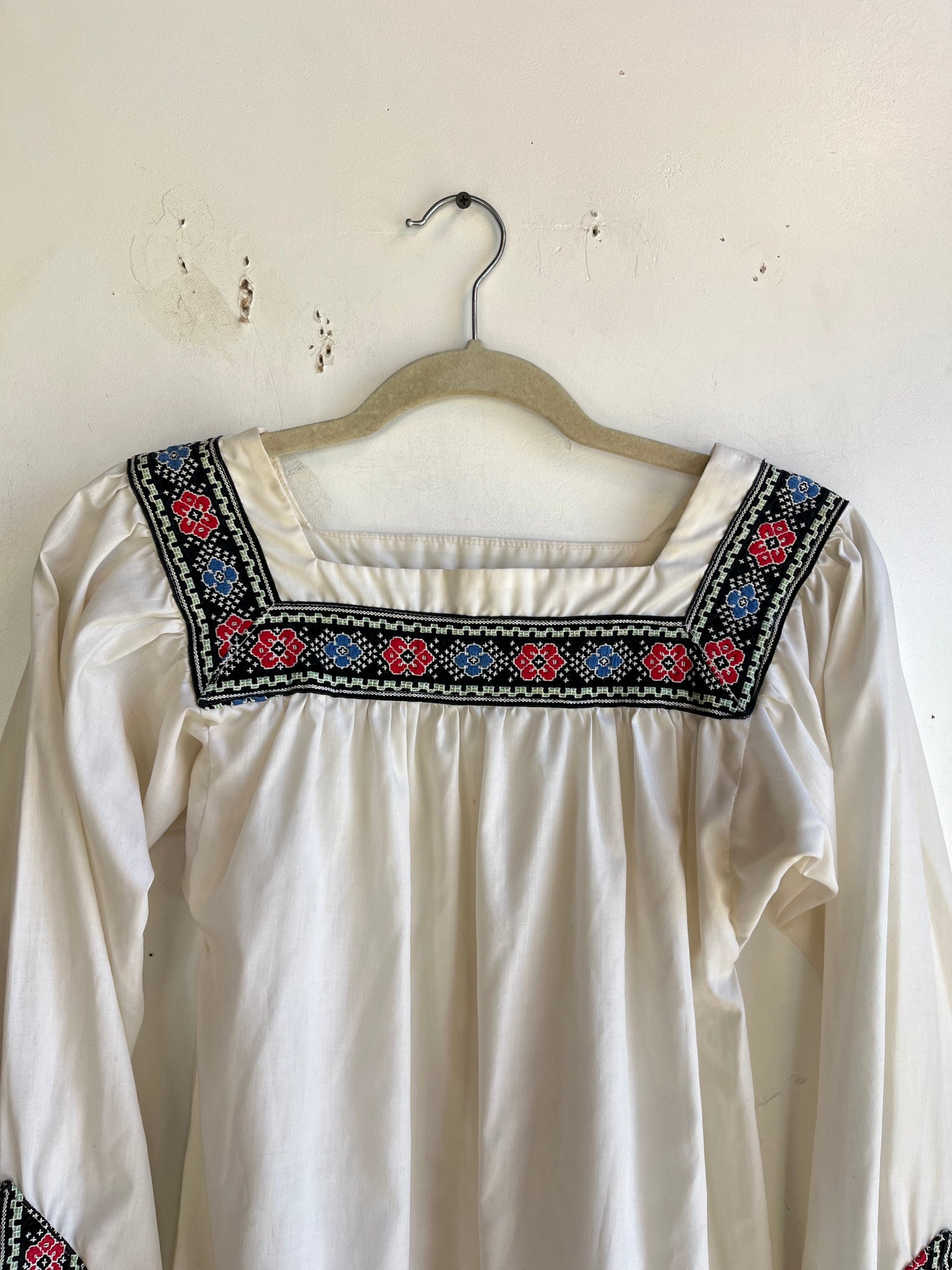 Fabric: no tags, but I would say the body is a cotton blend, and the embroidery cotton