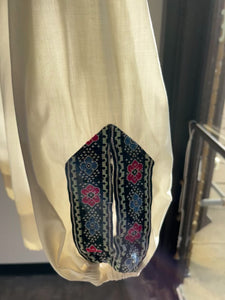 Color Scheme: Ivory, the embroidered accents are black, red, green, ivory, and blue