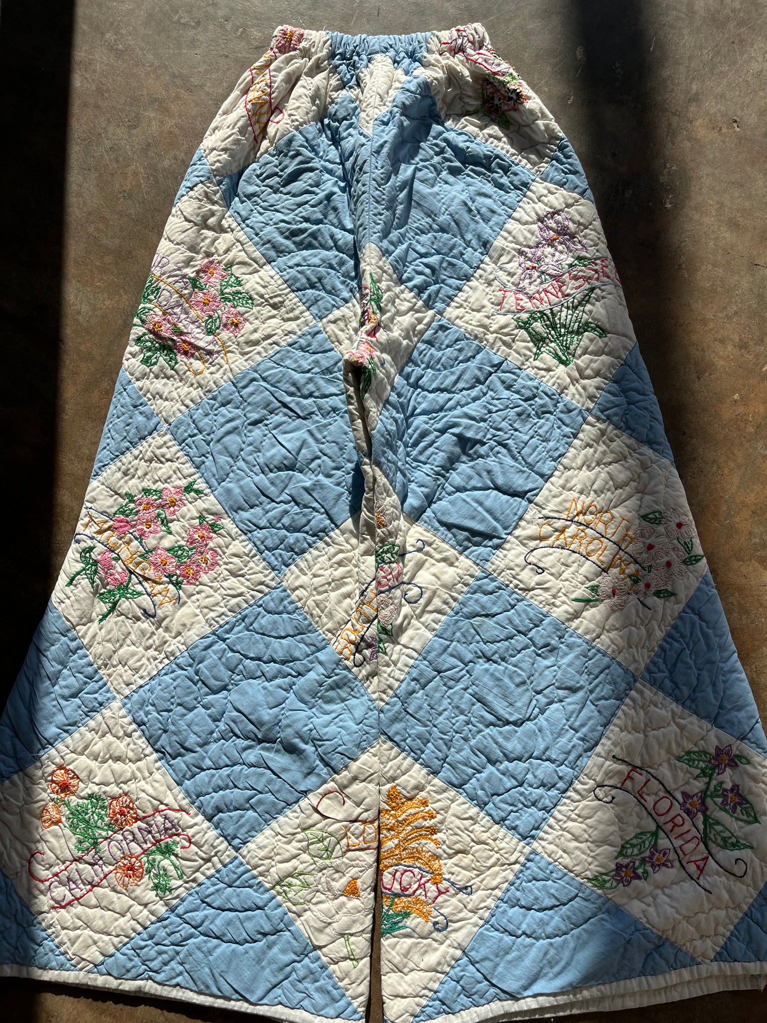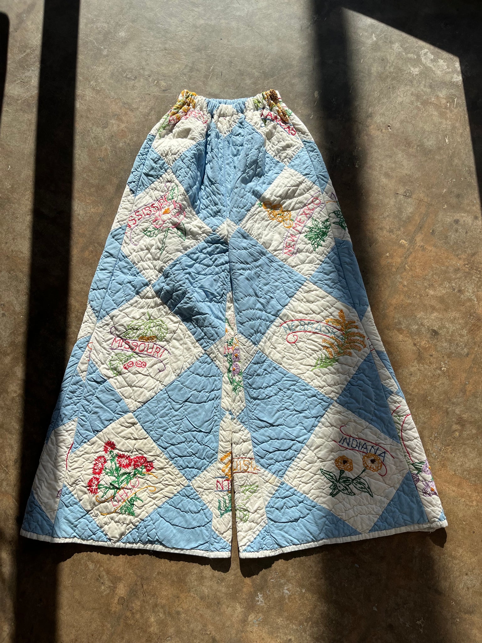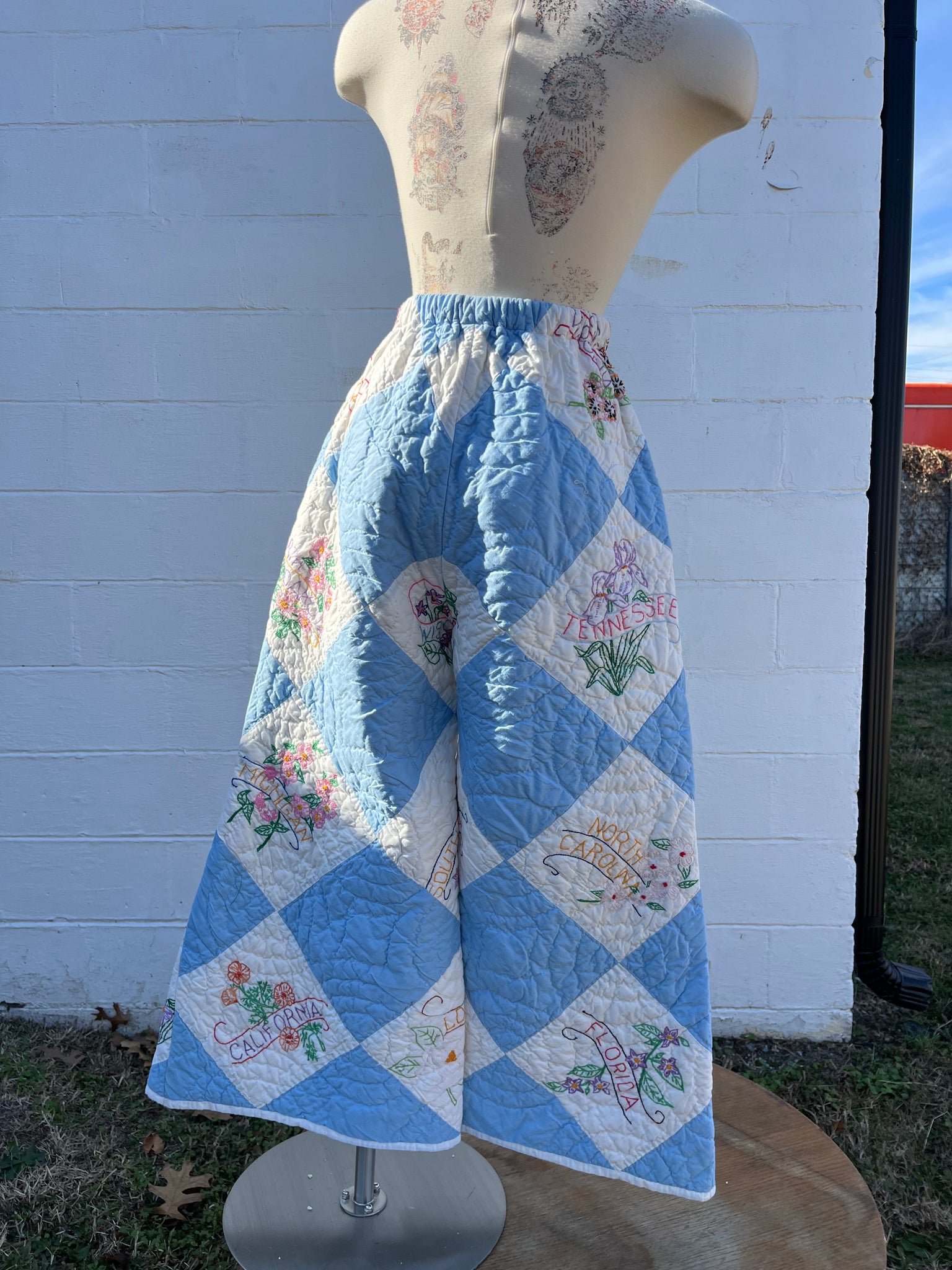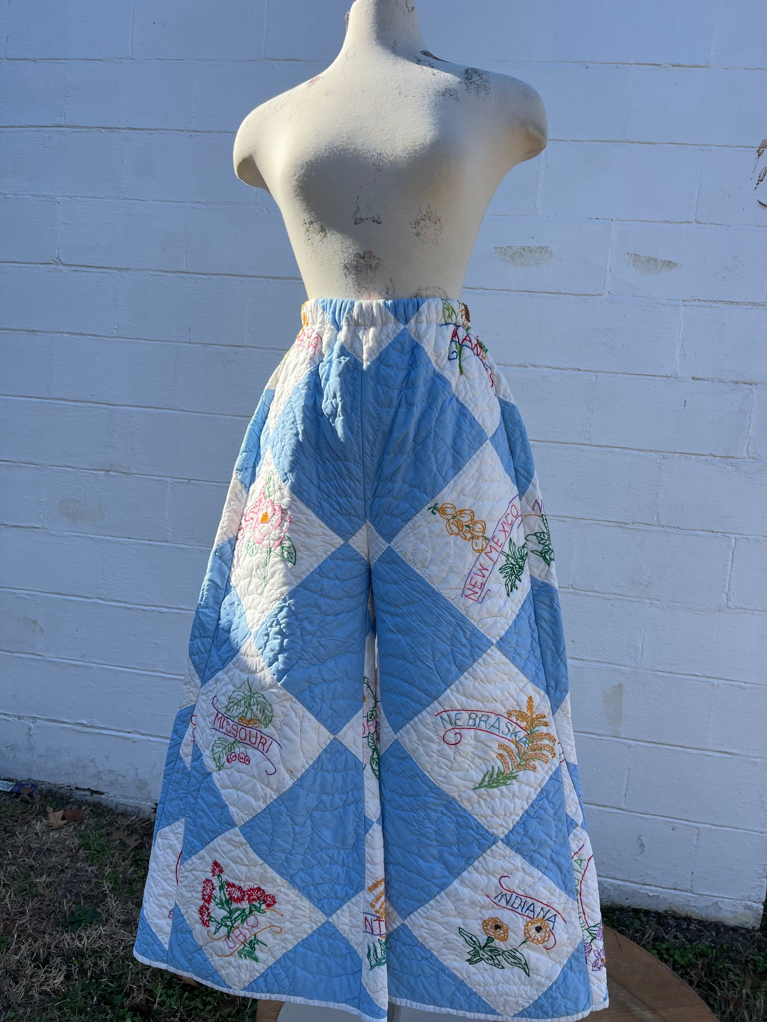 These pants are made from a vintage Harlequin diamond hand embroidered state flower quilt .When it was found, it was had several holes and wear areas, so why not use the good parts for pants:) There is a batting between the two layers, but I would say this a light weight quilt. Judging by the fabric, style, and that it is all hand stitched, it also doesn't have Alaska or Hawaii as a state, so I would say this is from the 1940s-1950s. This pant is made from a vintage palazzo pant pattern and features a super wide leg and elastic waist band to fit a variety of sizes. It also has inseam pockets for maximum comfort and utility :)
