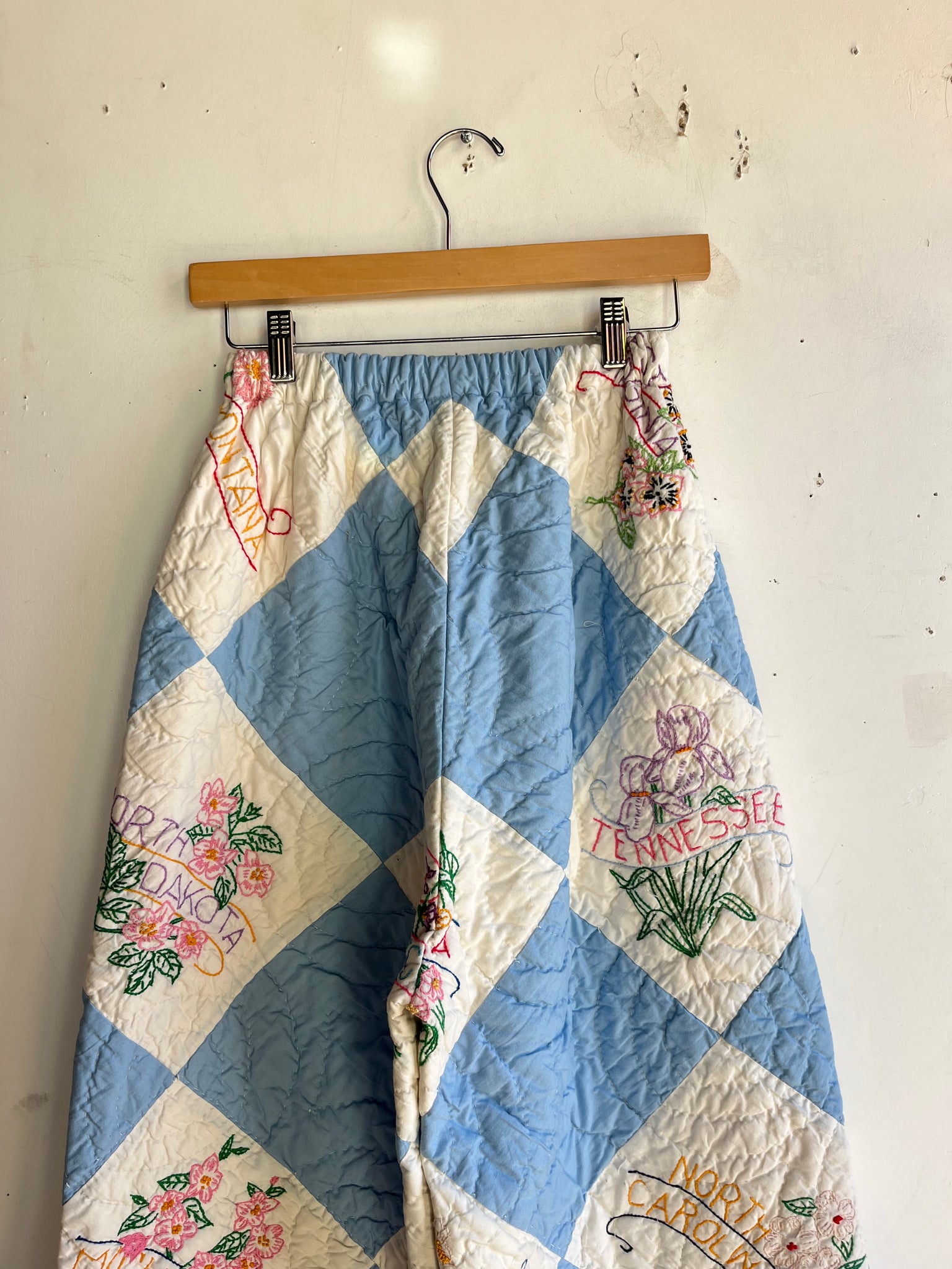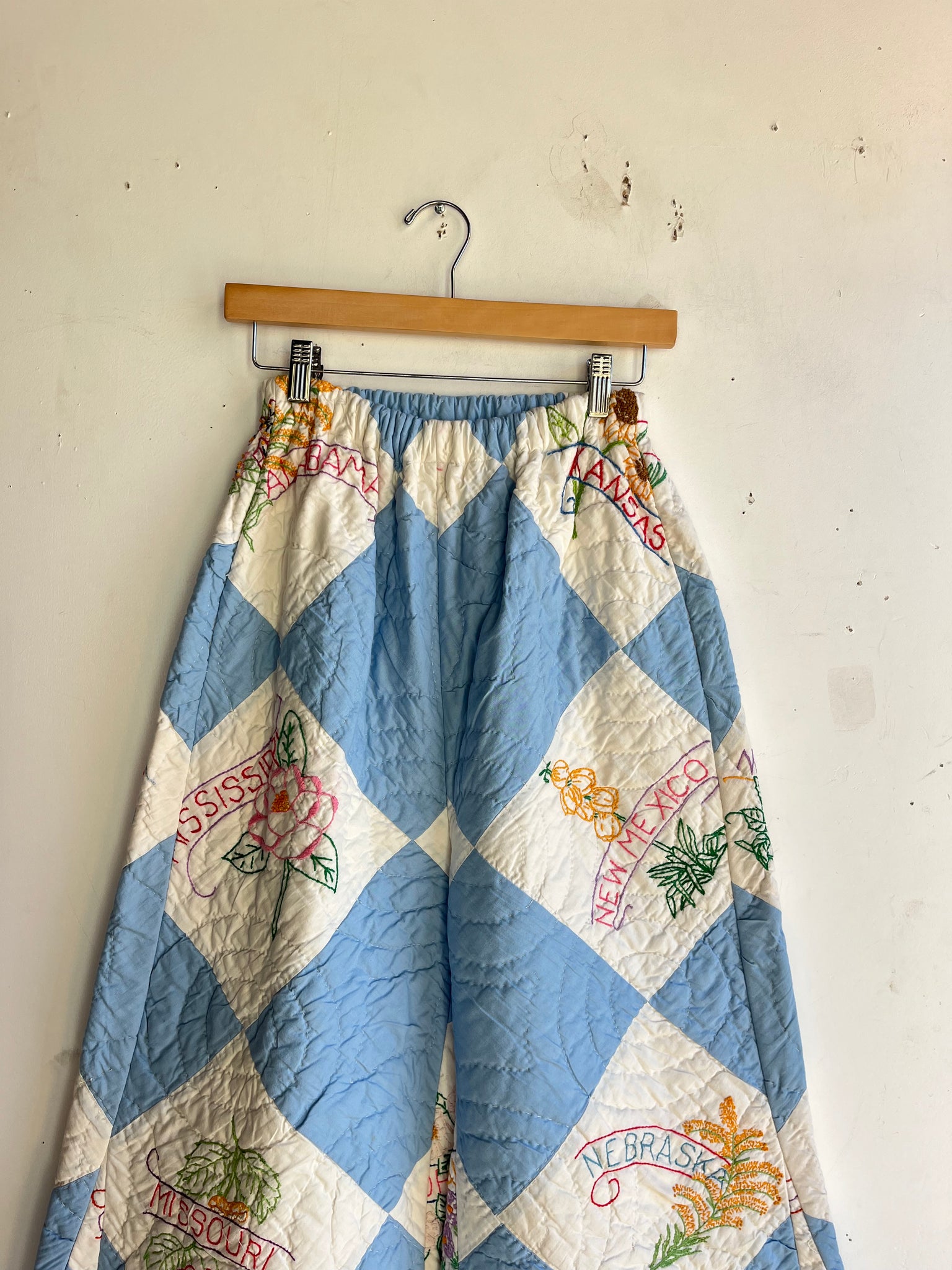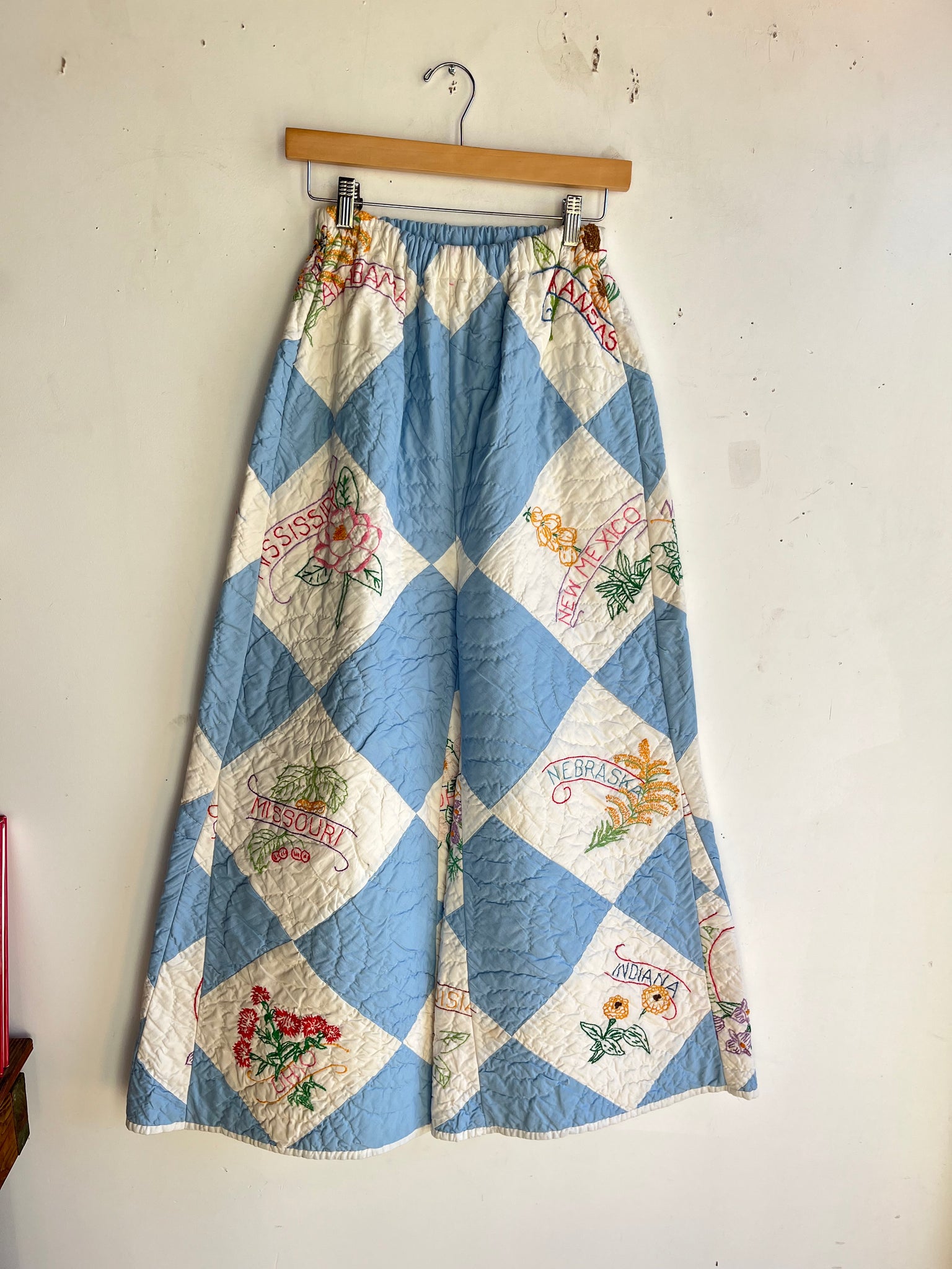 Handmade High Waist Quilt Palazzo Pants- Ultra Rare 1940s Embroidered State Flower
