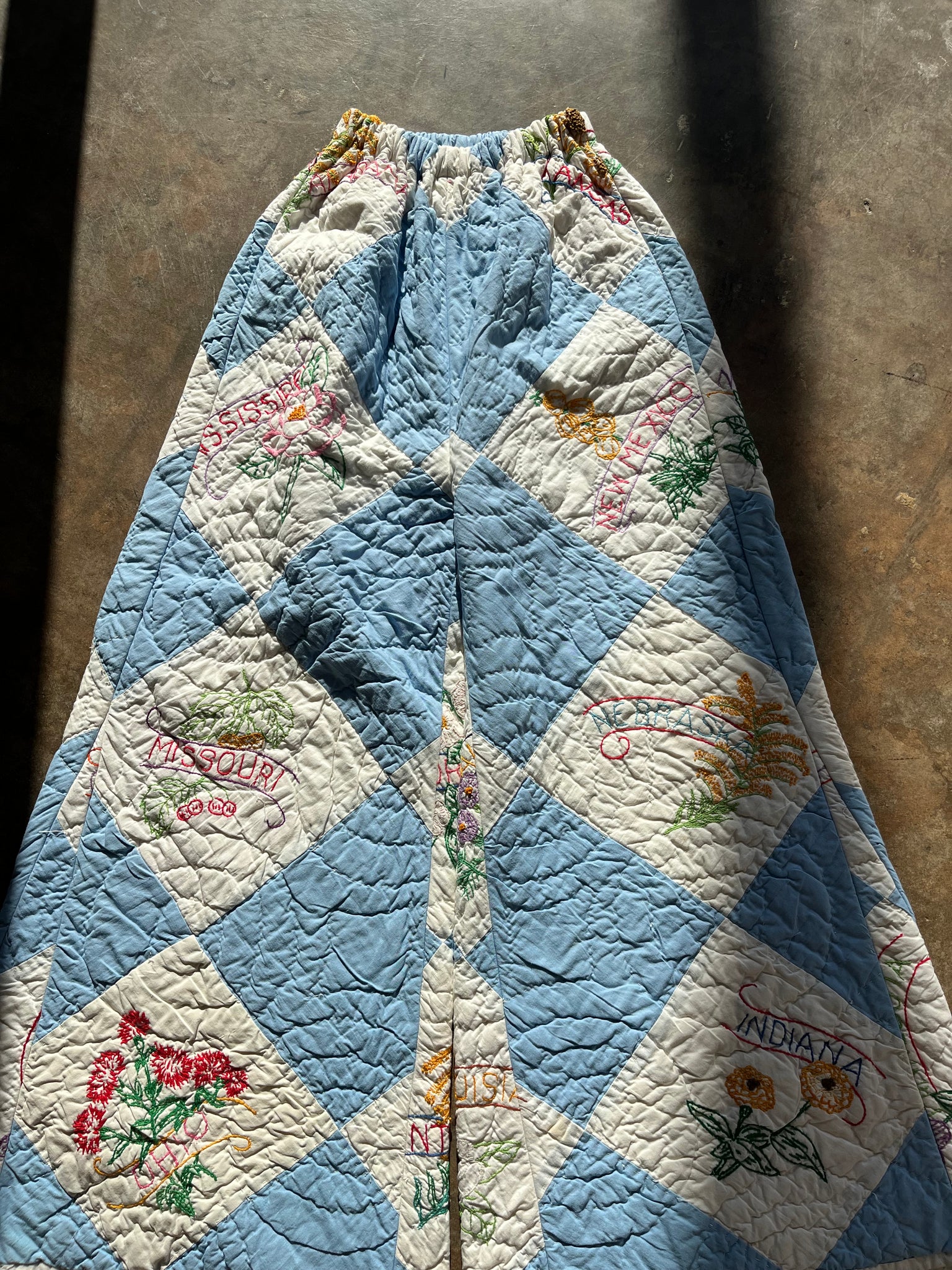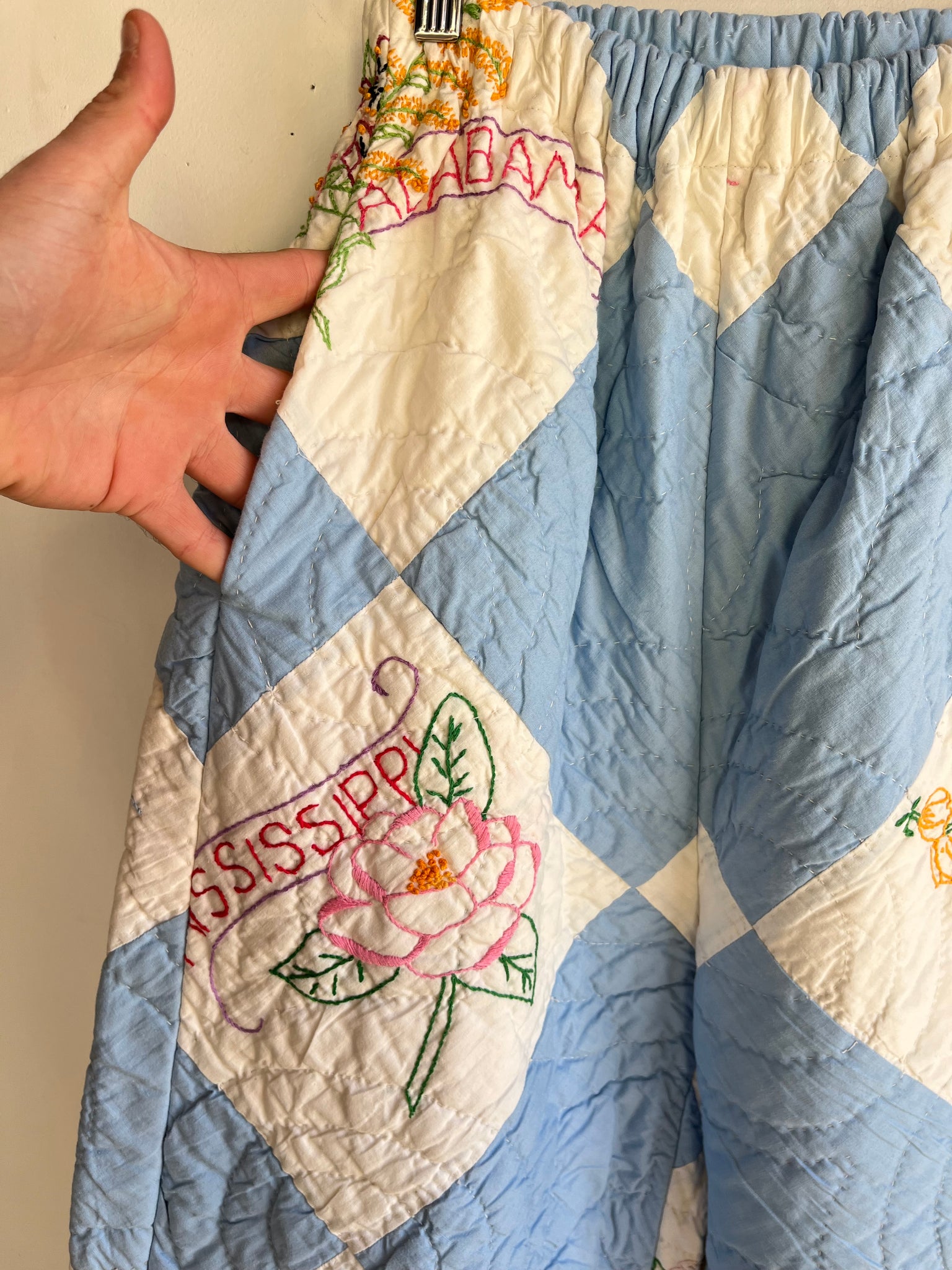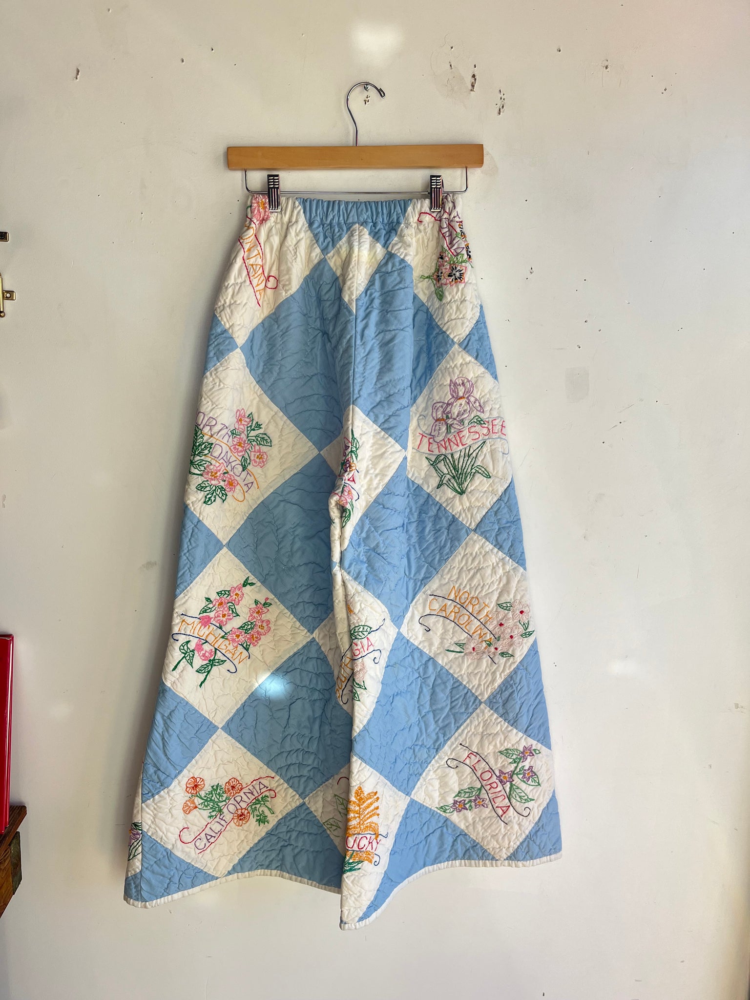 Handmade High Waist Quilt Palazzo Pants- Ultra Rare 1940s Embroidered State Flower