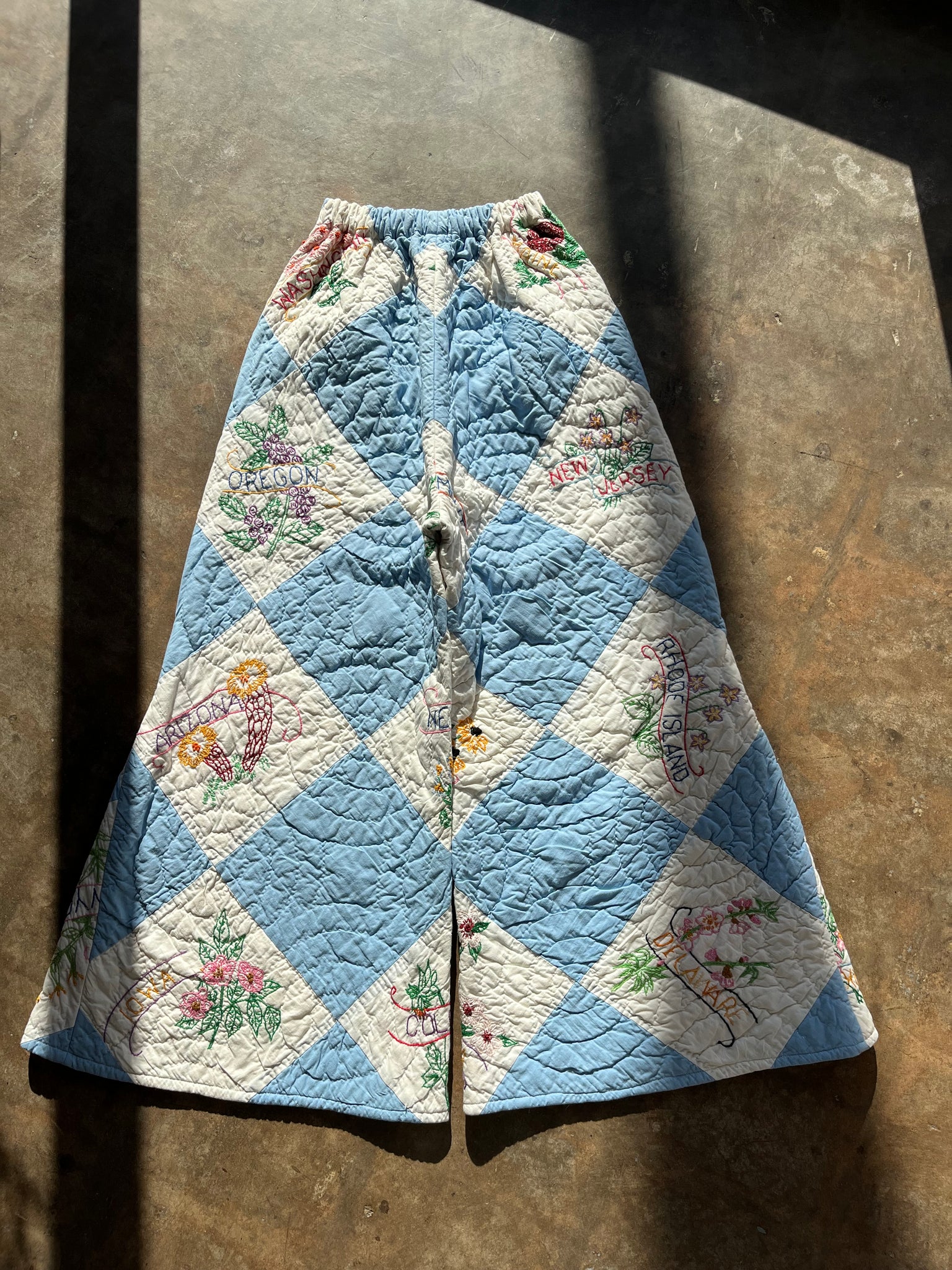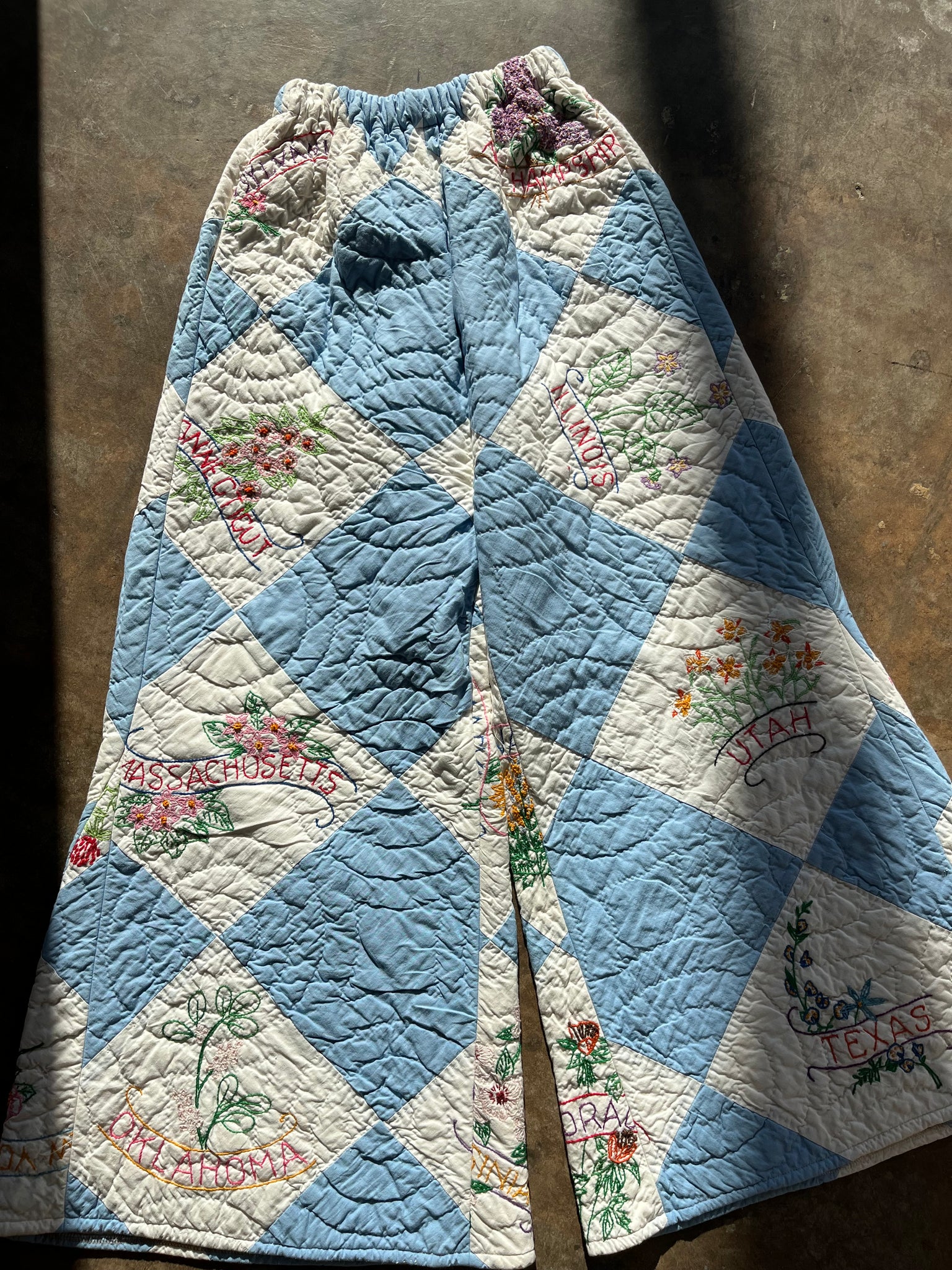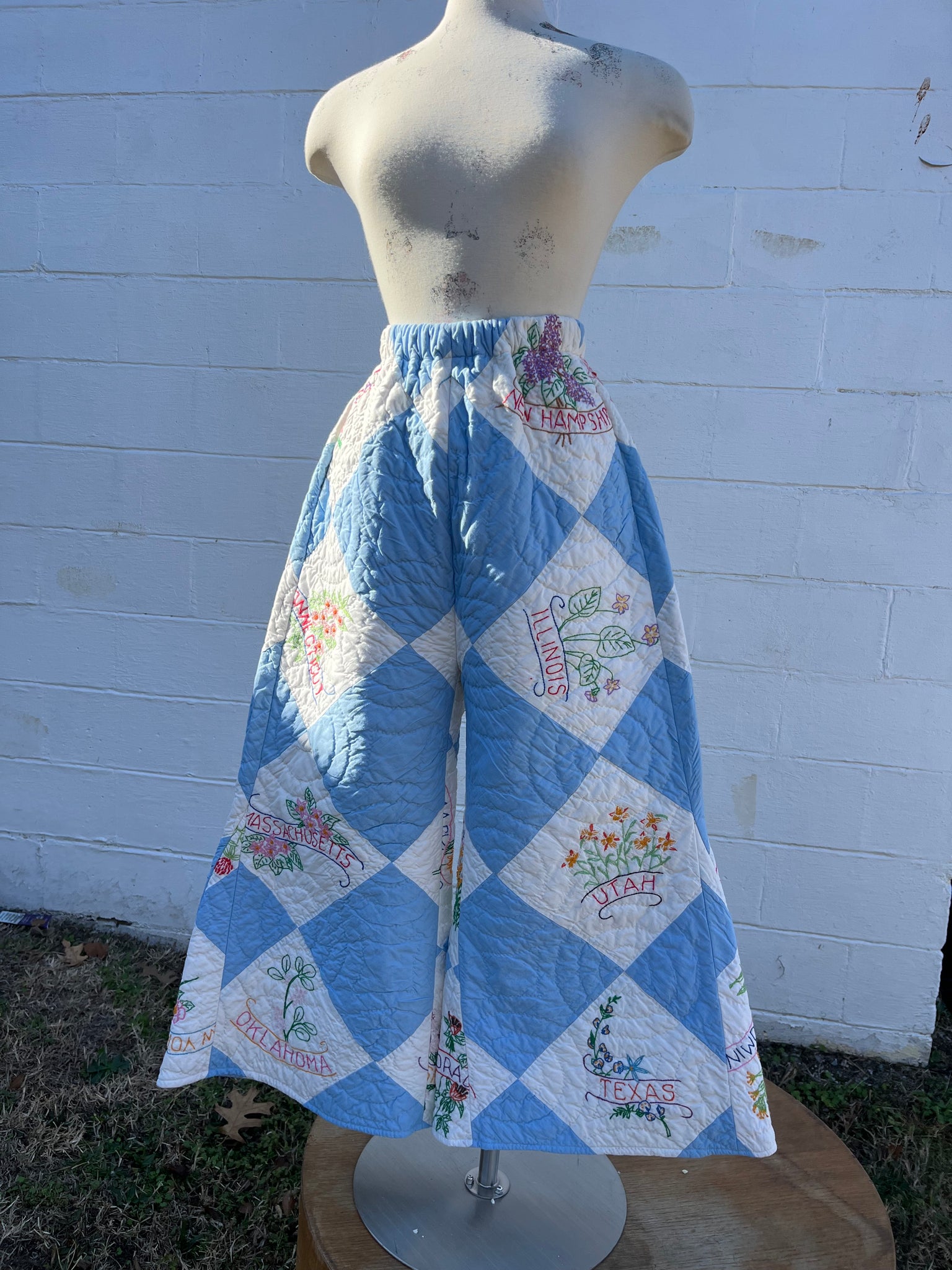 Handmade High Waist Quilt Palazzo Pants- Ultra Rare 1940s Embroidered State Flower