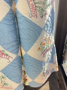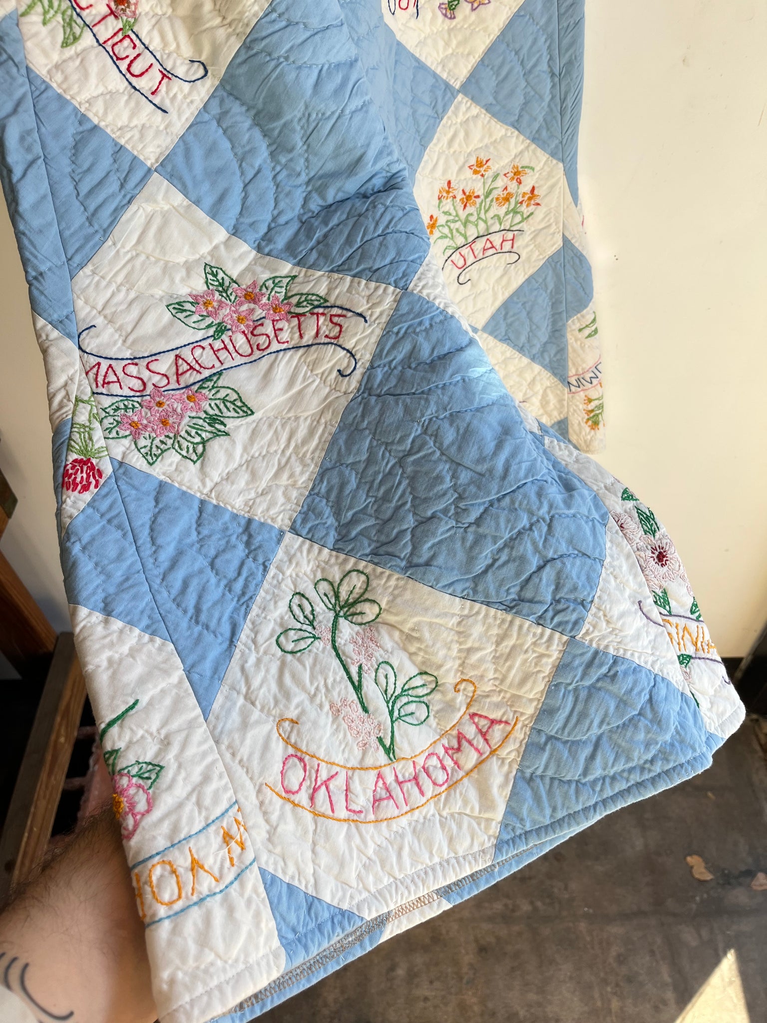 Color Scheme: Blue and White with multi-colored hand embroidered states and state flowers