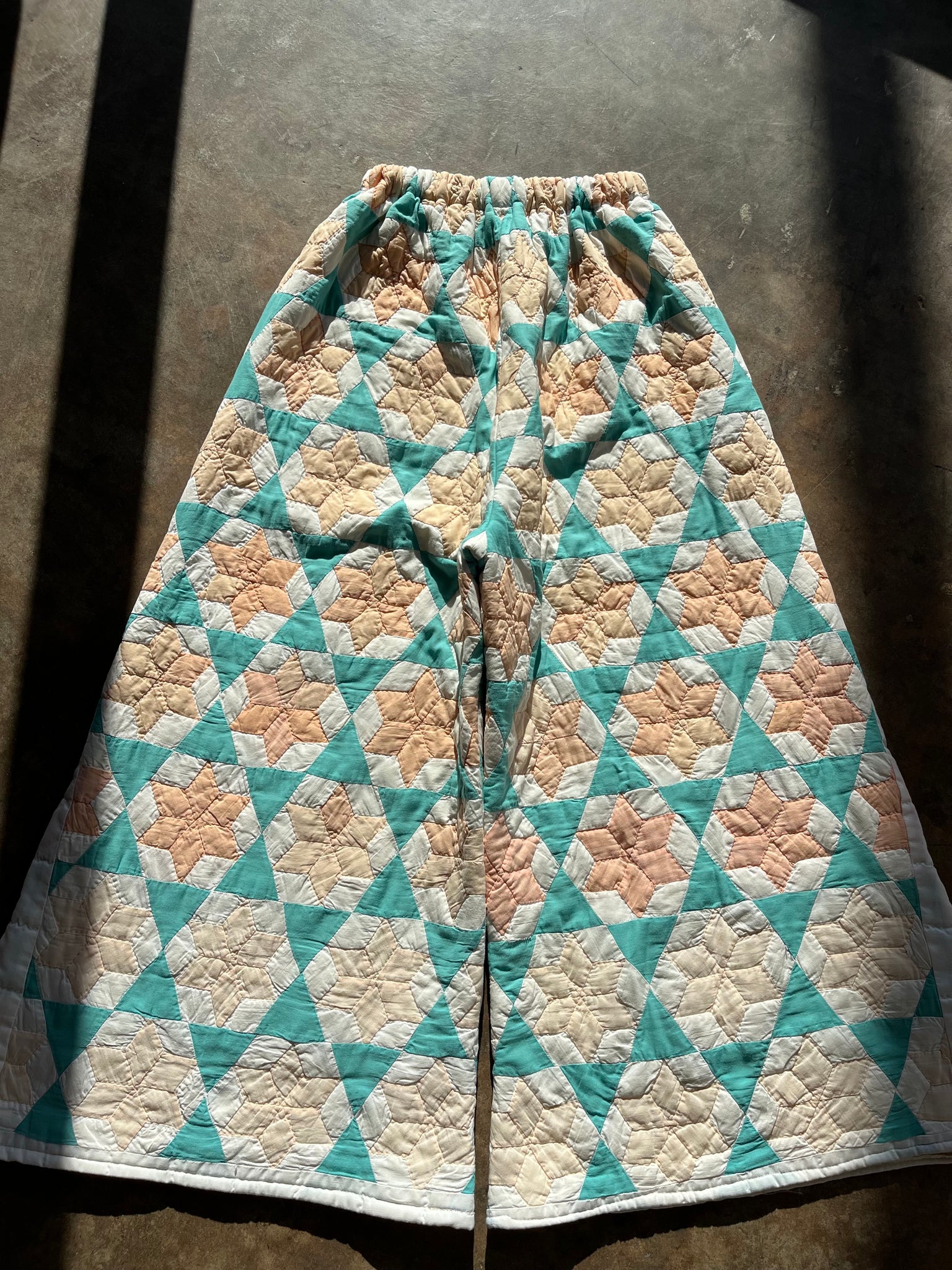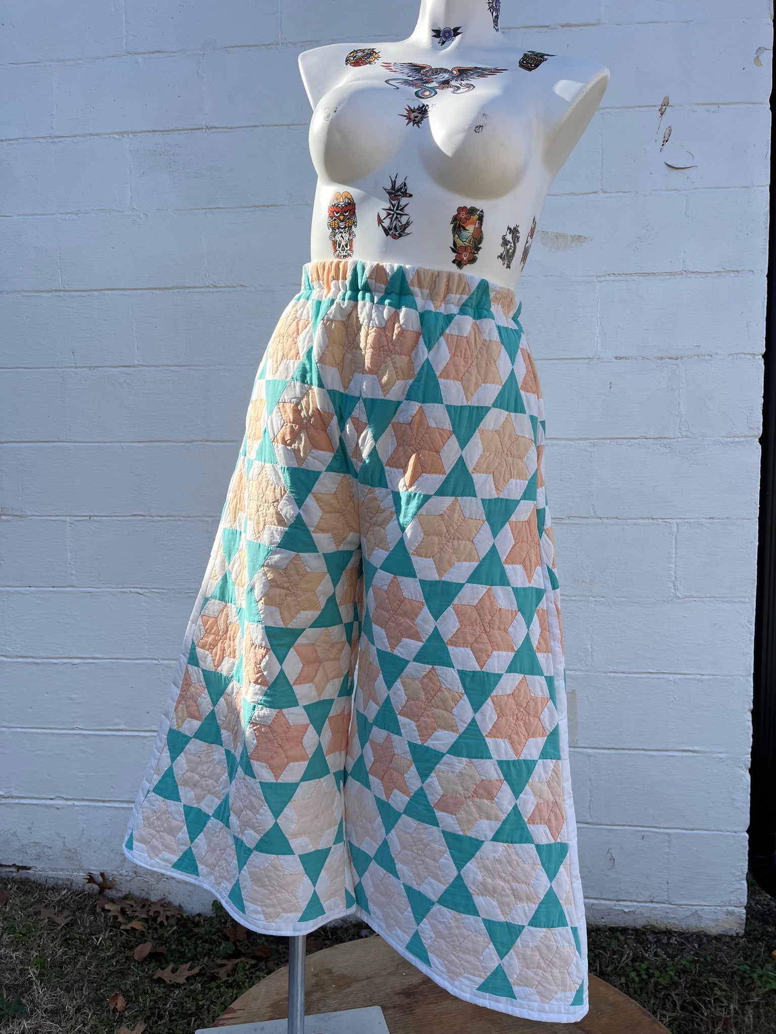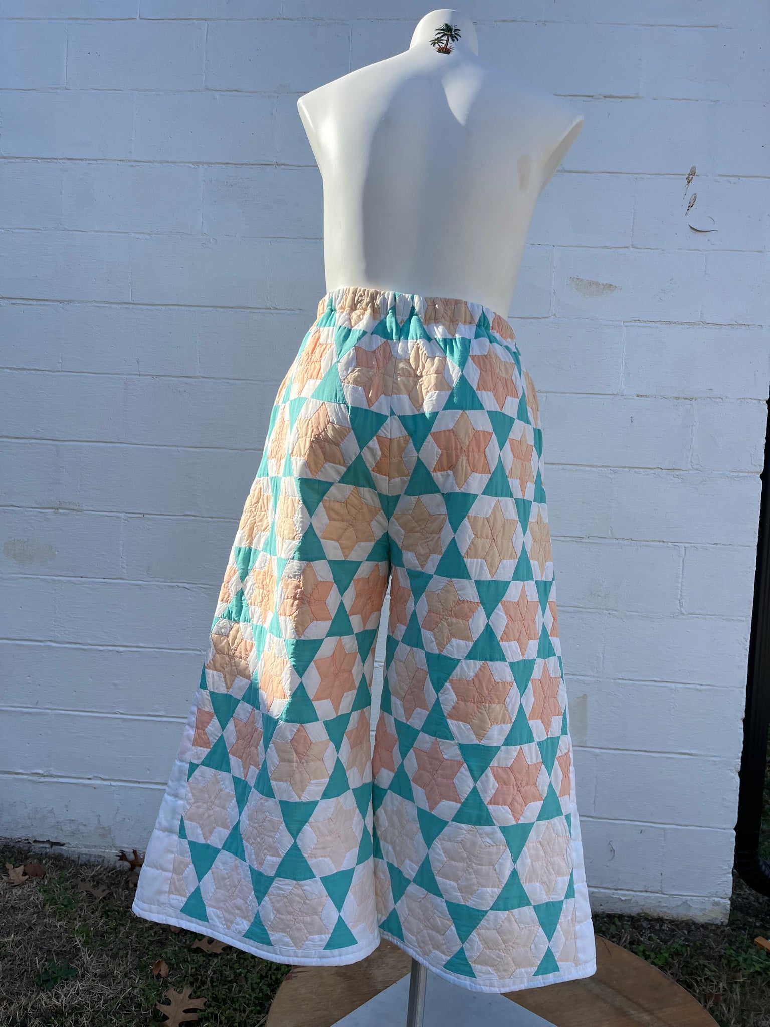 These pants are made from a vintage 6-Point star inside a 6 Point Star Quilt. When it was found, lots of holes, so why not use the good parts for pants:) There is a light batting between the two layers, but I would say this a light weight quilt. Judging by the fabric, style, and that it is all hand stitched, I would say this is from the 1950s. This pant is made from a vintage palazzo pant pattern and features a super wide leg and elastic waist band to fit a variety of sizes. It also has inseam pockets for maximum comfort and utility :)