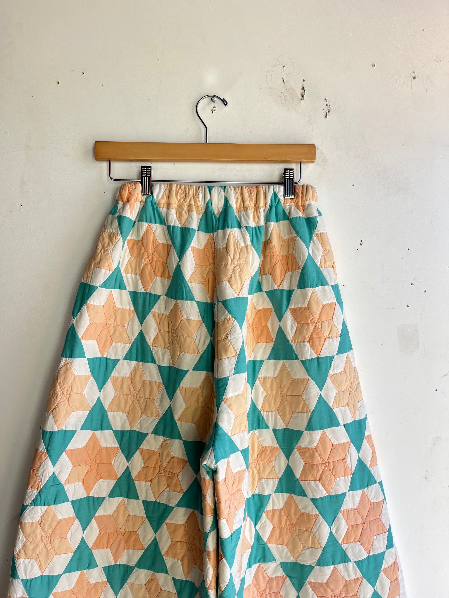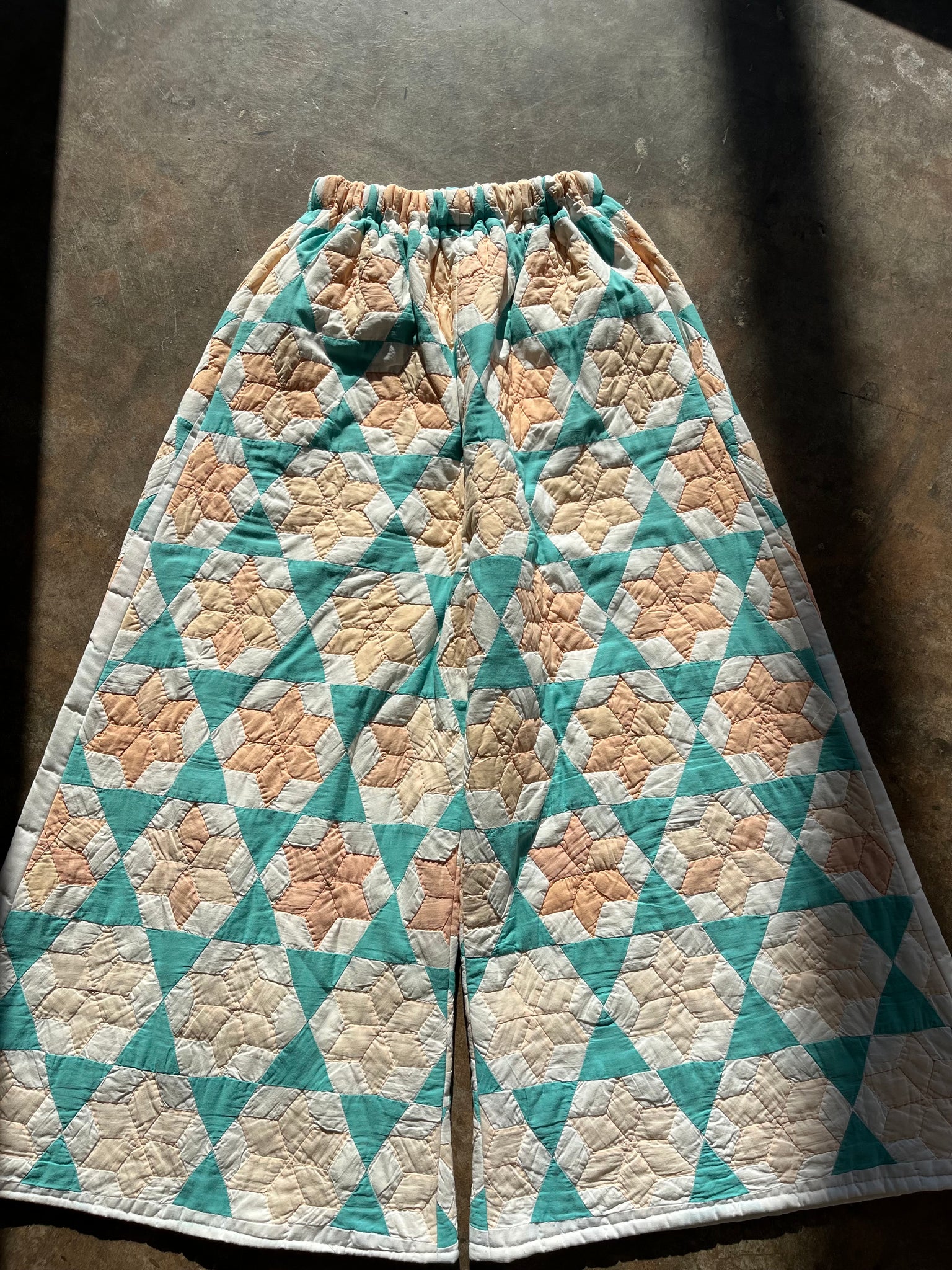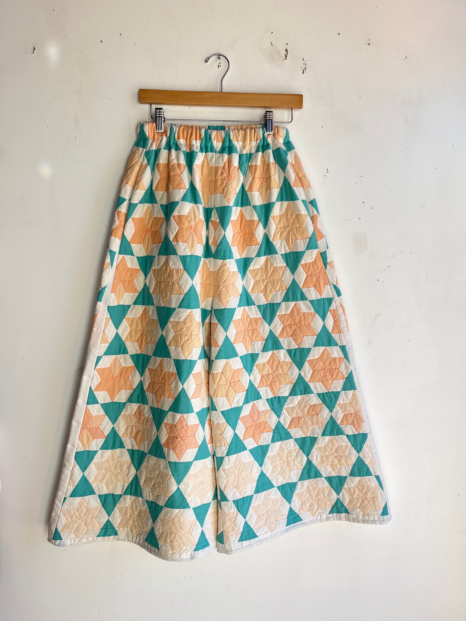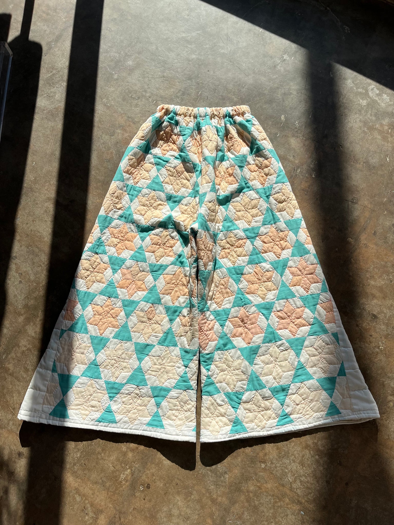 These pants are made from a vintage 6-Point star inside a 6 Point Star Quilt. When it was found, lots of holes, so why not use the good parts for pants:) There is a light batting between the two layers, but I would say this a light weight quilt. Judging by the fabric, style, and that it is all hand stitched, I would say this is from the 1950s. This pant is made from a vintage palazzo pant pattern and features a super wide leg and elastic waist band to fit a variety of sizes. It also has inseam pockets for maximum comfort and utility :)