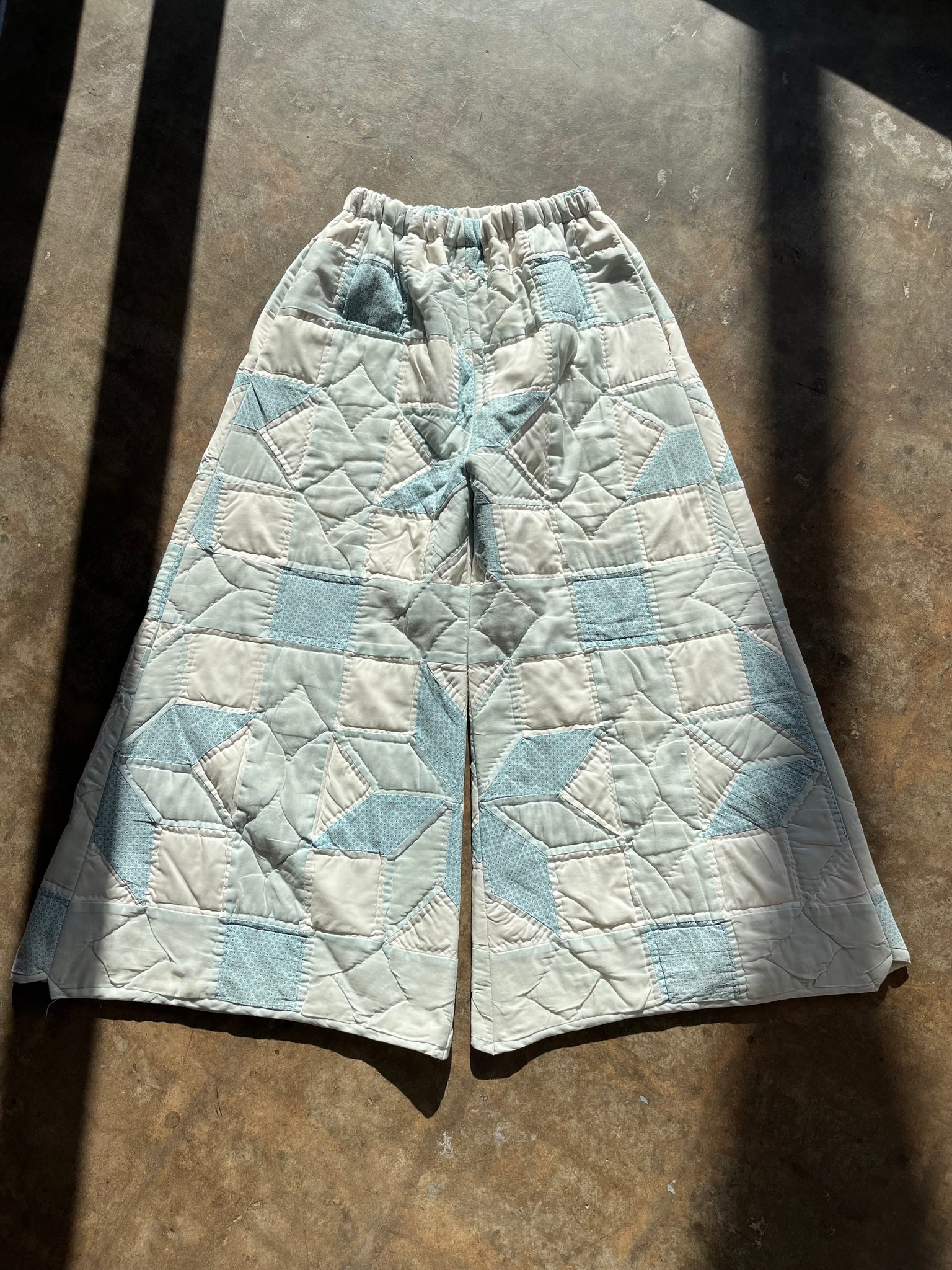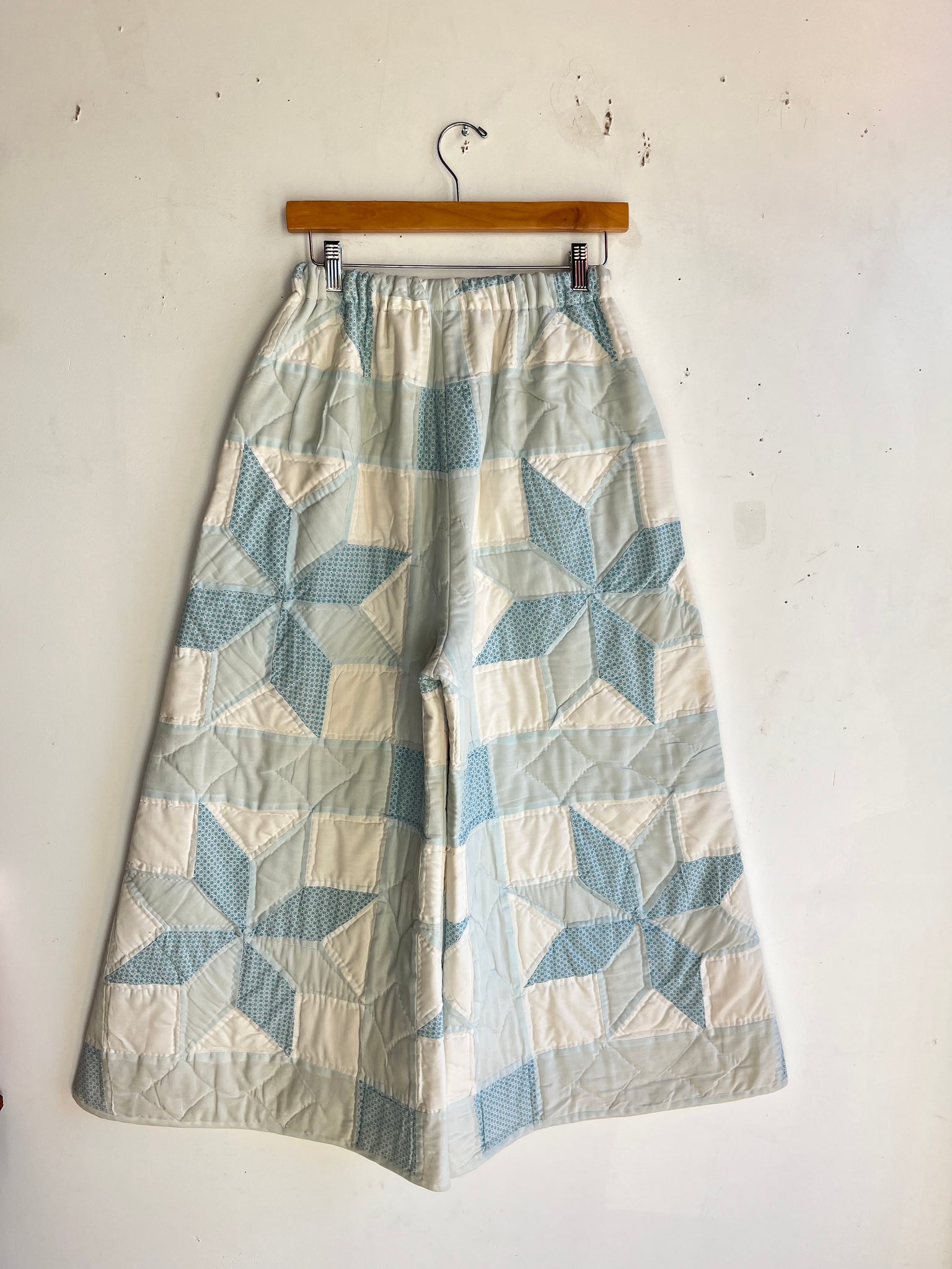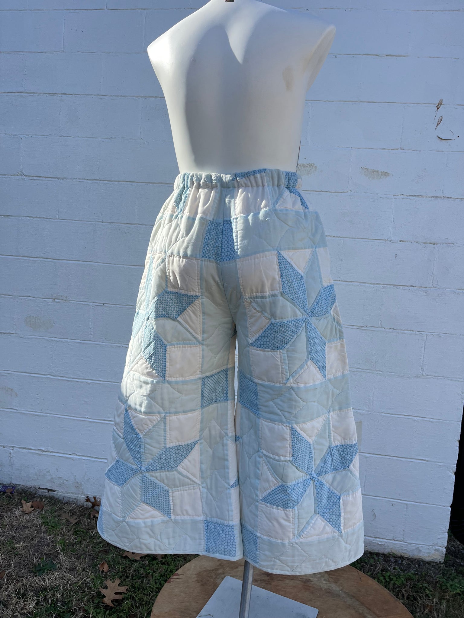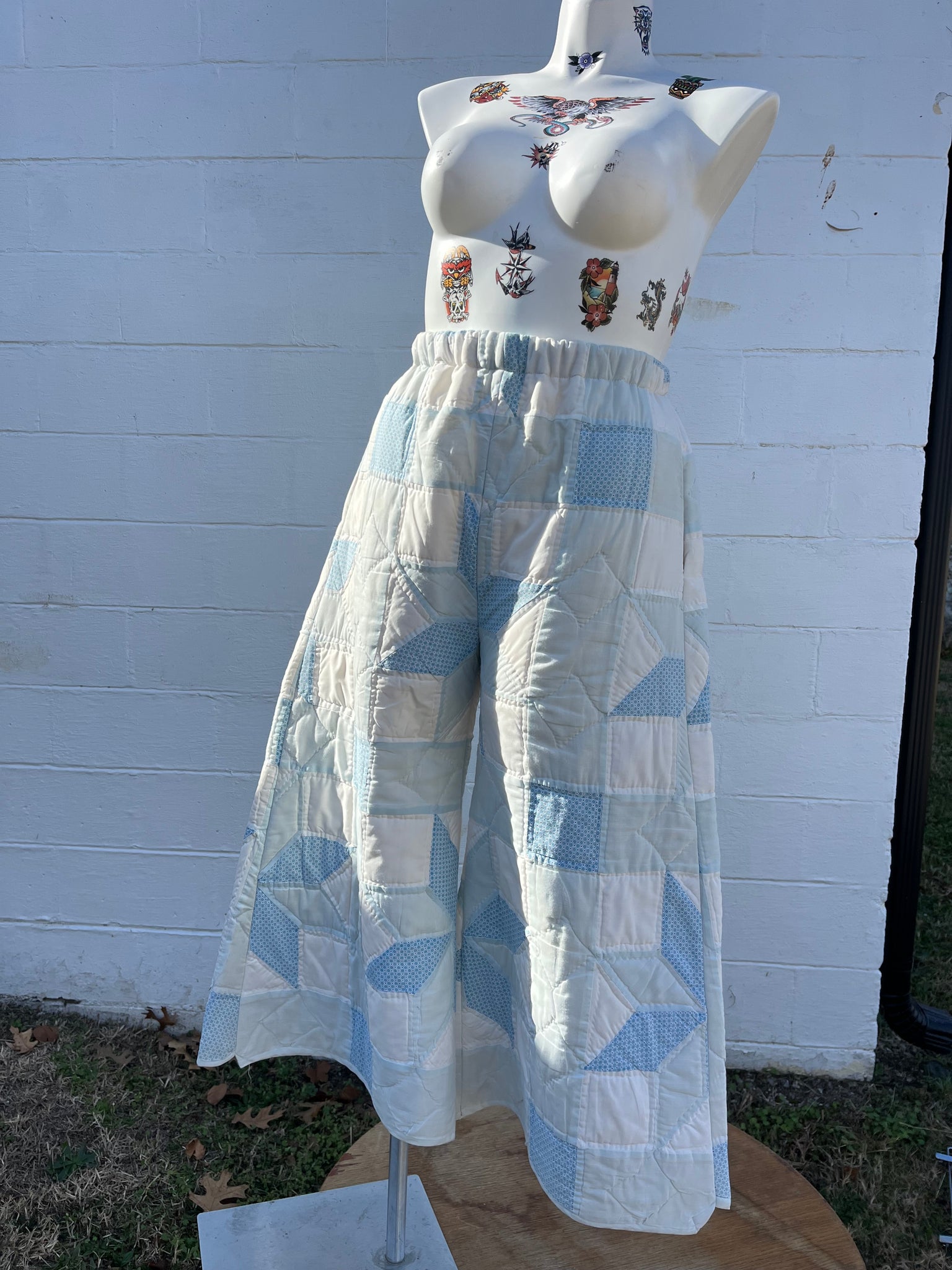 These pants are made from a vintage 8 point star quilt. When it was found, it had lots of fabric separations, so why not use the good parts for pants:) There is a light batting between the two layers, but I would say this a light weight quilt. Judging by the fabric, style, and that it is all hand stitched, I would say this is from the 1970s. This pant is made from a vintage palazzo pant pattern and features a super wide leg and elastic waist band to fit a variety of sizes. It also has inseam pockets for maximum comfort and utility :)