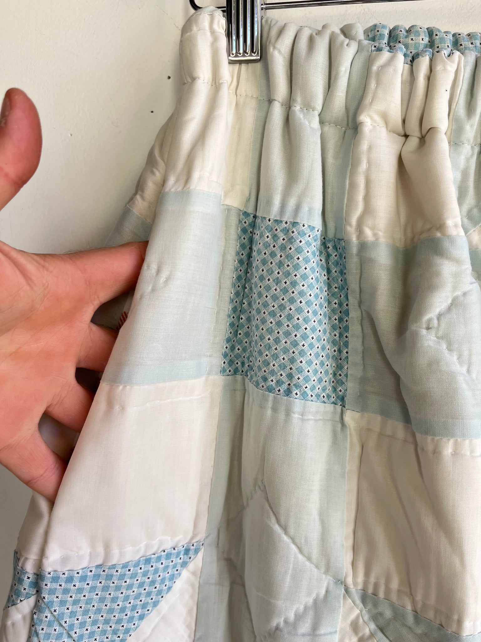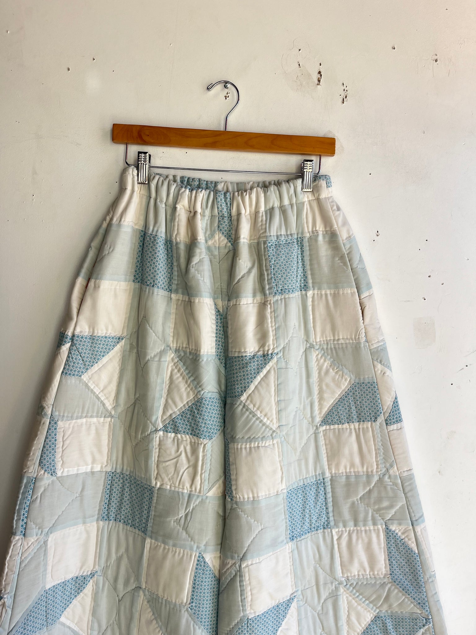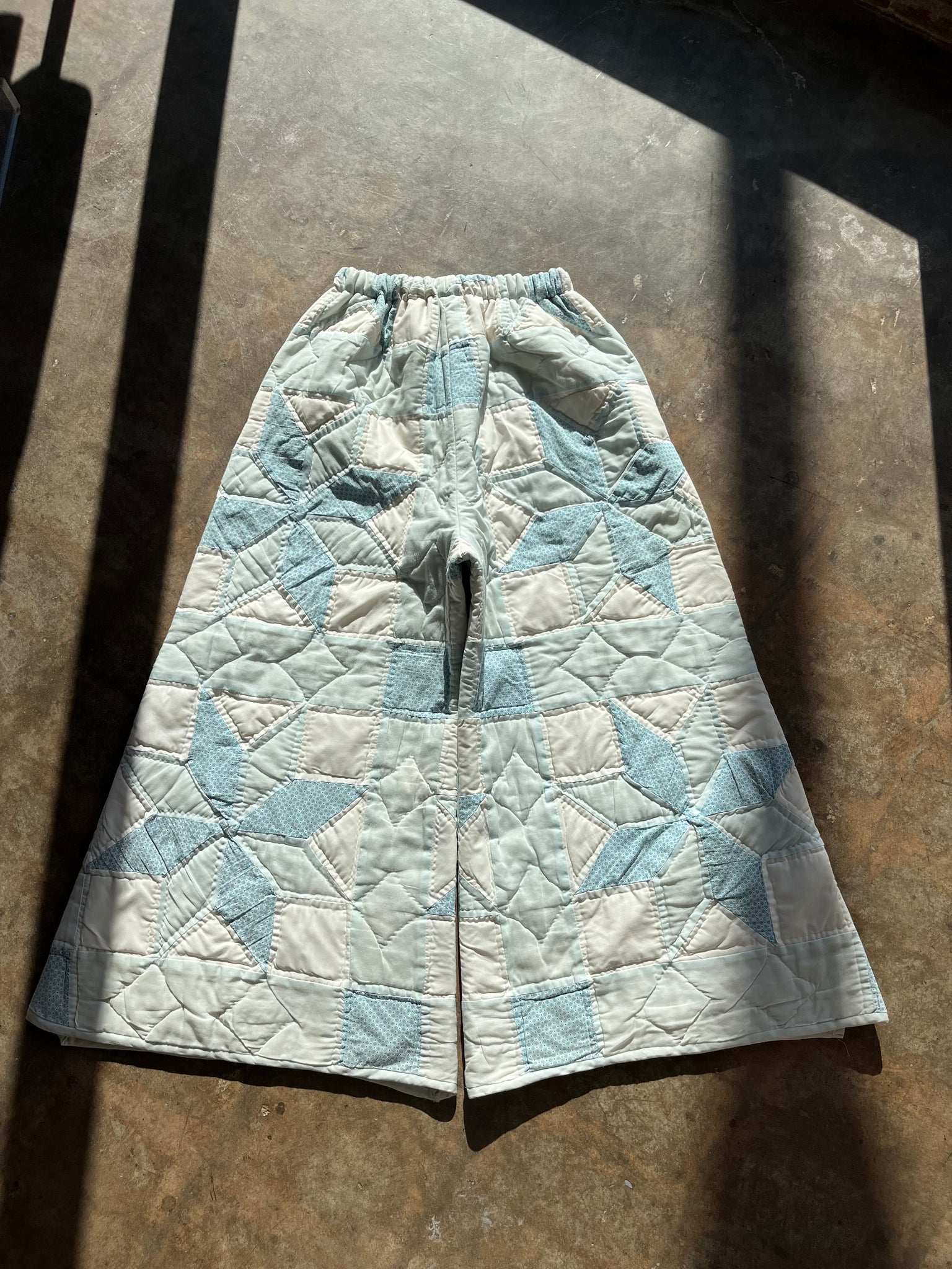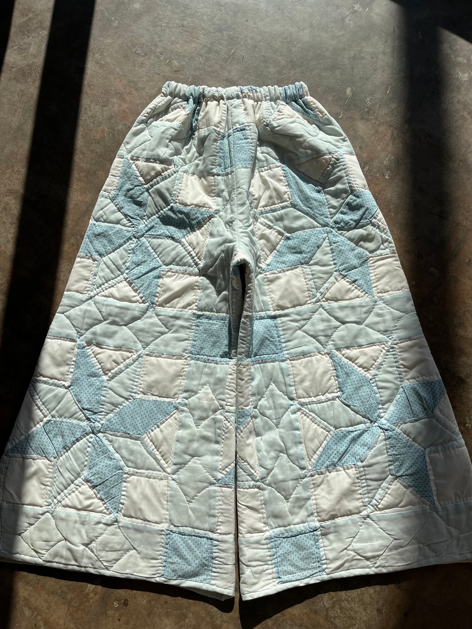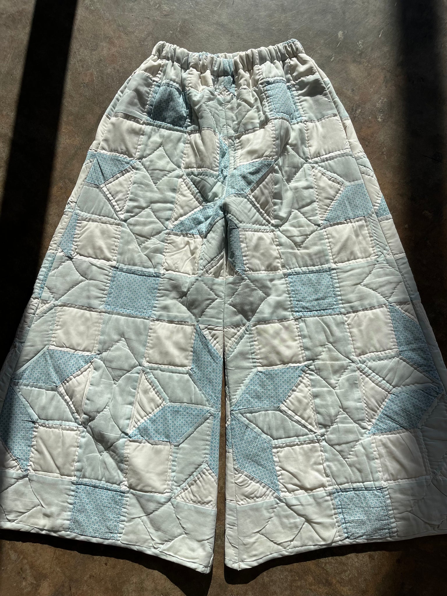 These pants are made from a vintage 8 point star quilt. When it was found, it had lots of fabric separations, so why not use the good parts for pants:) There is a light batting between the two layers, but I would say this a light weight quilt. Judging by the fabric, style, and that it is all hand stitched, I would say this is from the 1970s. This pant is made from a vintage palazzo pant pattern and features a super wide leg and elastic waist band to fit a variety of sizes. It also has inseam pockets for maximum comfort and utility :)