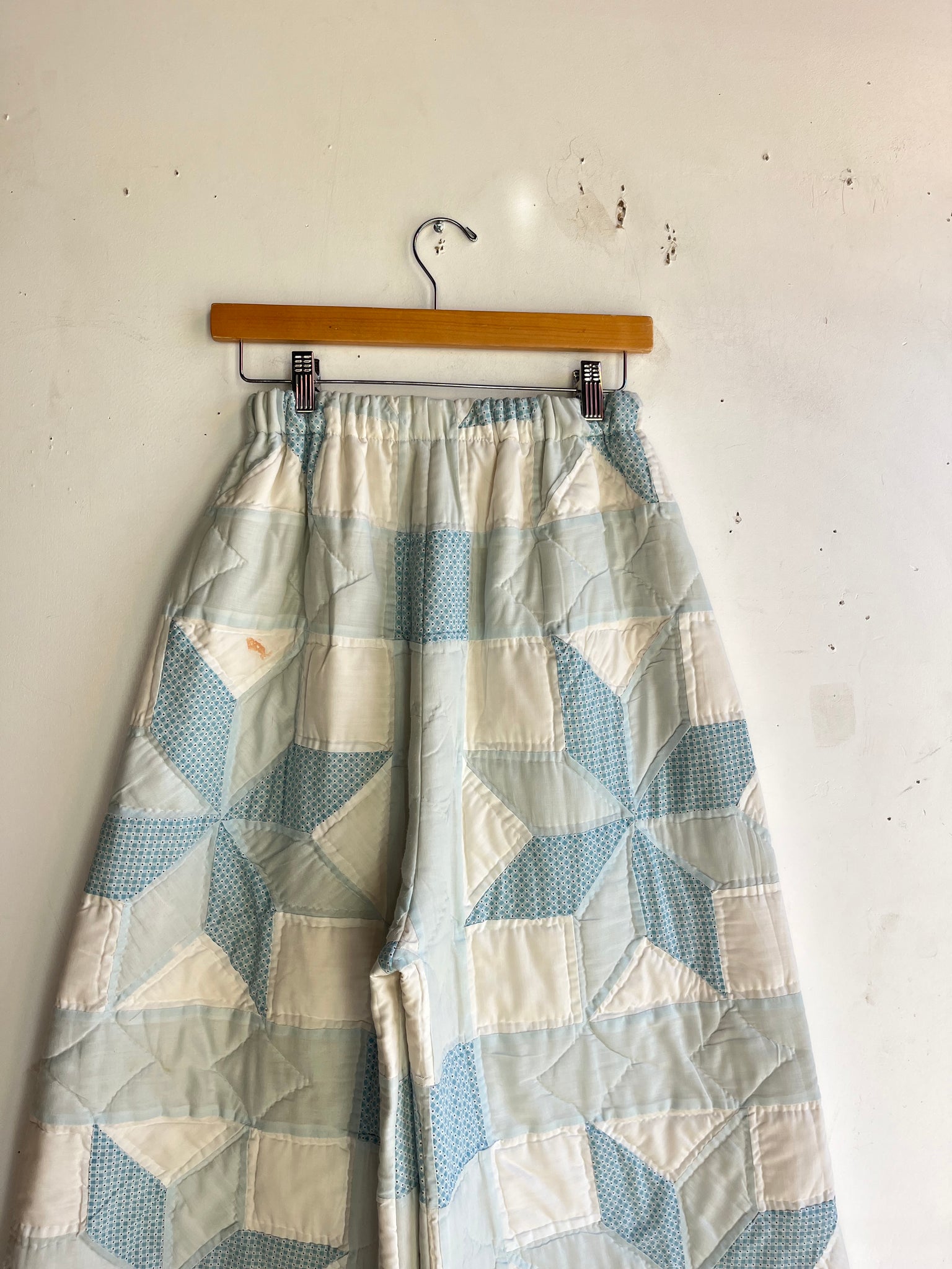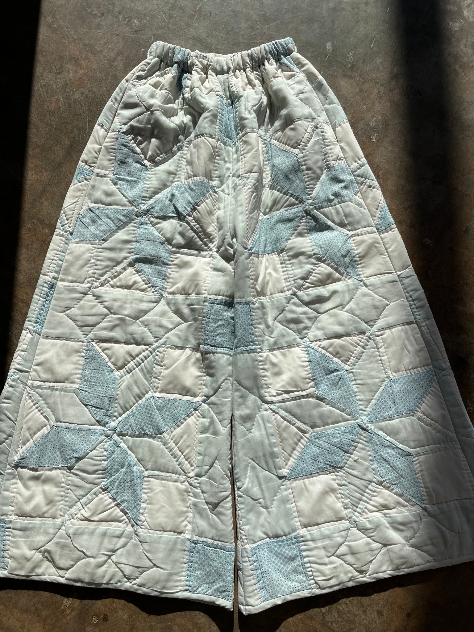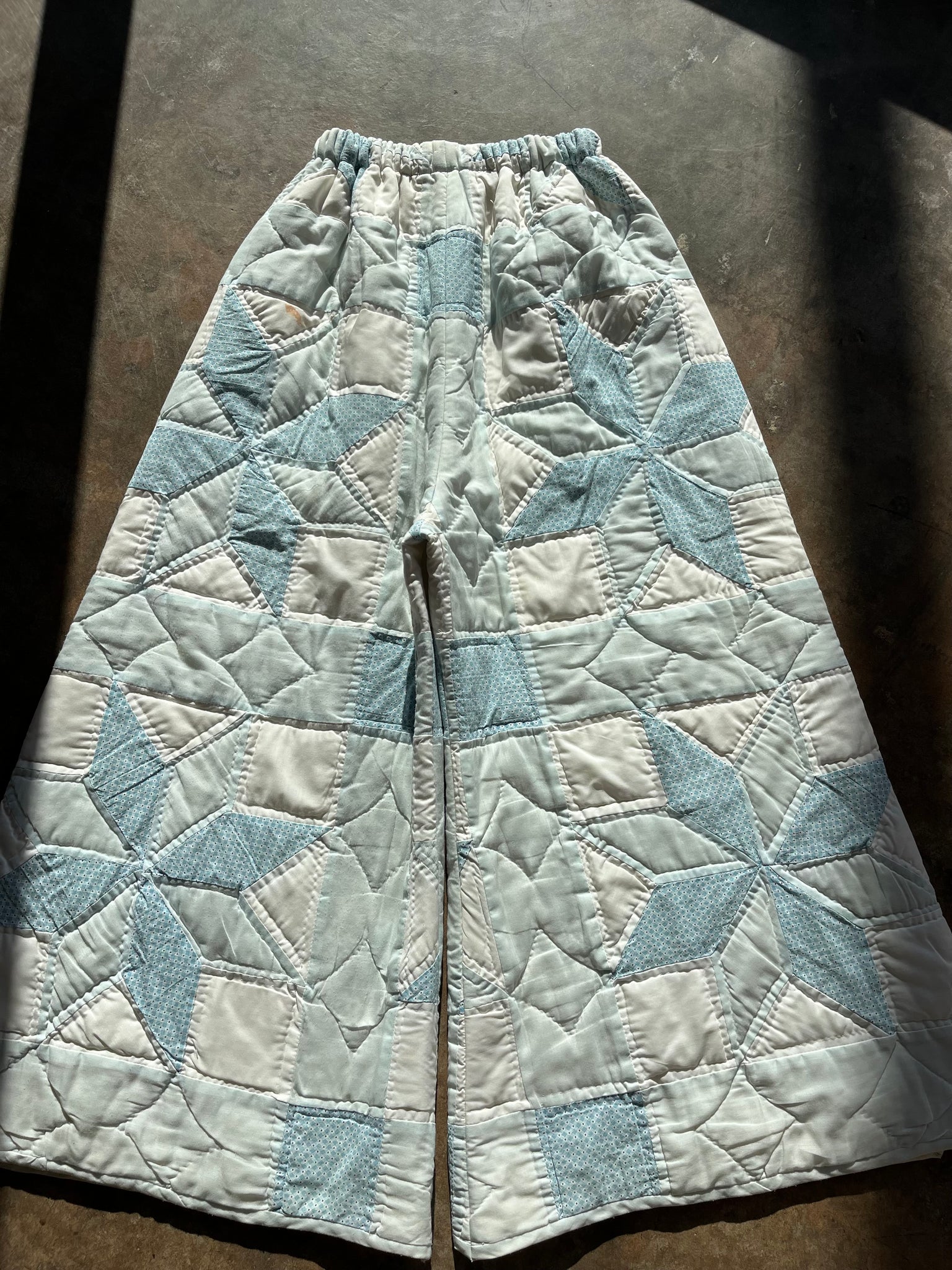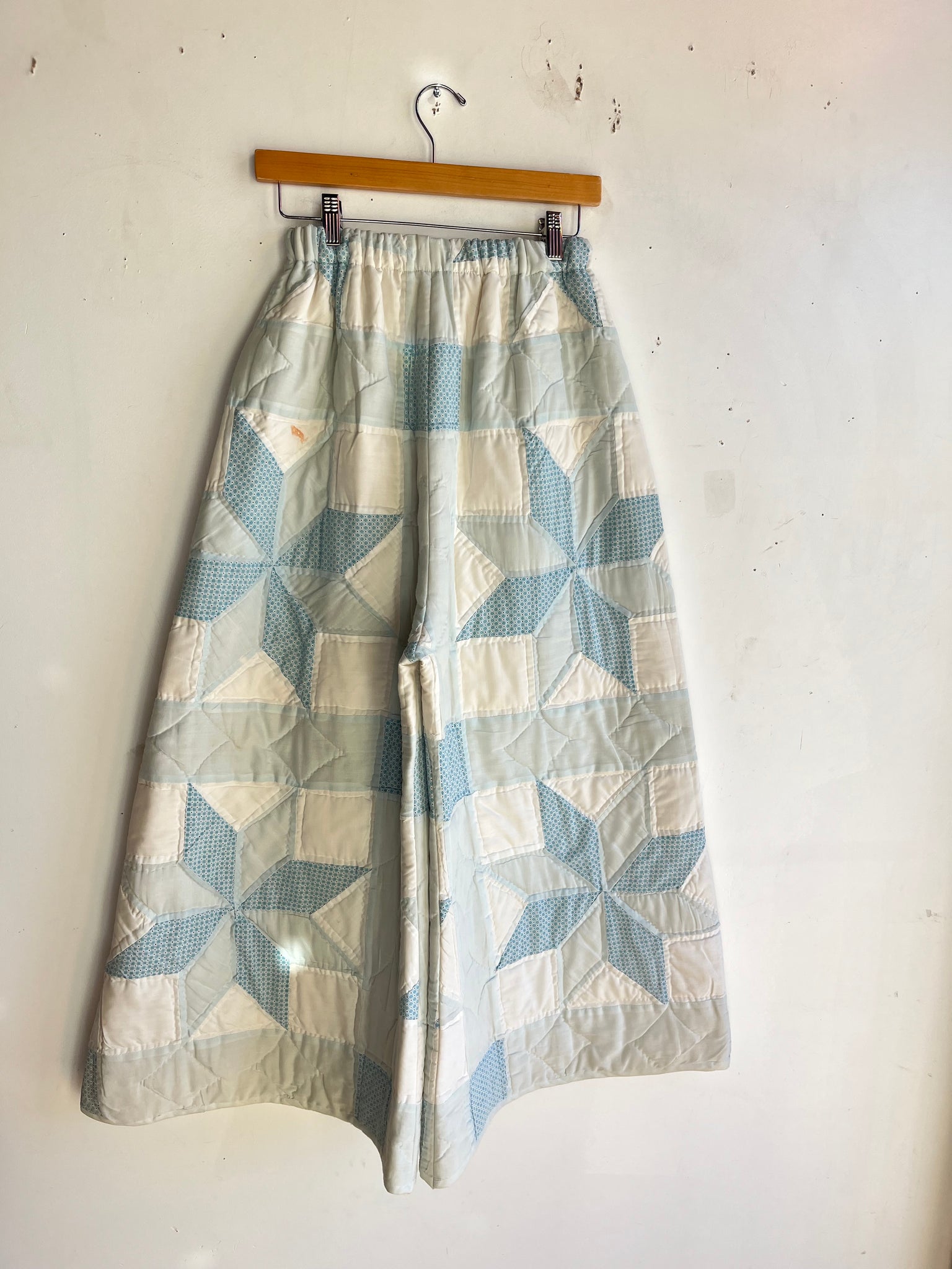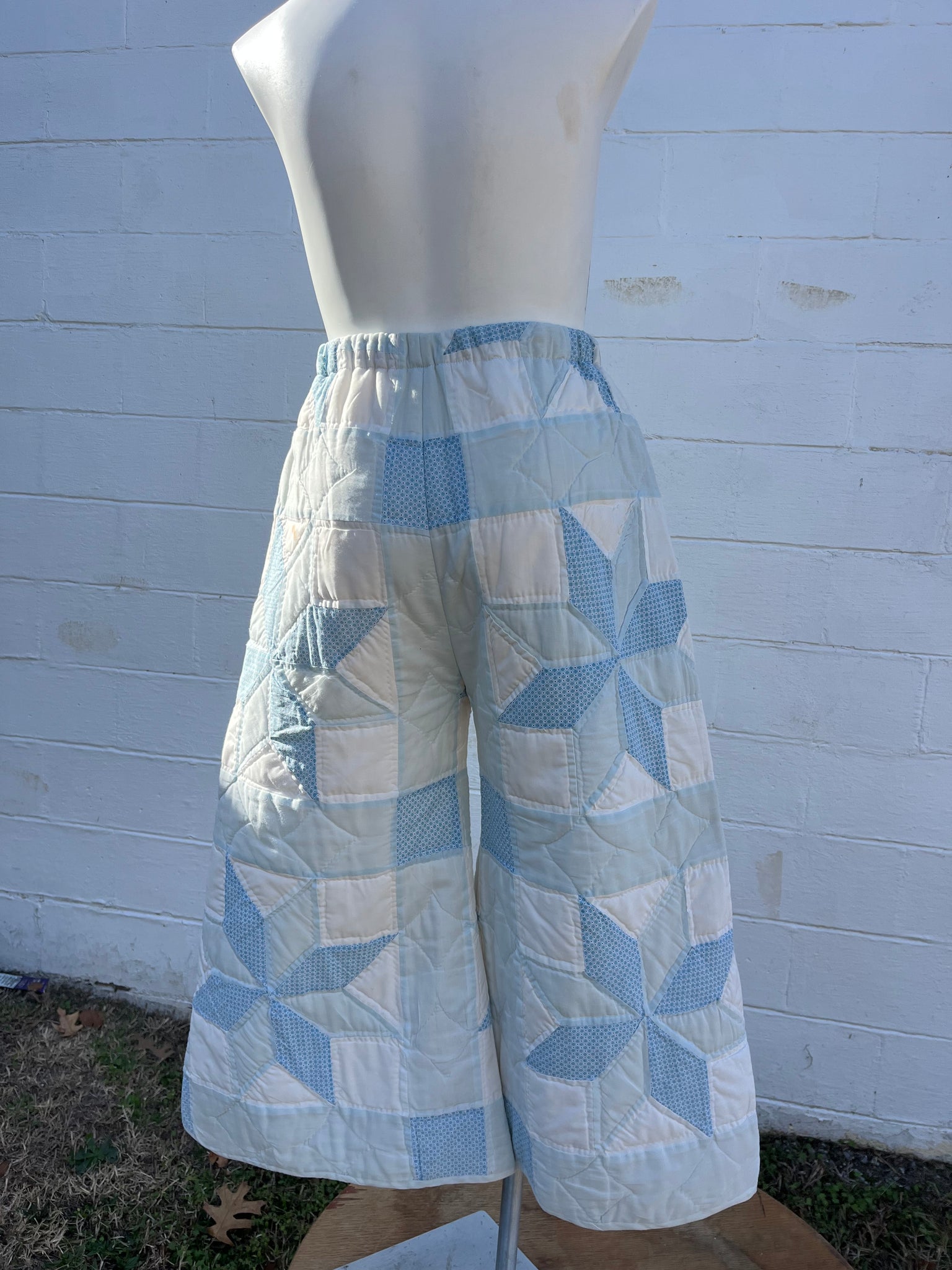 These pants are made from a vintage 8 point star quilt. When it was found, it had lots of fabric separations, so why not use the good parts for pants:) There is a light batting between the two layers, but I would say this a light weight quilt. Judging by the fabric, style, and that it is all hand stitched, I would say this is from the 1970s. This pant is made from a vintage palazzo pant pattern and features a super wide leg and elastic waist band to fit a variety of sizes. It also has inseam pockets for maximum comfort and utility :)