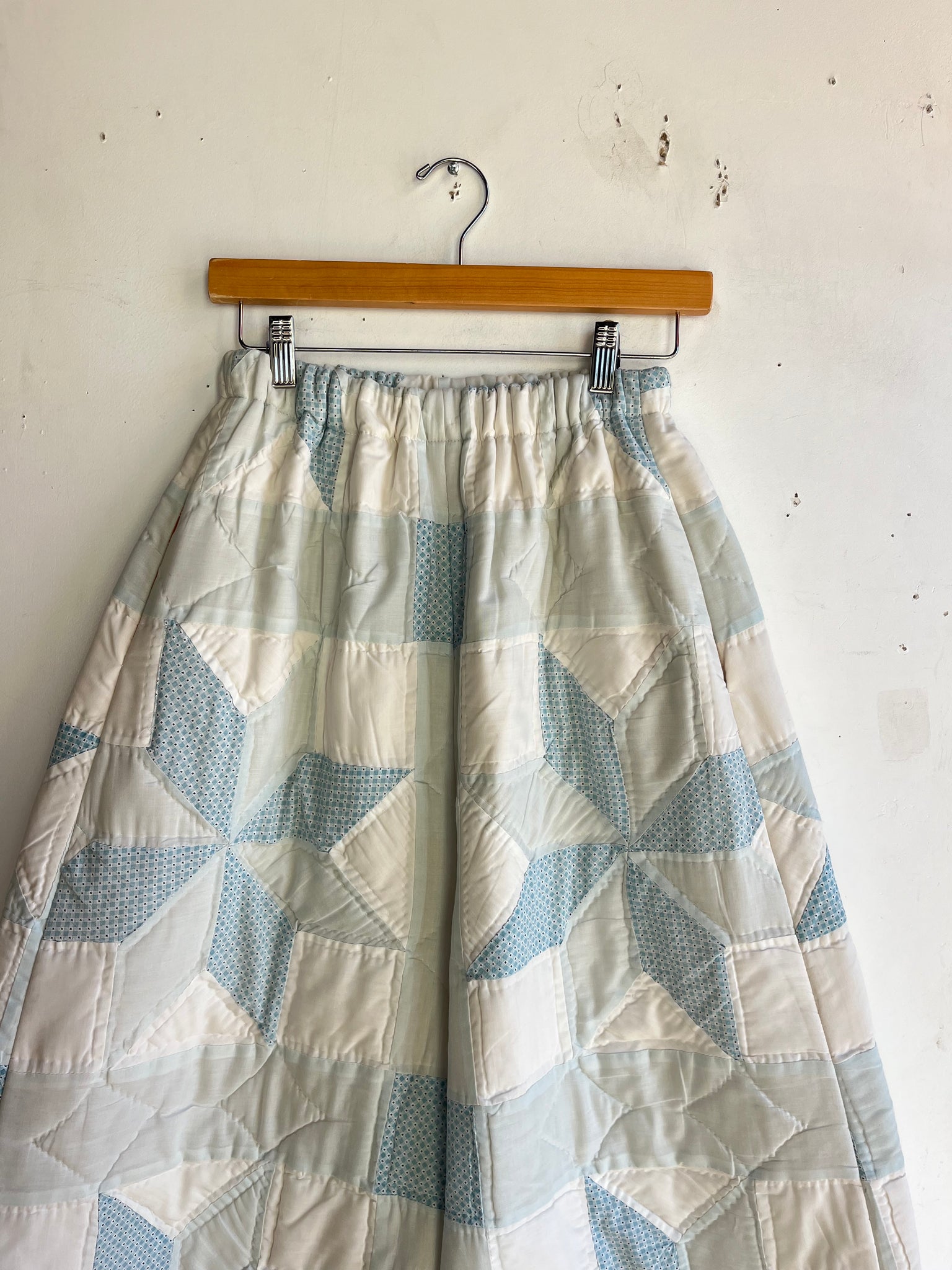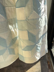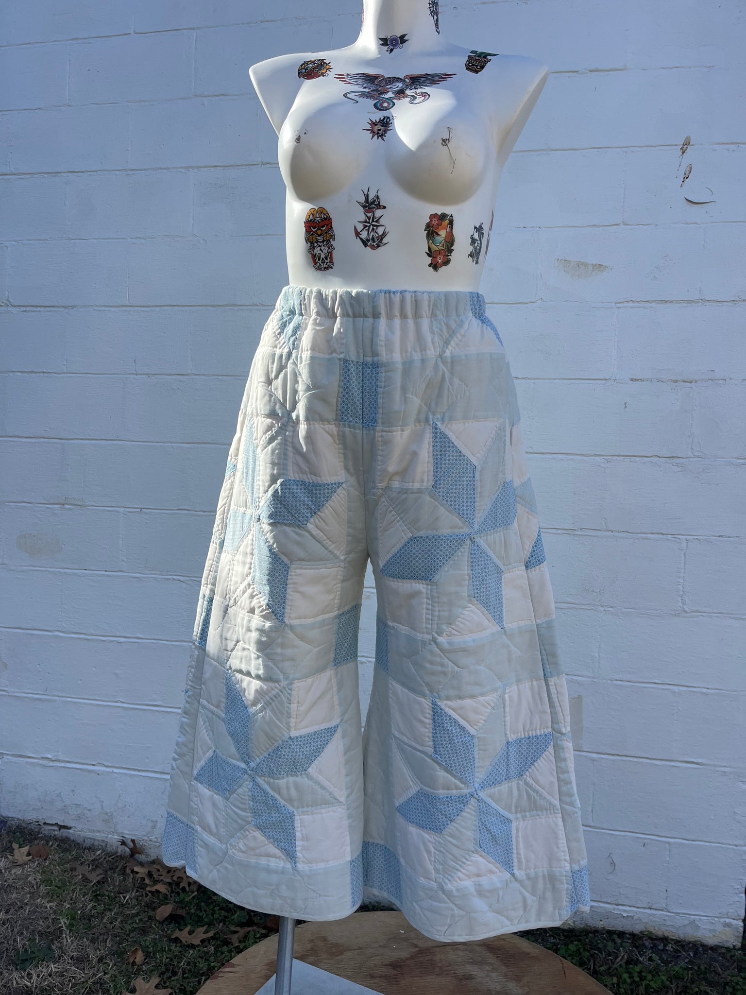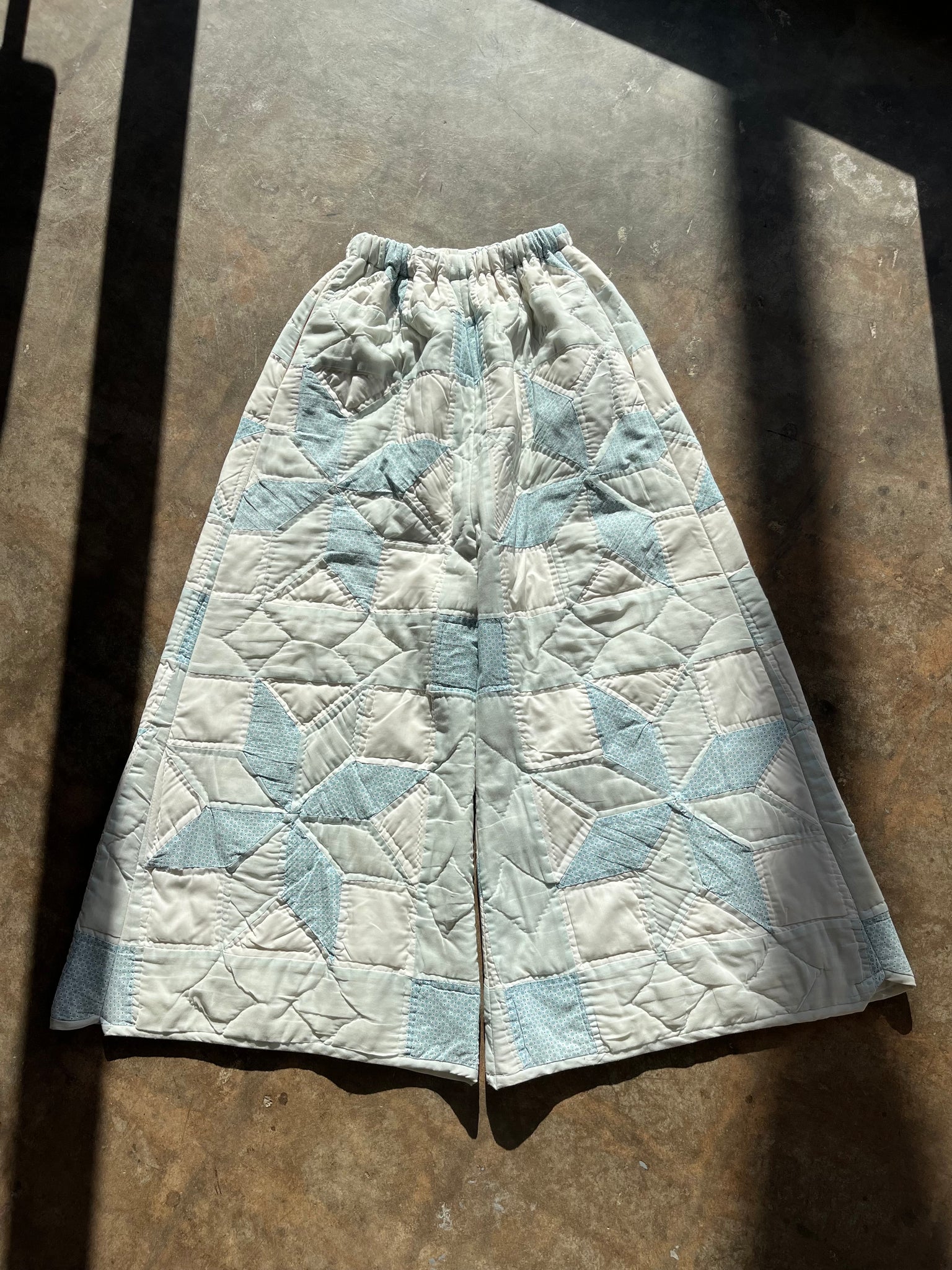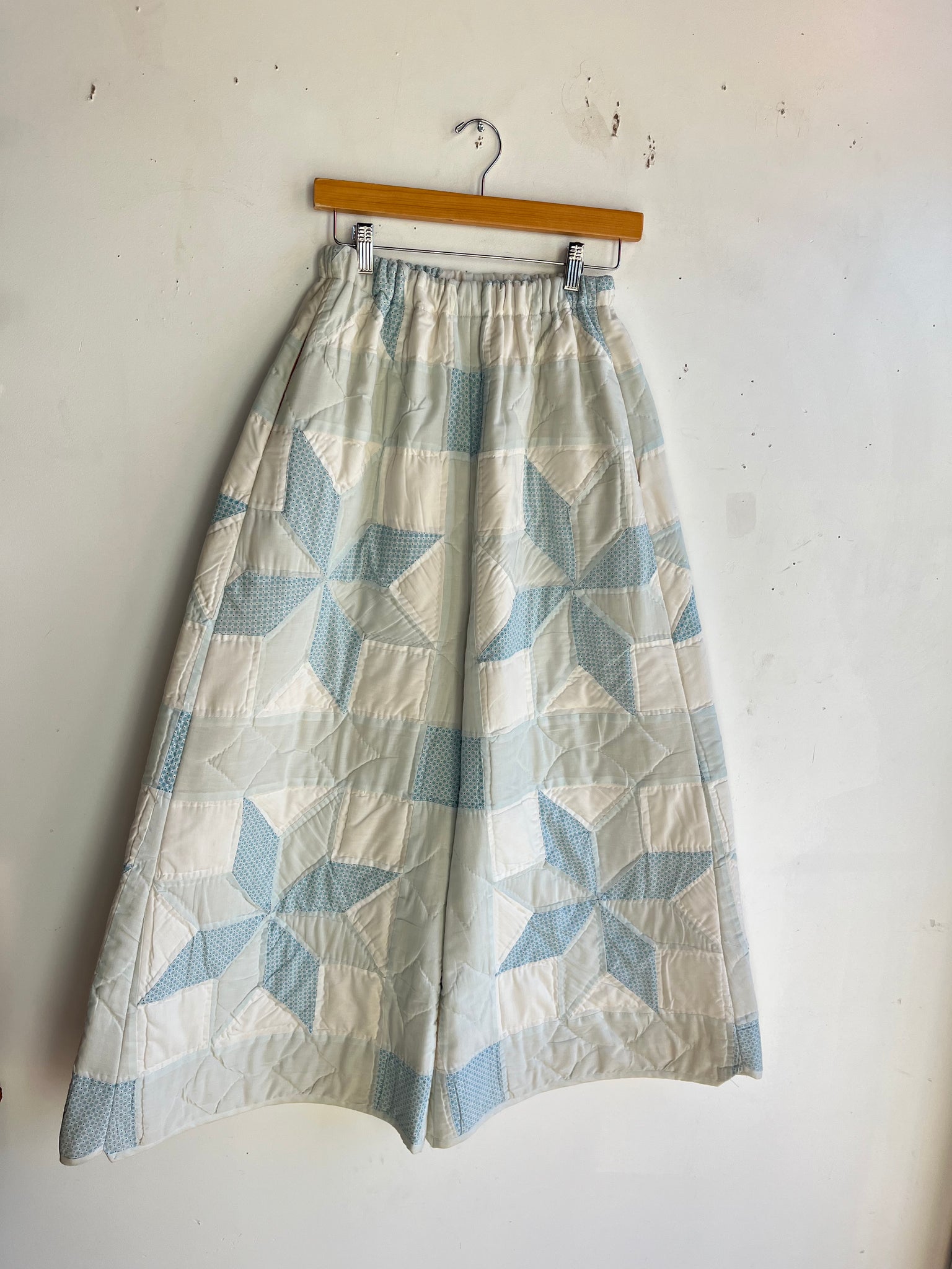 These pants are made from a vintage 8 point star quilt. When it was found, it had lots of fabric separations, so why not use the good parts for pants:) There is a light batting between the two layers, but I would say this a light weight quilt. Judging by the fabric, style, and that it is all hand stitched, I would say this is from the 1970s. This pant is made from a vintage palazzo pant pattern and features a super wide leg and elastic waist band to fit a variety of sizes. It also has inseam pockets for maximum comfort and utility :)
