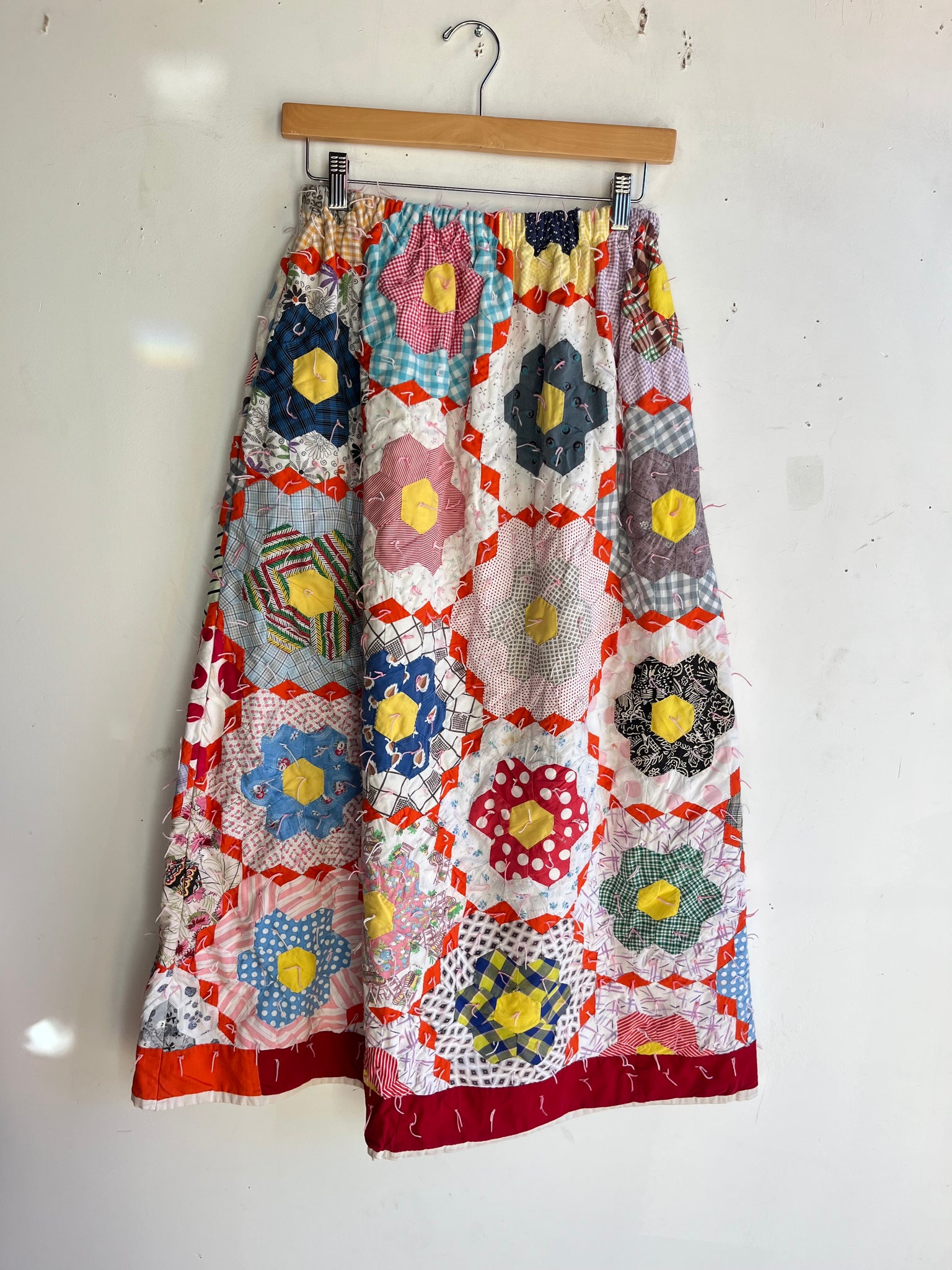 These pants are made from a vintage Grandmother's Flower Garden quilt. When it was found, lots of holes and fabric separations, so why not use the good parts for a skirt:) There is a light batting between the two layers (I believe its a linen tablecloth), so I would say this a light weight quilt. Judging by the fabric, style, and that it is all hand stitched, so I would say this is from the 1950s possibly older. This skirt is cut in an a-line and has an elastic waistband to fit a variety of sizes. It also has inseam pockets for maximum comfort and utility :).